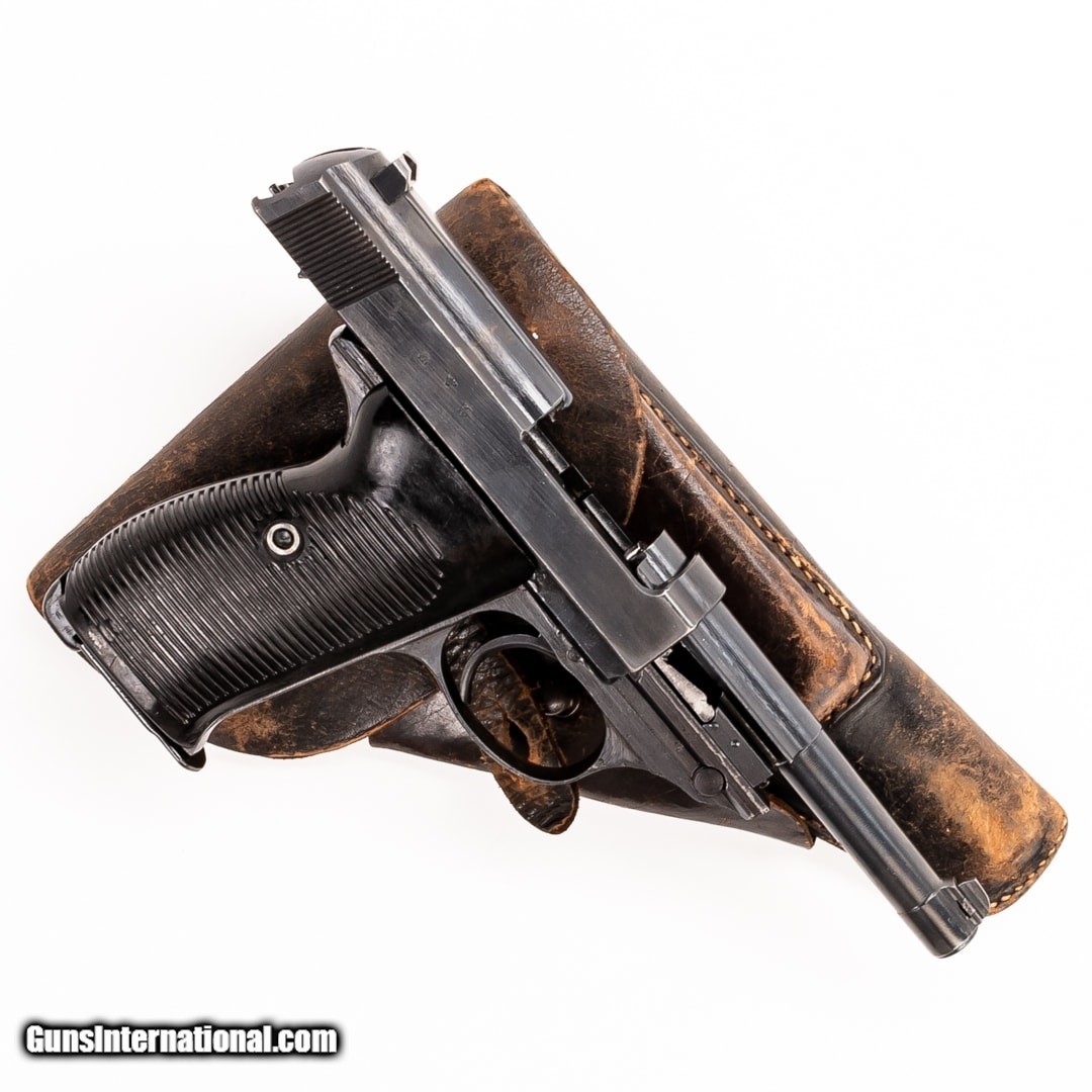 Description: Guns Listing ID: 385786 Collectible, accurate, and ahead of its time, the Walther P38 is a dependable 9mm handgun that saw extensive use during WWII. The design was originally designated P38 but changed to P1 post-war due to Nazi affiliation. This P38 has a safety de-cocker and Nazi markings on the slide. It has been re-blued and comes with one 9-round magazine and a date-matched 1944 leather holster. Serial number: 5537H SOLD Manufacturer: WALTHER Model: P.38 Caliber Info: 9MM LUGER Condition: Used - Certified Barrels: 4.75 BARREL Finish: BLACK |