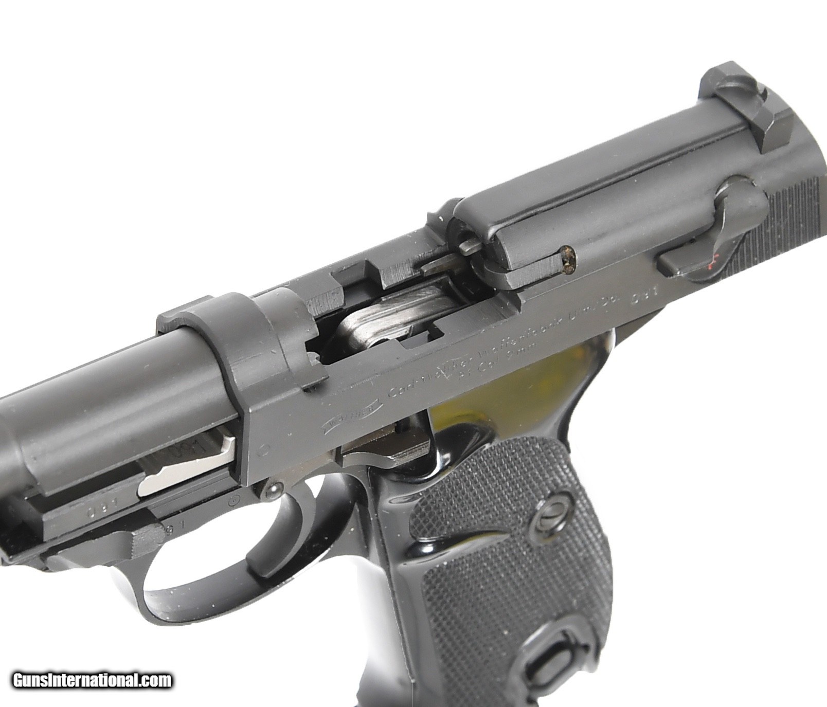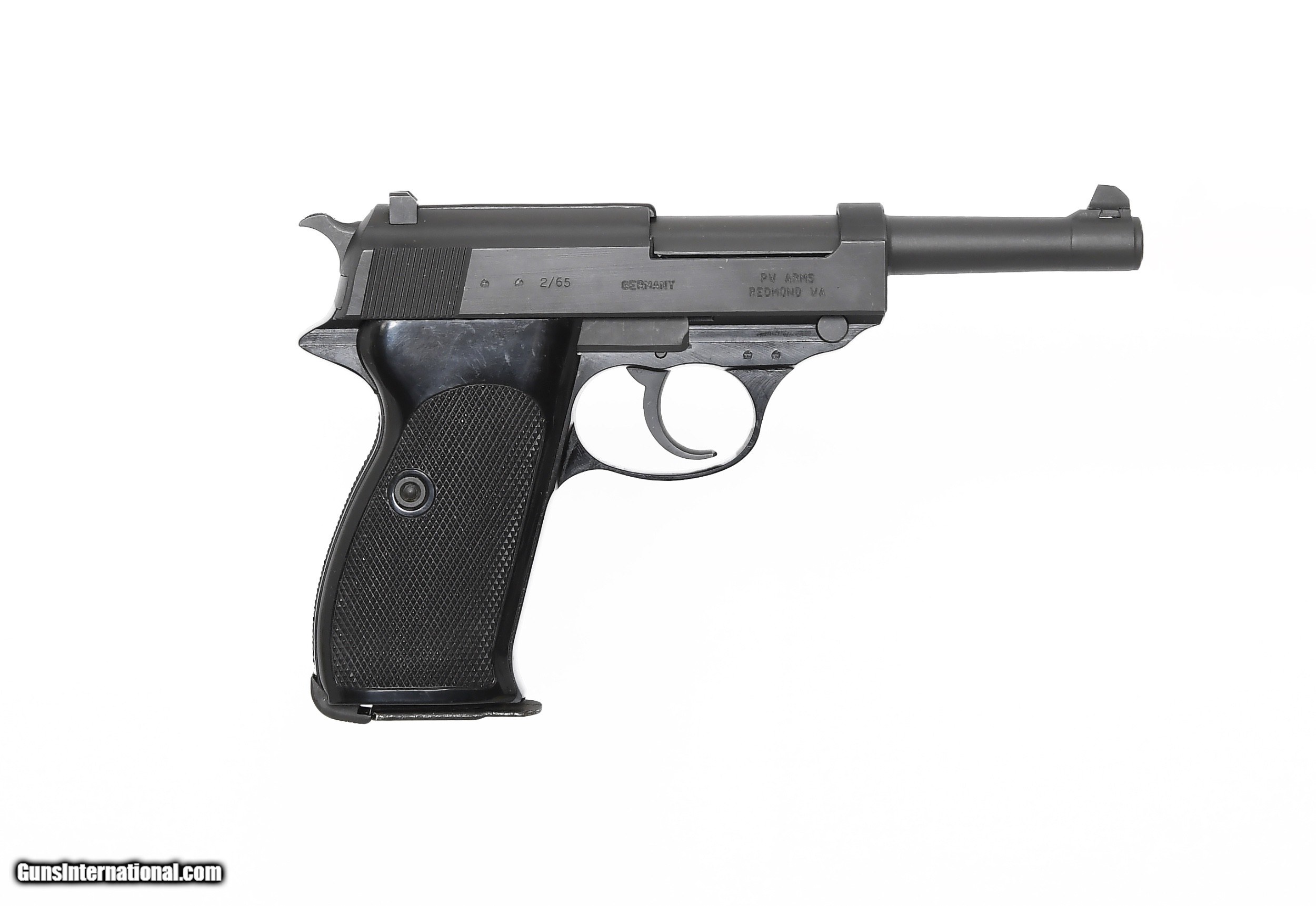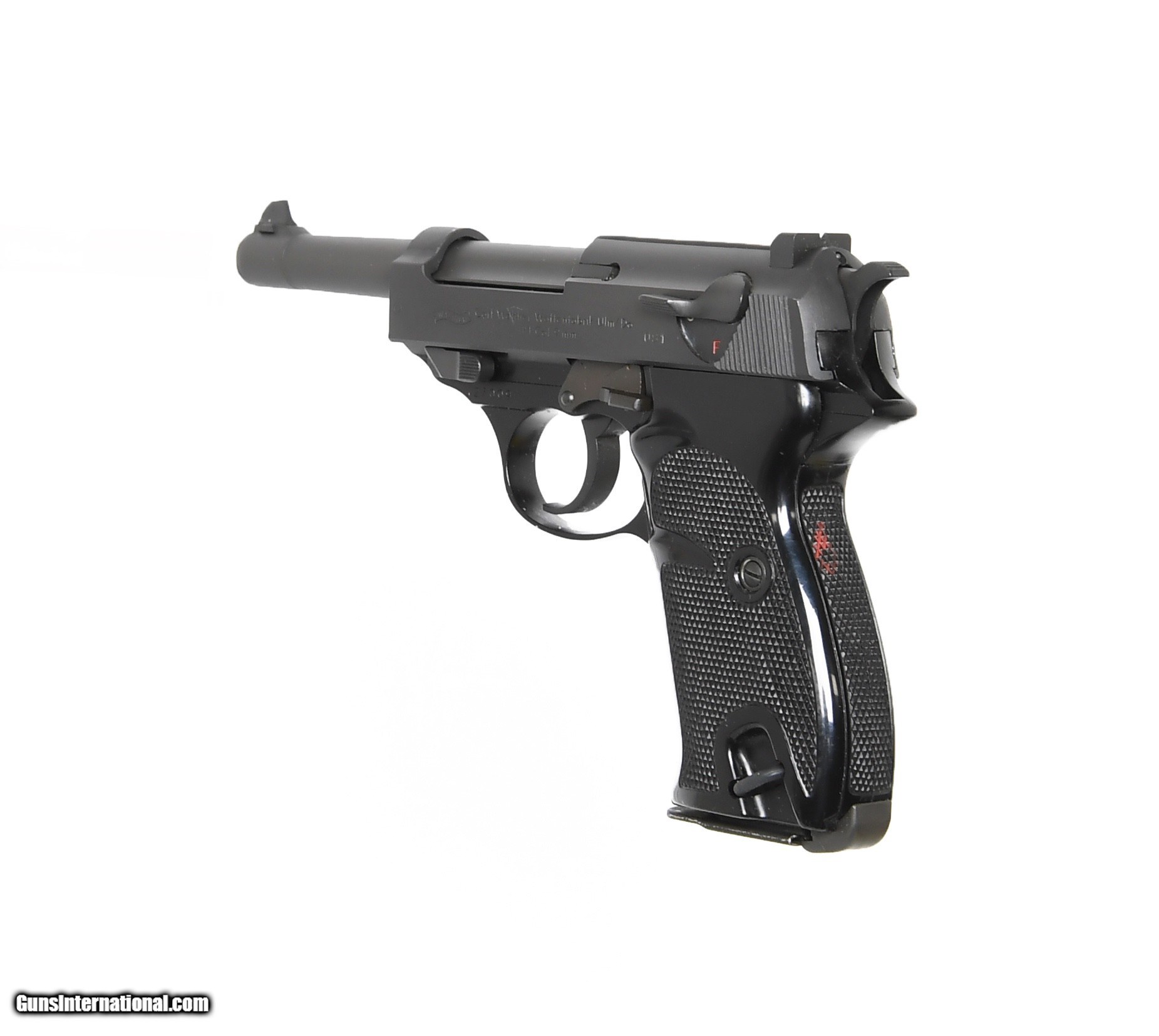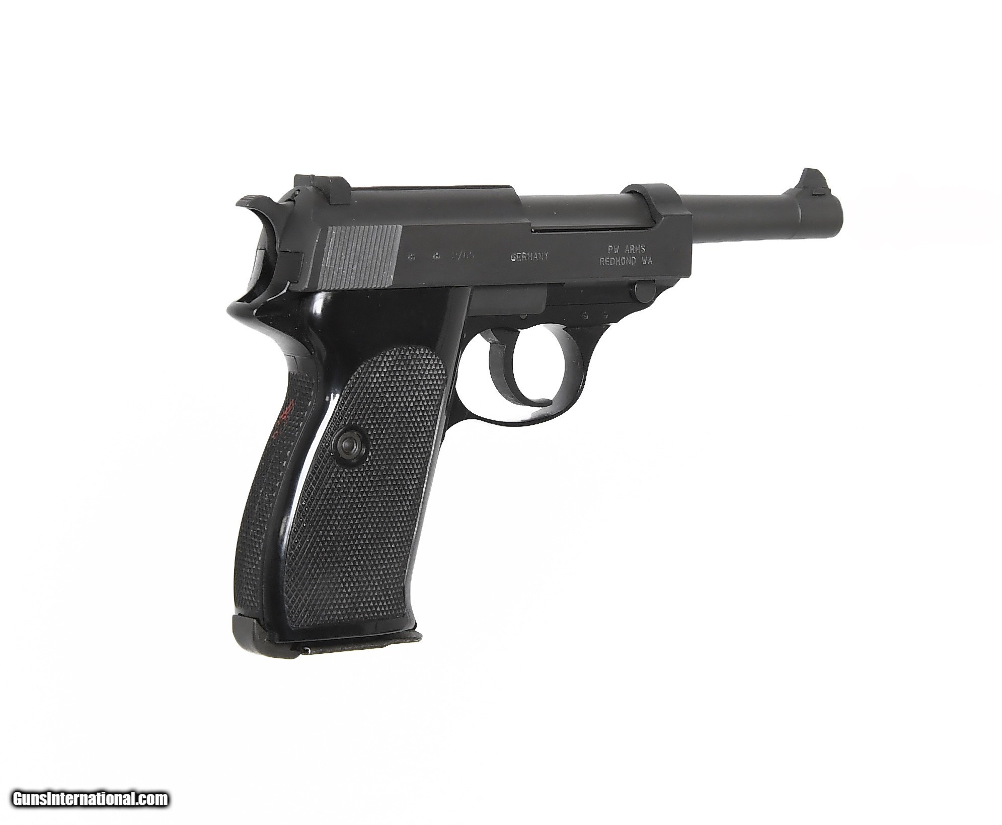 Description: Walther P1 (post WWII version of the venerable P38) semi auto 9mm pistol. 5” barrel. Finished in phosphate (black) with steel upper and alloy frame. Black plastic grips with two magazines and camo holster. Appears unfired but it does have a few very light handling marks..call it 98%+ $700.00 SN: 270091 SOLD |