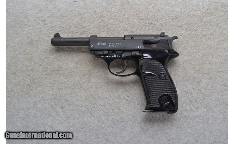 Description: This Walther Model P1 is a double action semi-auto pistol in 9mm Cal. It has a 5 inch barrel with a rear serrated slide. A blade front sight and notch rear sight with white highlights. The grip is a checkered hard black plastic with some handling marks. It comes with a holster and cleaning kit. 9mm Parabellum SOLD Chambers: 7 round magazine. Metal Condition: Very good. Bore Condition: Excellent. Barrels: 5 inch barrel with a rear serrated slide. Triggers: Double Action. Weight: 28 oz. Sights: Blade front. Notch rear. White highlights. Item Location: Richfield, WI |