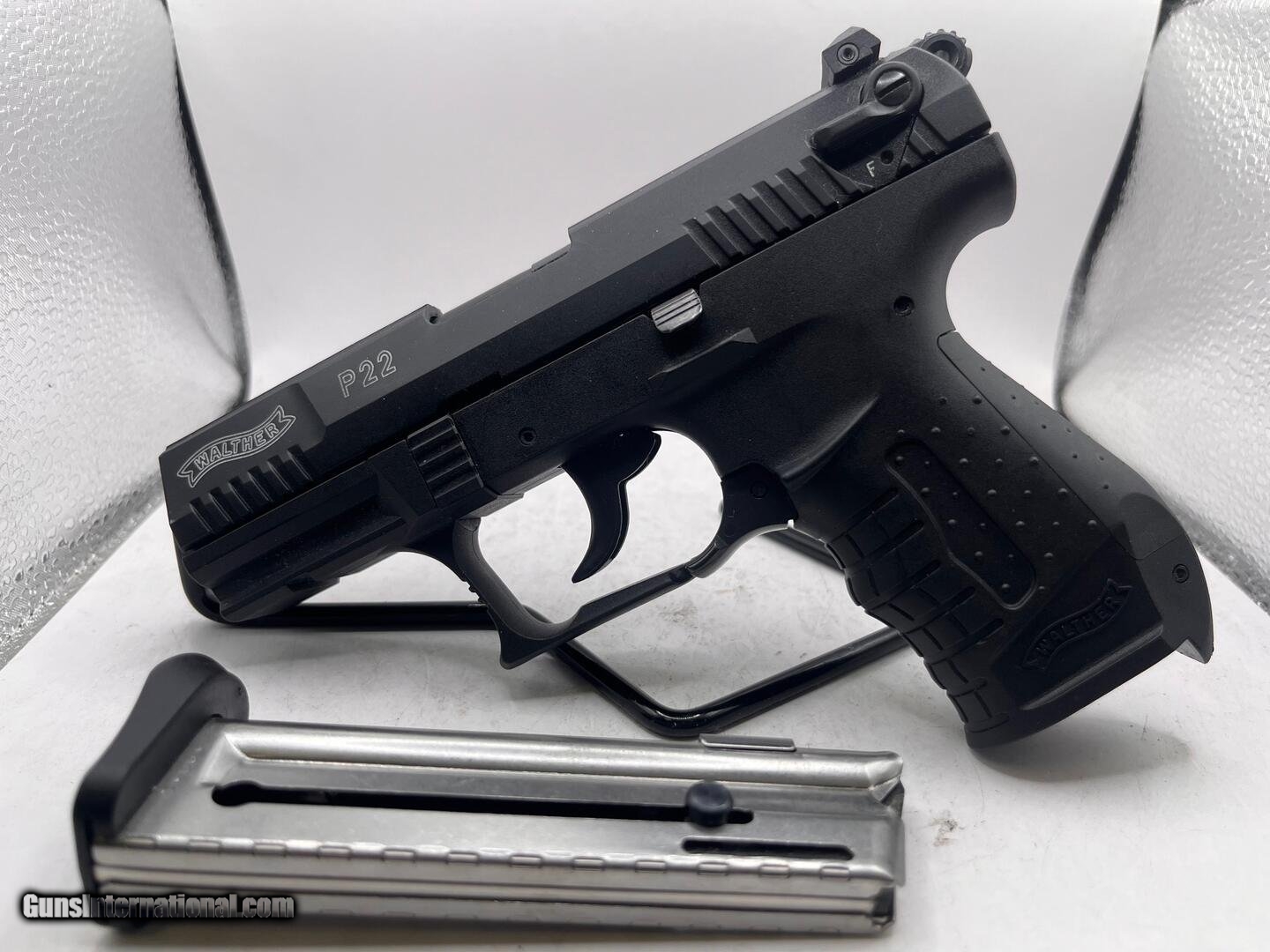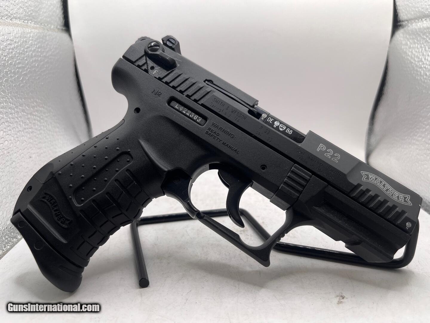Description: Guns Listing ID: 467523 One mag, original case, missing front sight. WALTHER USA Model P22 Semi Auto Pistols Walther 10 + 1 Round 22 Long Rifle w/3.4\" Barrel/Blue Finish The Walther P22 is fascinating in its compact size, while still maintaining all of the features of a full size pistol. Constructed using a modular manufacturing concept, the P22 offers several different equipment configurations. Features include interchangeable backstrap that creates an ideal fit to the shooters hand, compact and lightweight design, traditional double action design, ambidextrous controls for right or left handed shooters, integrated trigger lock and loaded chamber indicator, magazine disconnect, hammer safety and firing pin safety for safe and reliable operation, fixed barrel for incredible accuracy and windage adjustable rear sight and elevation adjustment with interchangeable front sights for variations in shooter operations. SPECIFICATIONS: Mfg Item Num: WAP22003 Category: FIREARMS - HANDGUNS Type :Pistol Action :Single / Double Caliber :22 Long Rifle Barrel Length :3.4\" Capacity :10 + 1 Safety :Ambidextrous Grips :Polymer Sights :3-Dot Adjustable Weight :19.6 oz Finish :Black \"VR\" SOLD Manufacturer: WALTHER Model: P22 Condition: Used - Non-Certified Barrels: 3.42 Gauge Info: .22 LR Finish: black |
