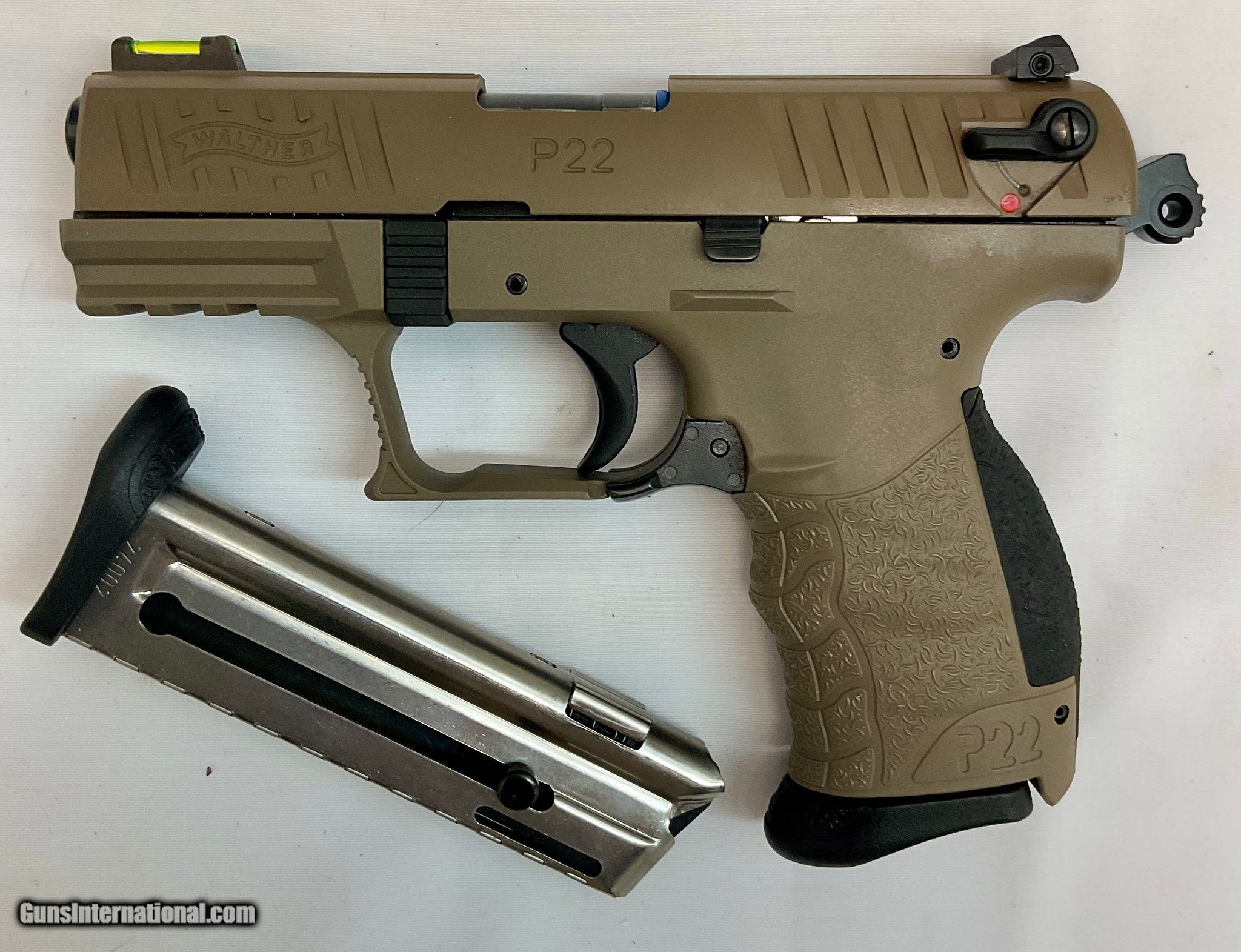 Description: Guns Listing ID: 542485 The Walther P22 is a compact, semi-automatic pistol chambered exclusively in .22 Long Rifle (.22LR). Introduced by Carl Walther GmbH Sportwaffen in 2002, it quickly gained popularity as a plinking, training, and recreational firearm. Here‚s a breakdown of its key features, pros, and cons: Caliber: .22LR (rimfire) Compact Size: It‚s a small and lightweight pistol, typically measuring around 6.3 inches in overall length with a 3.42-inch barrel, and weighing about 17 ounces (unloaded). This makes it comfortable to handle, especially for shooters with smaller hands. Polymer Frame: The P22 utilizes a lightweight polymer frame. Double Action/Single Action (DA/SA) Trigger: This means the first pull of the trigger is heavier (double action), and subsequent shots are lighter (single action). It also features a manual safety. Ambidextrous Controls: The magazine release and slide safety are often ambidextrous, making it user-friendly for both right and left-handed shooters. Adjustable Sights: The P22 typically comes with adjustable open sights, with options for different front sight heights to fine-tune elevation and a windage-adjustable rear sight. Accessory Rail: It includes an accessory rail on the frame for mounting lights or lasers. Threaded Barrel: The barrel is often threaded, allowing for easy attachment of suppressors. SOLD Manufacturer: WALTHER Model: P22 Caliber Info: .22 LR Condition: Used - Non-Certified Barrels: 3.5 BARREL Action: SEMI AUTOMATIC Finish: fde |