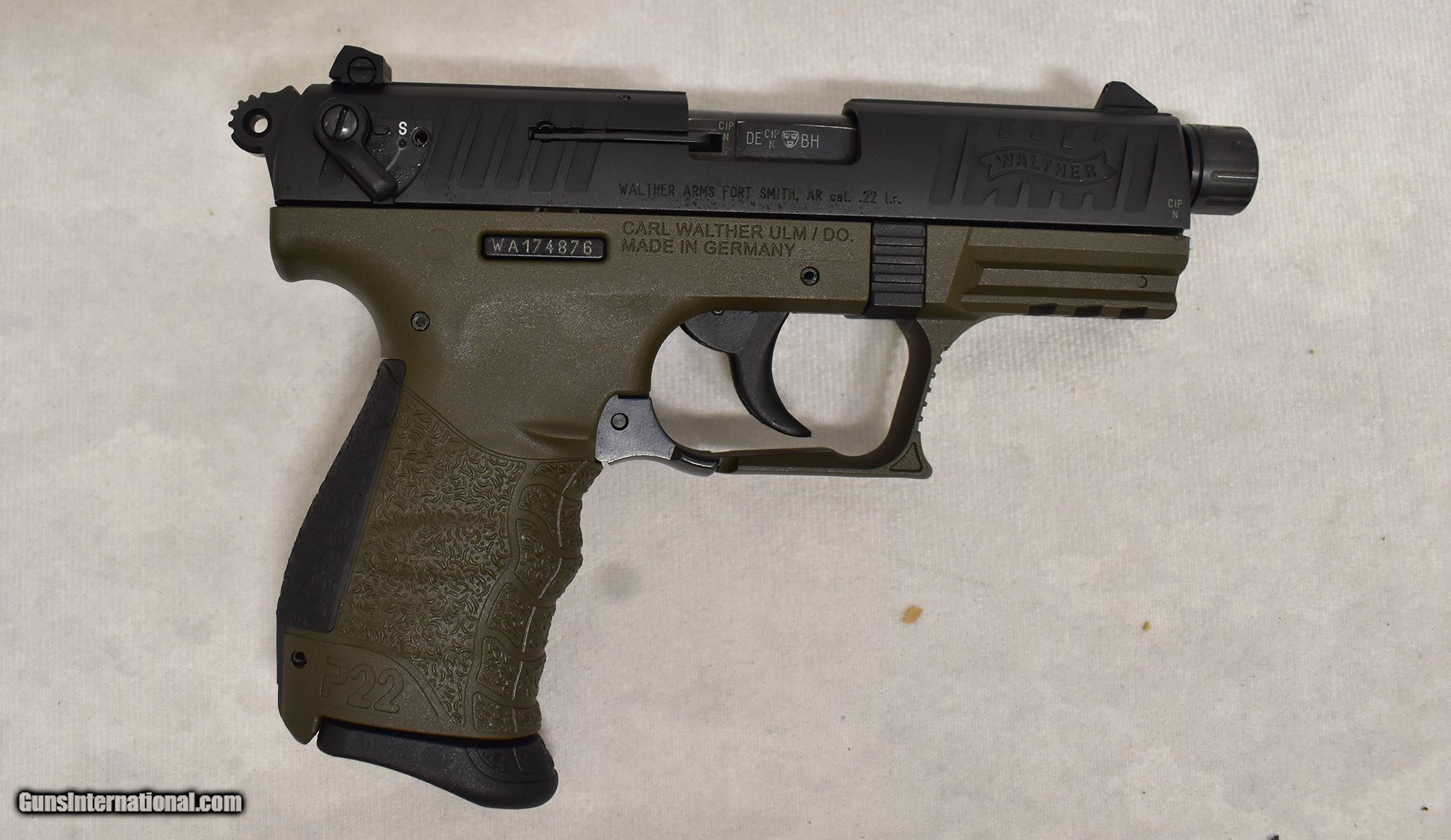 Description: Walther ~ P22 CA ~ .22 Long Rifle .22 Long Rifle SOLD Chambers: .22/5.56mm Metal Condition: Very good Wood Condition: n/a Bore Condition: Very good Barrels: 4.0 Triggers: 3 Lbs Stock Dimensions: n/a Fore End: Threaded Butt Pad: n/a Weight: 2 lbs Sights: Iron Chokes: n/a Item Location: Colorado Springs, CO |