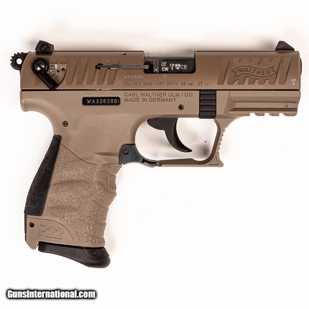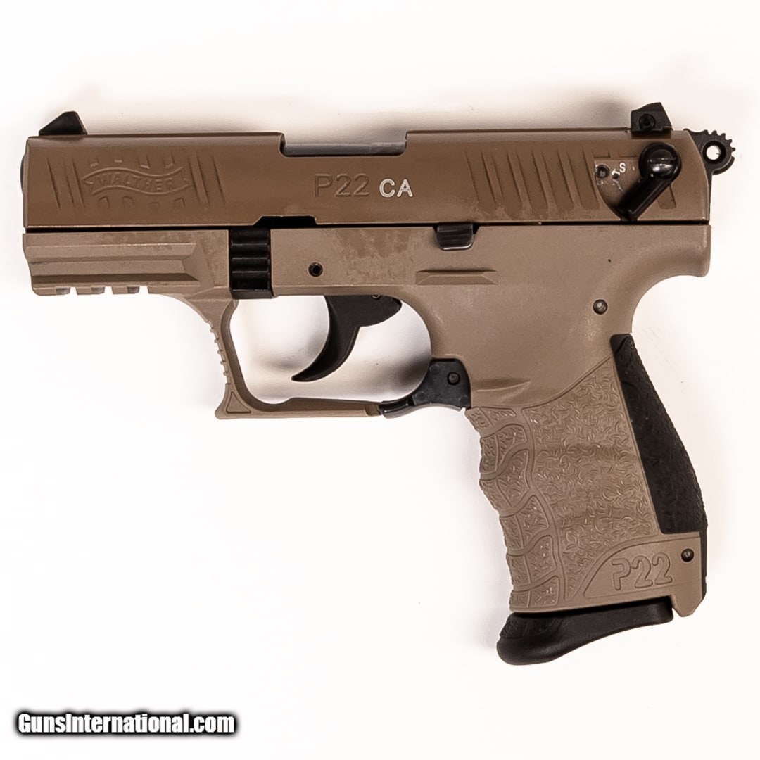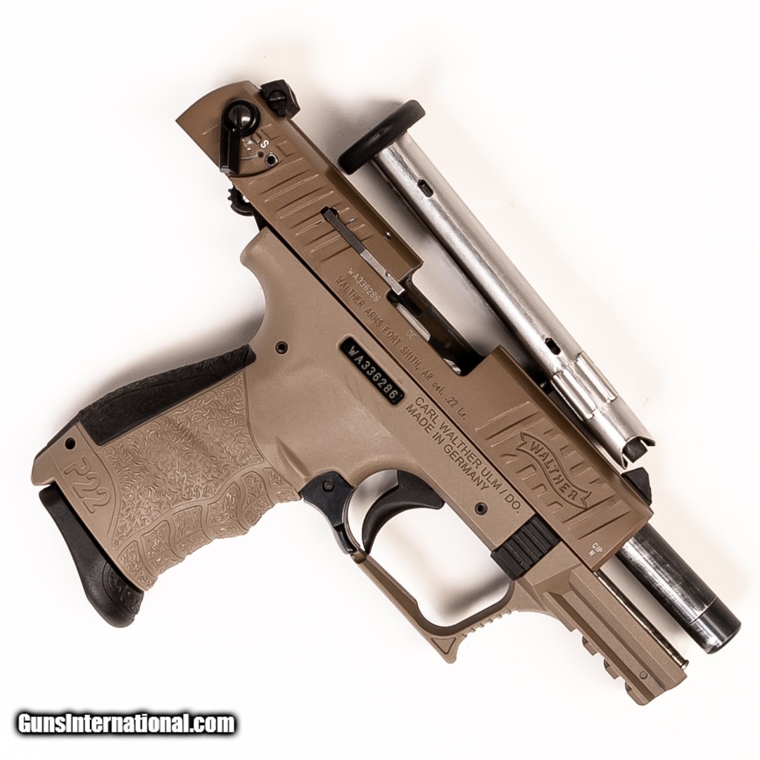 Description: Guns Listing ID: 469076 This Walther P22 (CA) is a state compliant handgun that is great for target practice, plinking, and training. They are quite popular and have a reputation for reliability and accuracy. 2-10 round magazines included. Upgraded spring rod assembly (Tandemkross Sentinal captured spring guide rod), Upgraded extractor (Volquartsen), Upgraded safety selector (Lugus MFG Extended Safety Selectors). SOLD Manufacturer: WALTHER Model: P22 CA Caliber Info: .22 LR Condition: Used - Certified Barrels: 34 BARREL Finish: FDE |