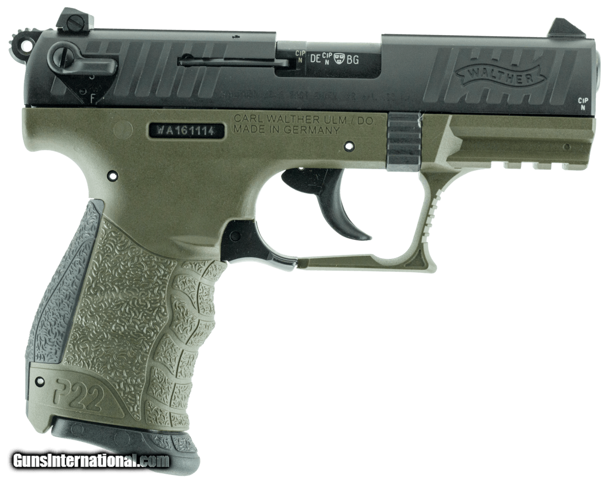Description: Guns Listing ID: 54655 This CA compliant model has a 3.42\" barrel, OD green frame with black slide, black interchangeable backstraps, and comes with a 10-round magazine. SOLD Manufacturer: WALTHER Model: P22 MILITARY CA Caliber Info: .22 LR Condition: new Barrels: 3.42 BARREL |