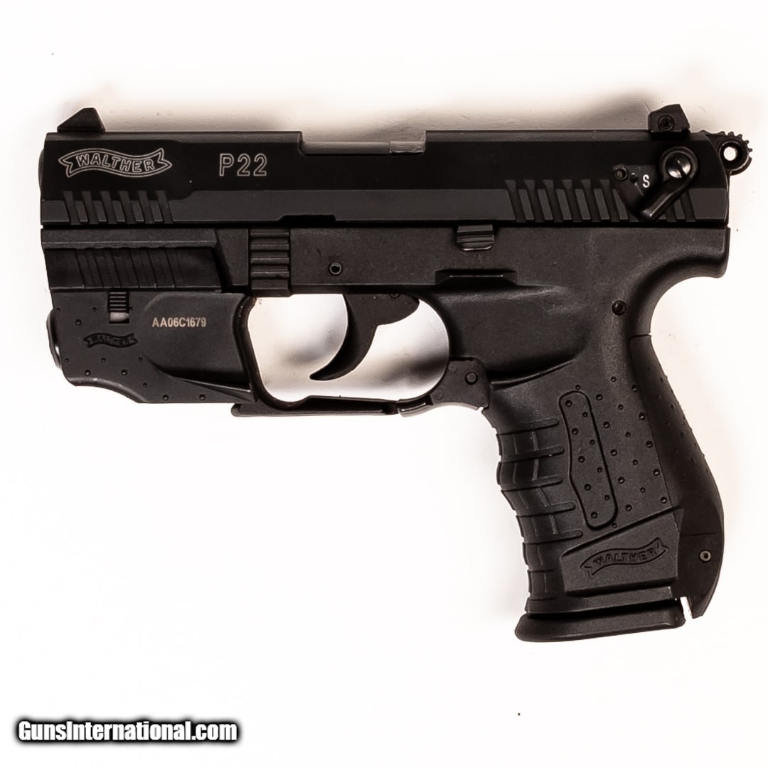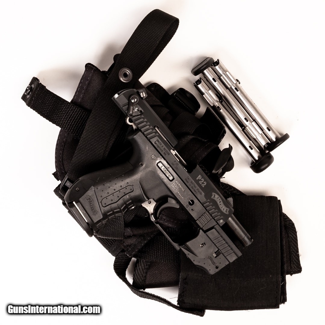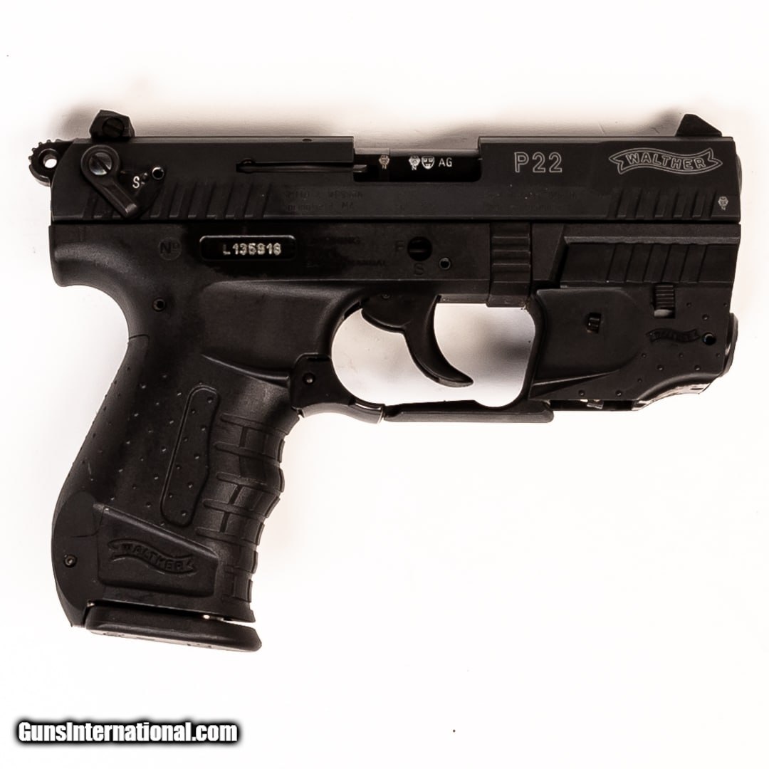 Description: Guns Listing ID: 545043 The Walther P22 is a well-made semi-automatic rimfire pistol that combines tactical styling and the fun and functionality of the 22 LR. It‚‚s great for target practice, plinking, and training. It employs Walther‚‚s signature ergonomics for a comfortable, easy-to-shoot platform while remaining inexpensive to both purchase and shoot. This P22 includes the original case, four 10-round magazines, an ankle holster, and a right-handed shoulder holster with dual mag carrier. It also comes with a laser, which is missing the battery door. SOLD Manufacturer: WALTHER Model: P22 Caliber Info: .22 LR Condition: Used - Certified Barrels: 34 BARREL Finish: BLACK |