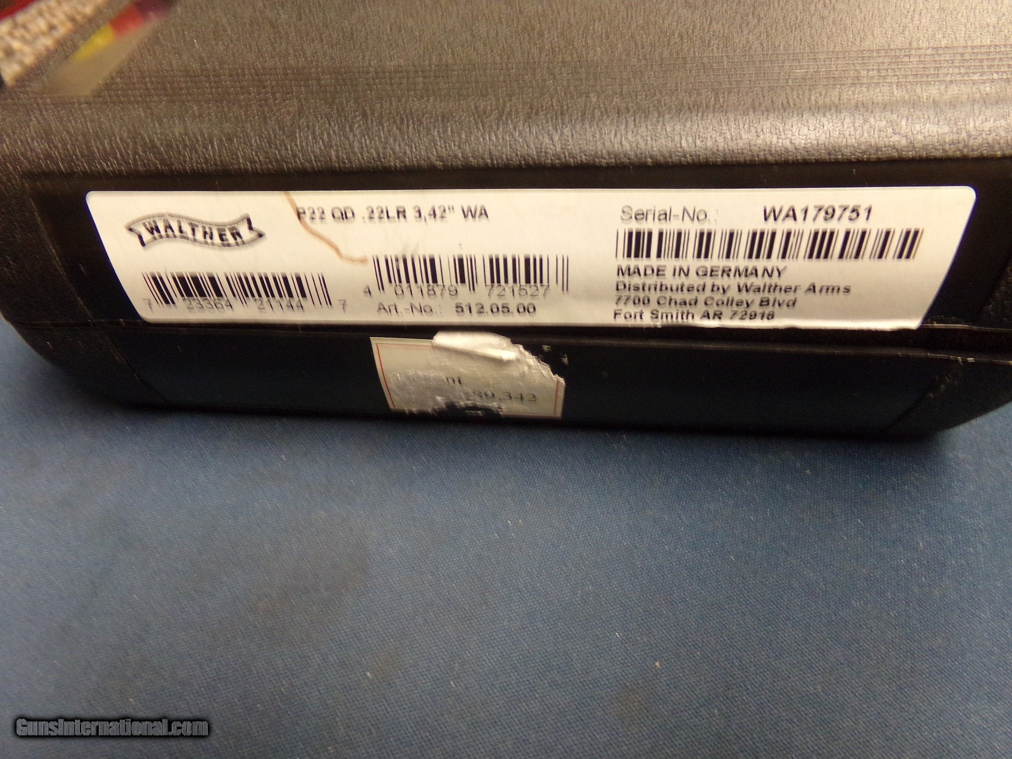 Description: Guns Listing ID: 713742 Walther P-22 22LR semi-auto pistol..es in factory box with two 10 round magazines...nice gun! SOLD Manufacturer: WALTHER Model: P22 Caliber Info: 22 LR Condition: Used - Non-Certified Barrels: 3.42 BARREL Finish: BLACK |