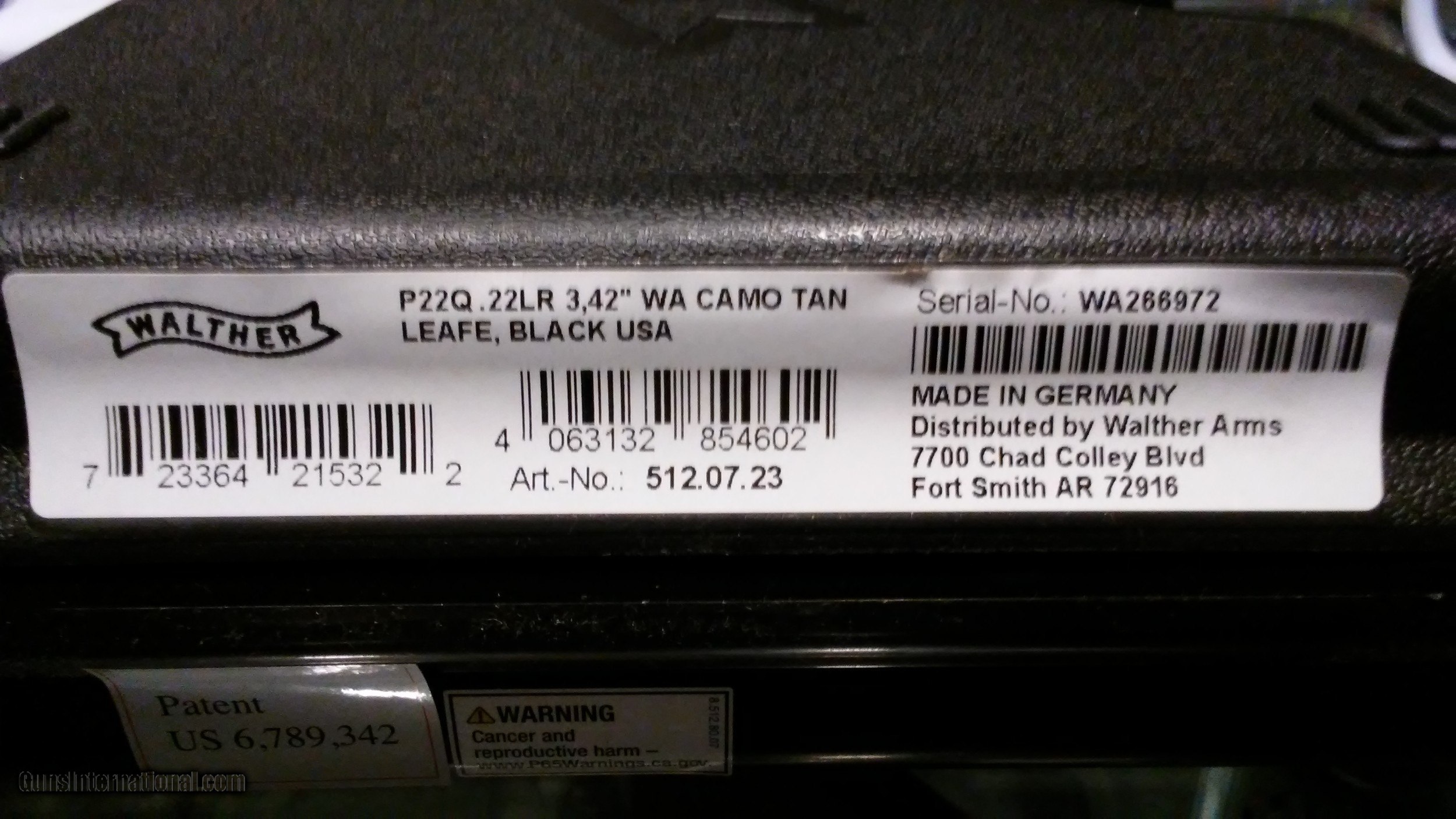 Description: Walther P22Q .22 lr pistol 3.4" bbl 10-shot CAMO #5120723 Threaded barrel, accessory rail & removable backstrap!! This is a brand new in box Walther P22Q semi-auto .22 lr pistol, comes with (2) 10-shot mags and captured recoil spring threaded barrel, accessory rail, and low profile 3-dot combat sights that are adjustable.