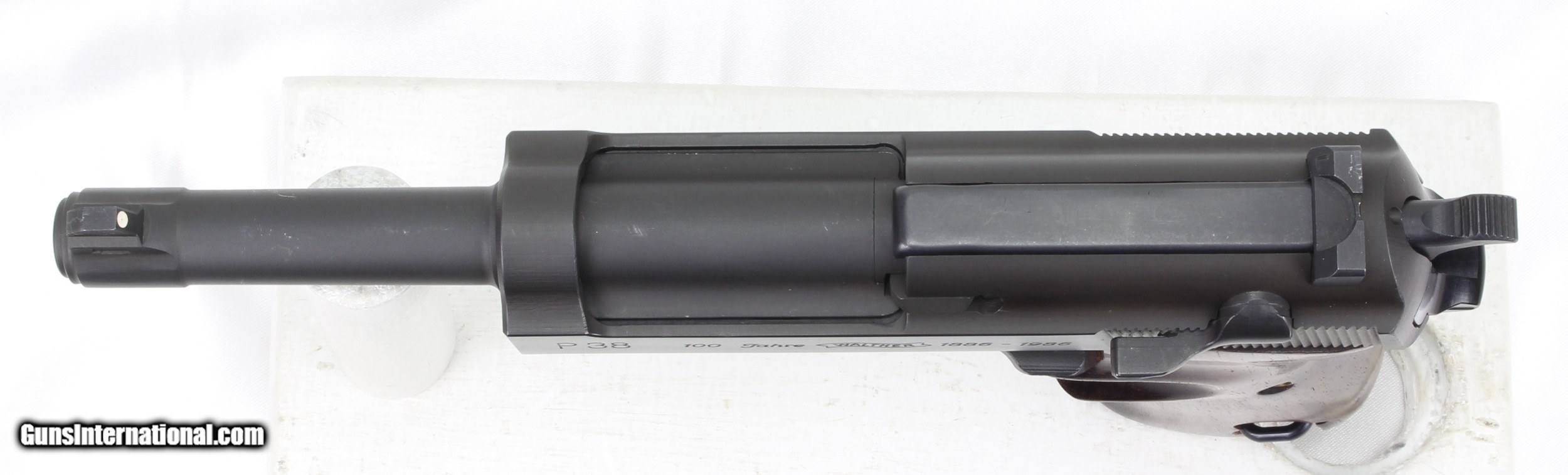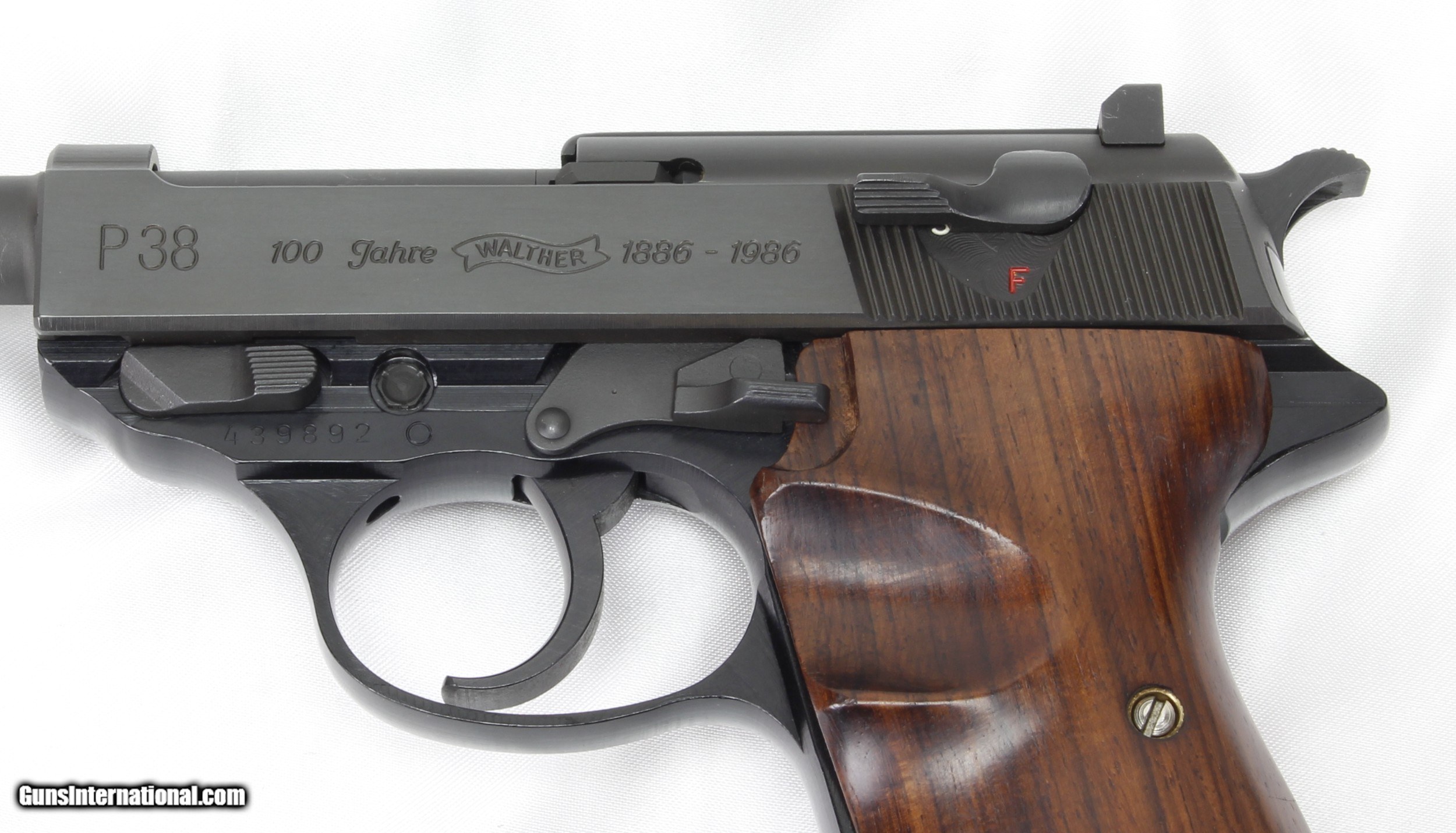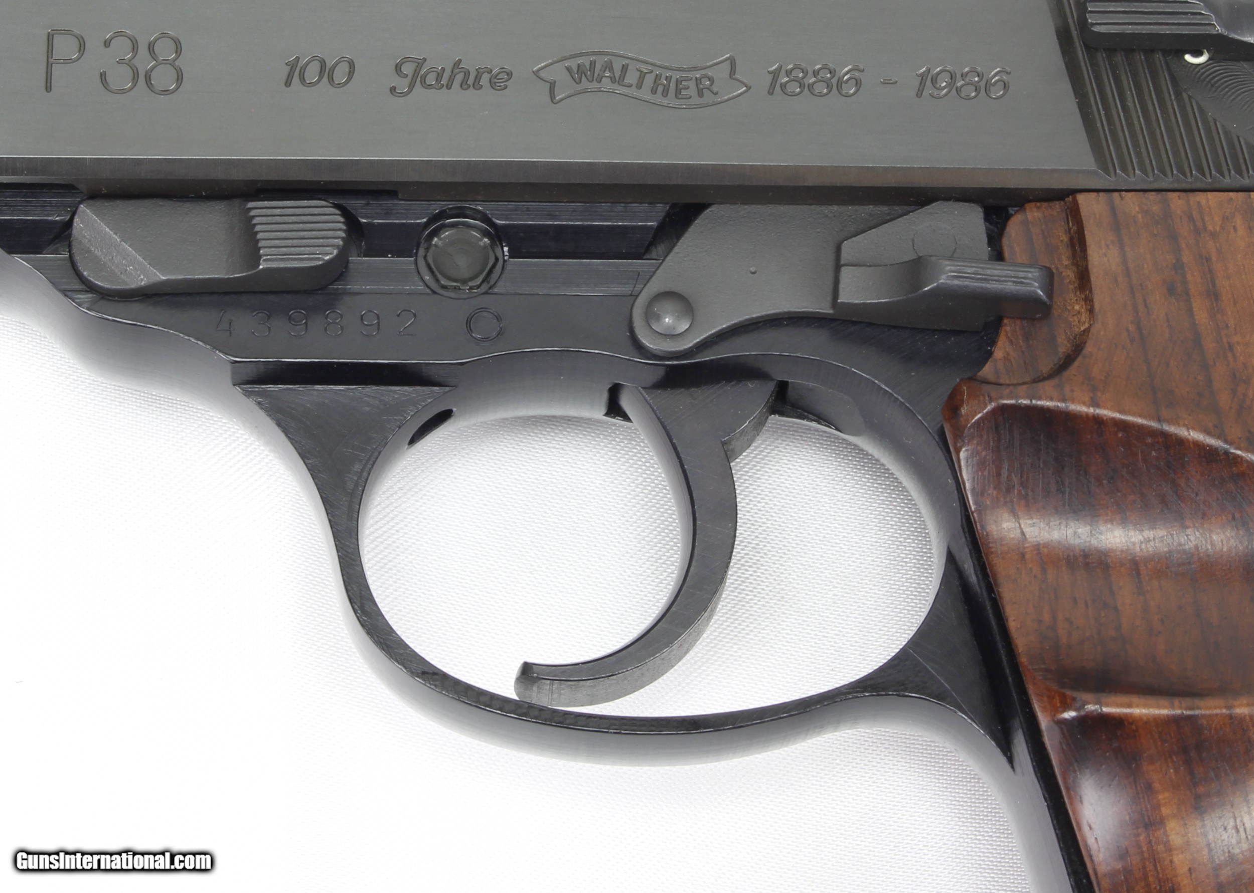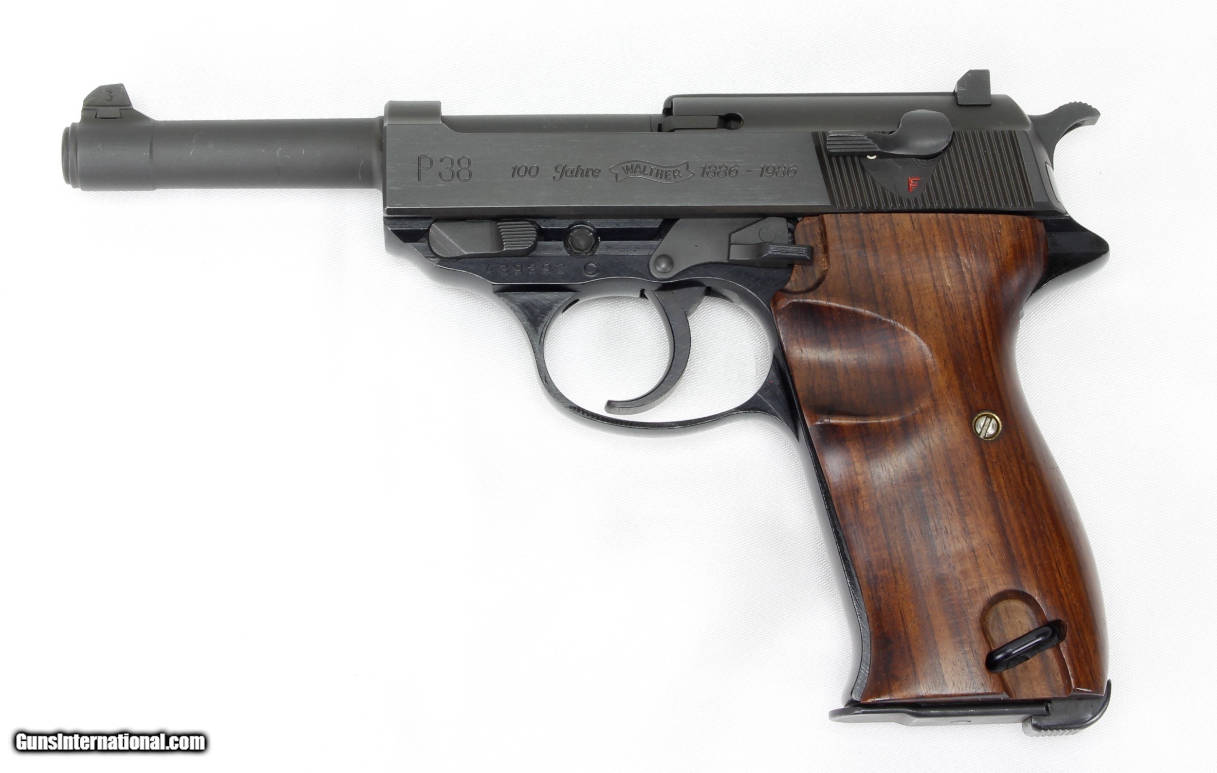 Description: Walther P38 100th Anniversary Semi-Auto Pistol in 9MM. SN #439892. UNFIRED CONDITION. Mfg. in 1986. COMMEMORATES 100 YEARS OF WALTHER with " 100 JAHRE WALTHER 1886-1986" on left side of slide. The Mattee Blue metal finish is in "Like New" condition. The smooth Walnut Grips with Thumb Cutout are in VERY GOOD to EXCELLENT condition with some VERY LIGHT handling marks. 5" Barrel. 8 Shot Magazine capacity. Alloy Frame. Fixed Sights. Weight: 1.81 lbs. Trigger Pull: 6 lbs. More photos available upon request. Ships to Lower 48 W/ Insurance $45.00. SOLD Handgun Caliber: 9x19mm Parabellum (9mm Luger, 9x19mm NATO) Manufacturer: Walther Model: P38 Serial Number: 439892 Barrel Length: 5 Condition: Excellent Metal Condition: Excellent Wood Condition: Excellent Bore Condition: Unfired Action: Semi Auto Finish: Blue Weight: 1.81 lbs. Sights: Fixed Manufacture Date: 1986 |