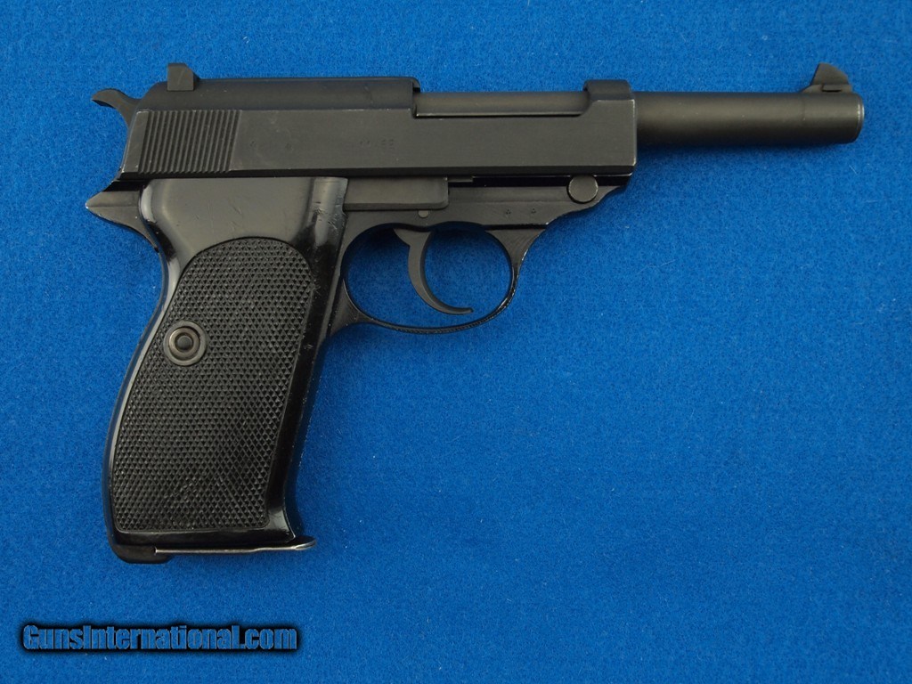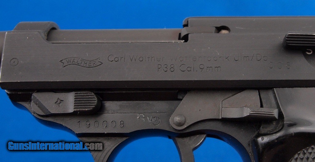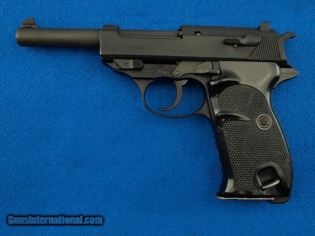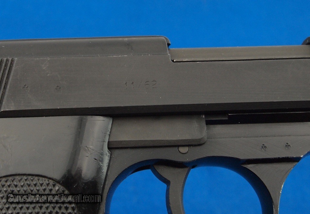 Description: Walther P38 11/62 9MM, 5" bbl, bright shiny bore, good rifling, black finish, rear notch sight, front blade sight, black checkered grips, lanyard loop, and one 7 round magazine. See pictures for details and proof marks. Add 3% for Credit Card Shipping $25.00 SOLD |