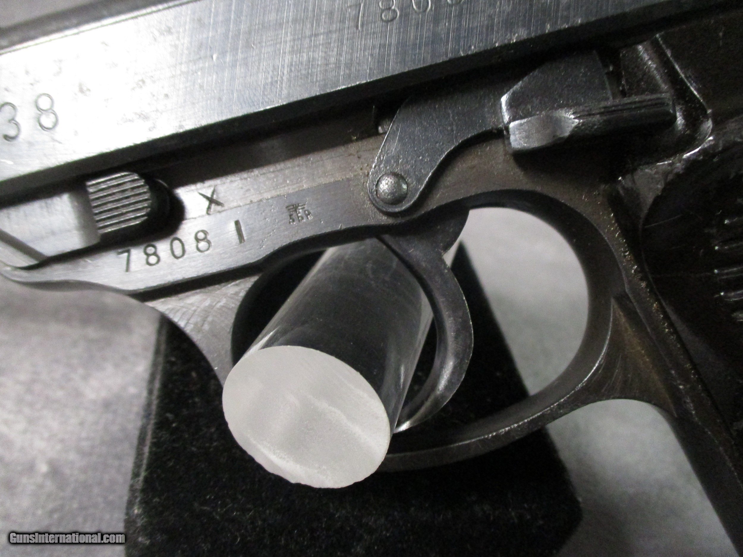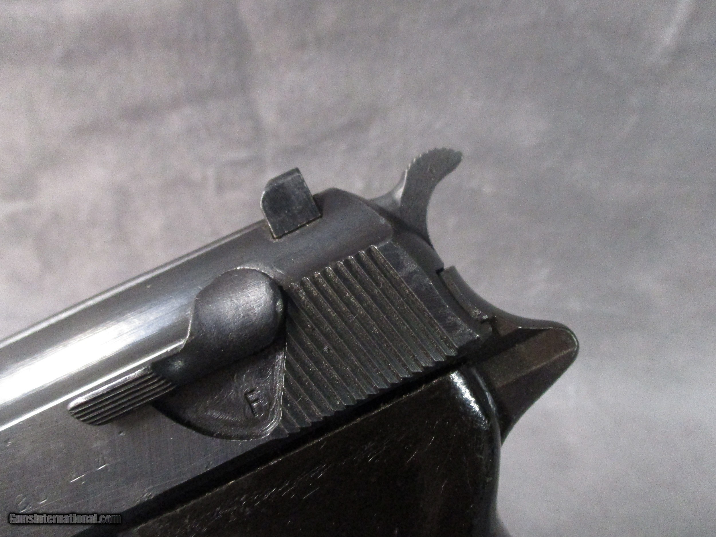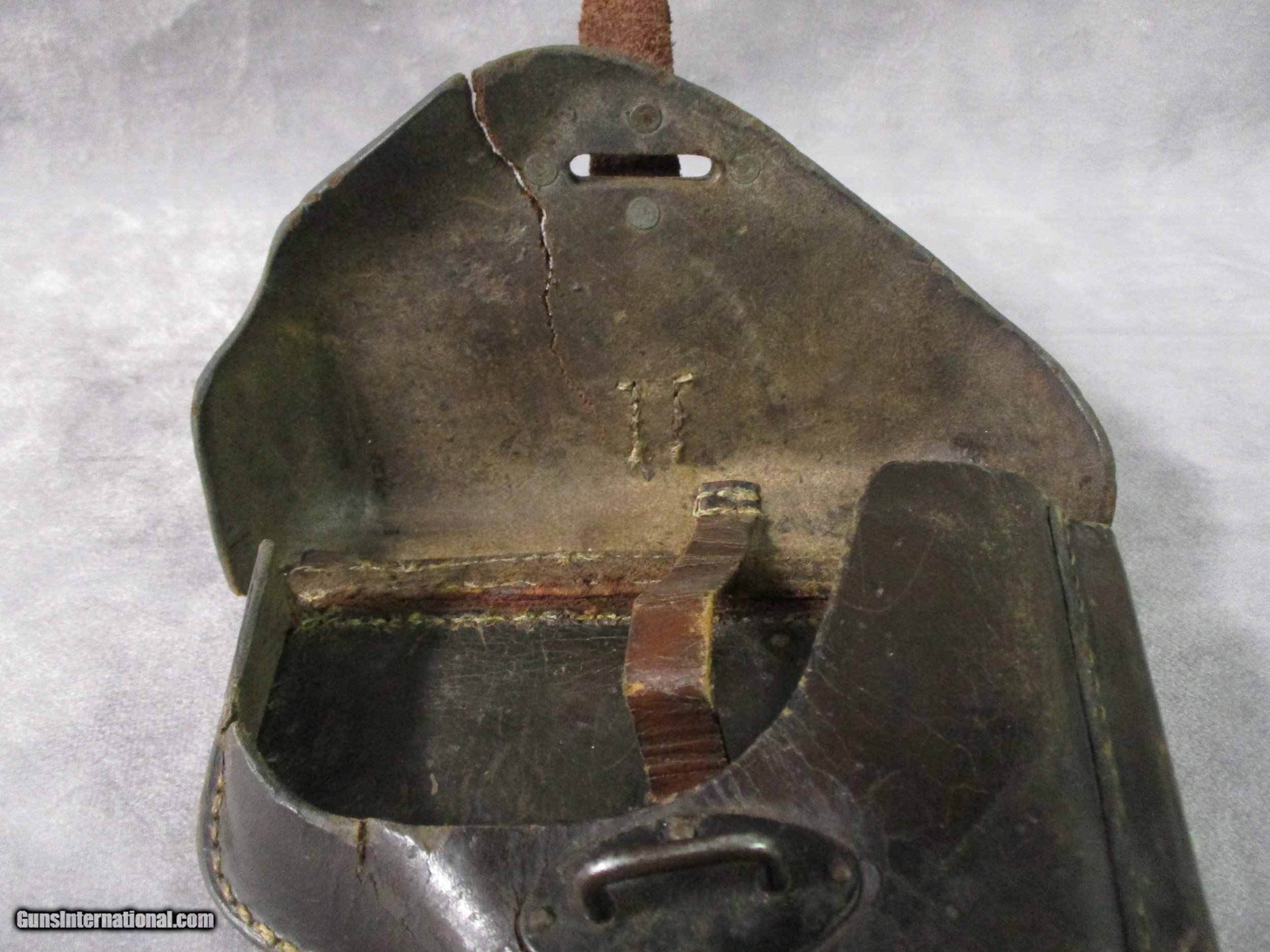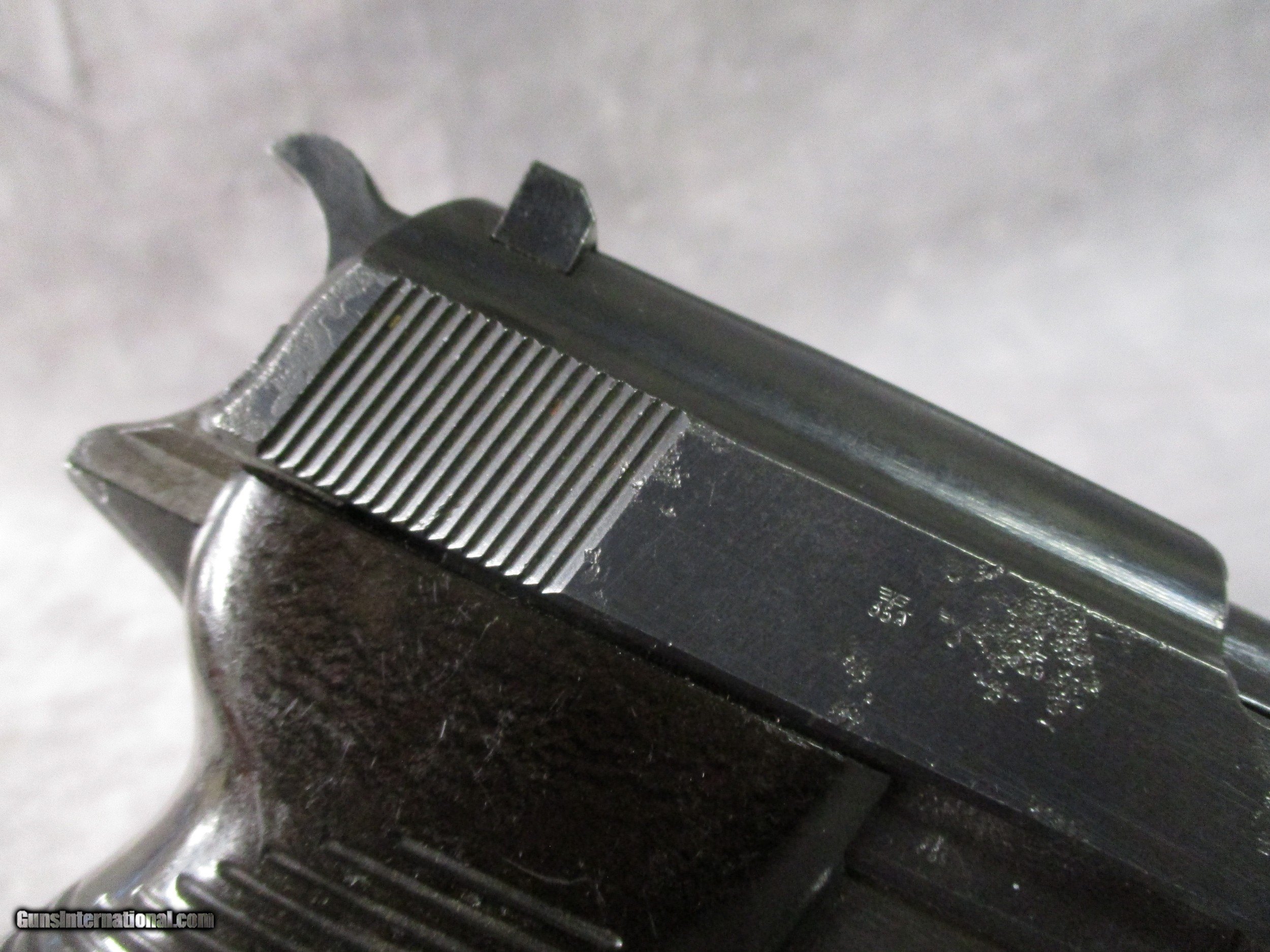 Description: The P38 was developed during the 1930’s to replace the famous P.08 Luger pistol. While the Luger was an elegant design, its tight tolerances eventually caused problems once mud, dirt, or other battlefield detritus found its way into the action. The P38 was designed to be simple and easy to operate. More importantly, it was the first locked-breech pistol to use a double-action/single-action (DA/SA) trigger. The combined de-cocker/safety provided an extra measure of safety. Many of the features the P38 pioneered are still in use today, most notable on the Beretta 92FS/M9. Indeed, the P38’s then-unique hinged locking block was later copied by Beretta for the M1951 pistol and later found its way into the design of the 92/M9. The P38 shown here was built at the Walther factory in December of 1944. It has the “X” mark on the left side of the frame indicating that the pistol was captured by the Russians in the last few months of the war, possibly having been taken off the body of a dead German soldier. Alternatively, it may simply have been turned in at the time of surrender. There are import marks are on the underside of the beavertail. The pistol was imported by NHM Co. in Sacramento, California (NHM = New Helvetia Mercantile). Overall, its condition ranges from fair to good. The Waffenamt E/359 stamp is present in the following locations: both sides of the frame, on the trigger bar, left side of the barrel frame, right side of the locking block, and two times on the right side of the slide (one is mostly worn from pitting). There is also an eagle and swastika stamp on the right side as well. The front sight has the number “4” on the left side. The bore has some frosting in the grooves, but the rifling is still well-defined. Accuracy with jacketed bullets should still be decent. The slide and frame both exhibit shallow pitting, the former more so than the latter. As there is bluing present over the pitting, the pistol has been refinished. The Bakelite grips are in fairly good shape. They exhibit light scratches on the surface, but no cracks. Mechanically the pistol functions quite well. The feed ramp can accommodate hollow points just as well as FMJ. One of the nice aspects of the P38 is that is chambered for a cartridge that is widely available, so shooting it just for fun does not cost as much as other military pistols, such as the Japanese Nambu or the British Webley revolver. The P38 does come with a holster, although it is in poor shape. The flap cover is ripped in two for most of its height (i.e., vertically). The leather strap is surprisingly still attached. One of the belt loops is a replacement. SOLD Handgun Caliber: 9x19mm Parabellum (9mm Luger, 9x19mm NATO) Manufacturer: Walther Arms, Inc. Model: P38 Serial Number: 7808L Bore: Rifled, 6 grooves, 1:10" (1 in 254 mm) RH Twist Condition: Fair to Good Barrel Type: Tapering Action: Semi-automatic, double-action/single-action, short recoil, hinged locking block action Triggers: Hook Trigger Stock: Bakelite Grips Finish: Matte blue Weight: 28.2 oz. Sights: U-notch rear sight, blade front sight, sight radius 7.0625 inches (179.388 mm) Manufacture Date: December 1944 Extras: Old P38 holster |