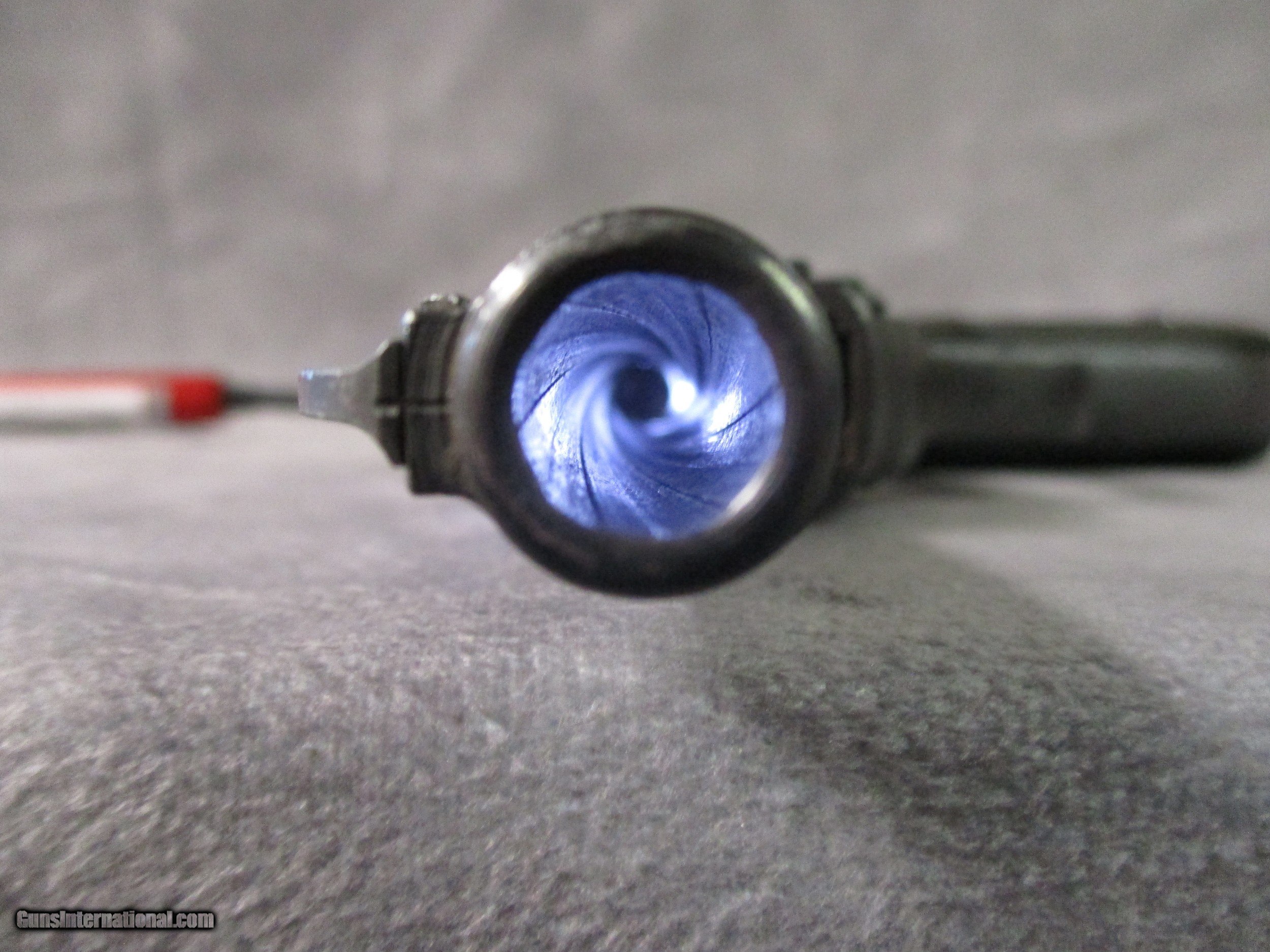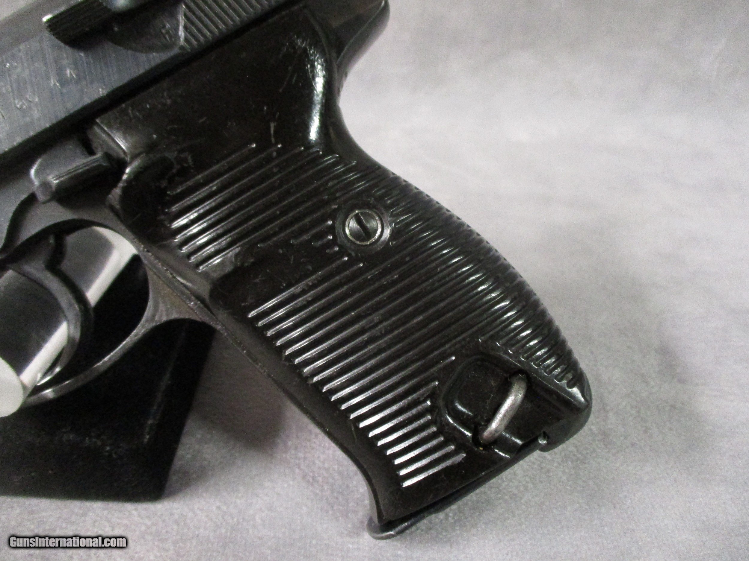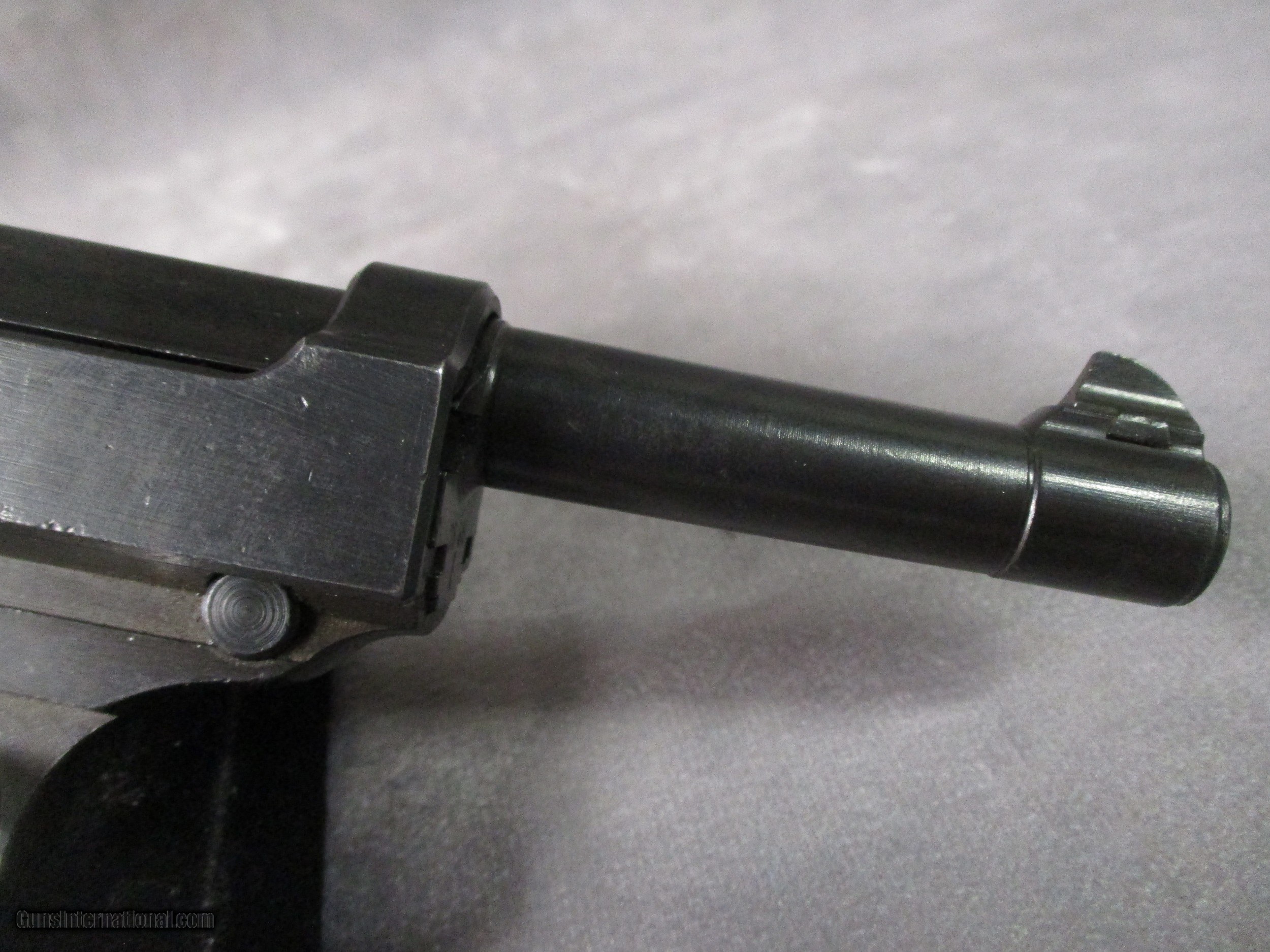 Description: The P38 was developed during the 1930’s to replace the famous P.08 Luger pistol. While the Luger was an elegant design, its tight tolerances eventually caused problems once mud, dirt, or other battlefield detritus found its way into the action. The P38 was designed to be simple and easy to operate. More importantly, it was the first locked-breech pistol to use a double-action/single-action (DA/SA) trigger. The combined de-cocker/safety provided an extra measure of safety. Many of the features the P38 pioneered are still in use today, most notable on the Beretta 92FS/M9. Indeed, the P38’s then-unique hinged locking block was later copied by Beretta for the M1951 pistol and later found its way into the design of the 92/M9. The P38 shown here was built at the Walther factory in December of 1944. It has the “X” mark on the left side of the frame indicating that the pistol was captured by the Russians in the last few months of the war, possibly having been taken off the body of a dead German soldier. Alternatively, it may simply have been turned in at the time of surrender. There are import marks are on the underside of the beavertail. The pistol was imported by NHM Co. in Sacramento, California (NHM = New Helvetia Mercantile). Overall, its condition ranges from fair to good. The Waffenamt E/359 stamp is present in the following locations: both sides of the frame, on the trigger bar, left side of the barrel frame, right side of the locking block, and two times on the right side of the slide (one is mostly worn from pitting). There is also an eagle and swastika stamp on the right side as well. The front sight has the number “4” on the left side. The bore has some frosting in the grooves, but the rifling is still well-defined. Accuracy with jacketed bullets should still be decent. The slide and frame both exhibit shallow pitting, the former more so than the latter. As there is bluing present over the pitting, the pistol has been refinished. The Bakelite grips are in fairly good shape. They exhibit light scratches on the surface, but no cracks. Mechanically the pistol functions quite well. The feed ramp can accommodate hollow points just as well as FMJ. One of the nice aspects of the P38 is that is chambered for a cartridge that is widely available, so shooting it just for fun does not cost as much as other military pistols, such as the Japanese Nambu or the British Webley revolver. The P38 does come with a holster, although it is in poor shape. The flap cover is ripped in two for most of its height (i.e., vertically). The leather strap is surprisingly still attached. One of the belt loops is a replacement. SOLD Handgun Caliber: 9x19mm Parabellum (9mm Luger, 9x19mm NATO) Manufacturer: Walther Arms, Inc. Model: P38 Serial Number: 7808L Bore: Rifled, 6 grooves, 1:10" (1 in 254 mm) RH Twist Condition: Fair to Good Barrel Type: Tapering Action: Semi-automatic, double-action/single-action, short recoil, hinged locking block action Triggers: Hook Trigger Stock: Bakelite Grips Finish: Matte blue Weight: 28.2 oz. Sights: U-notch rear sight, blade front sight, sight radius 7.0625 inches (179.388 mm) Manufacture Date: December 1944 Extras: Old P38 holster |