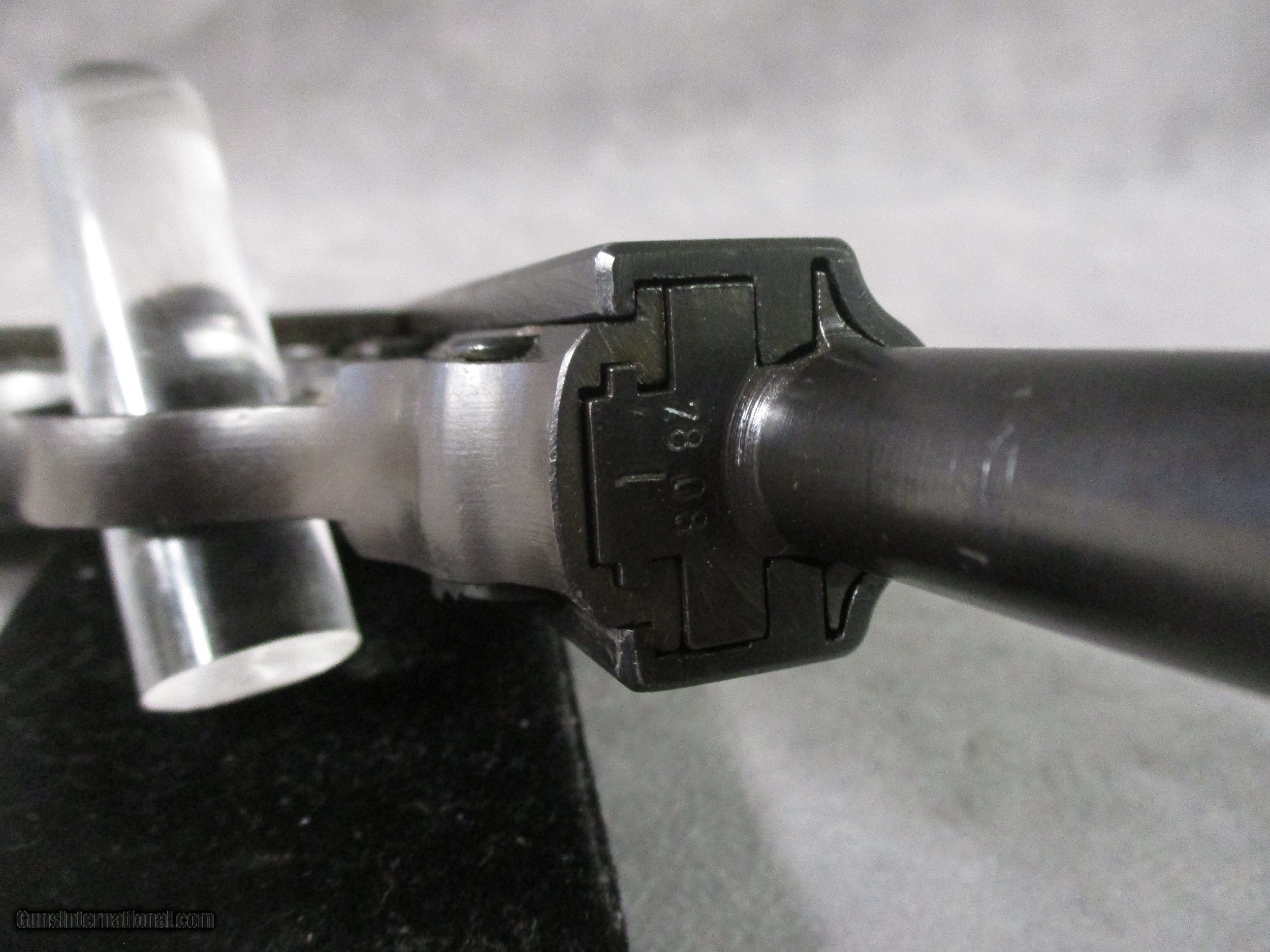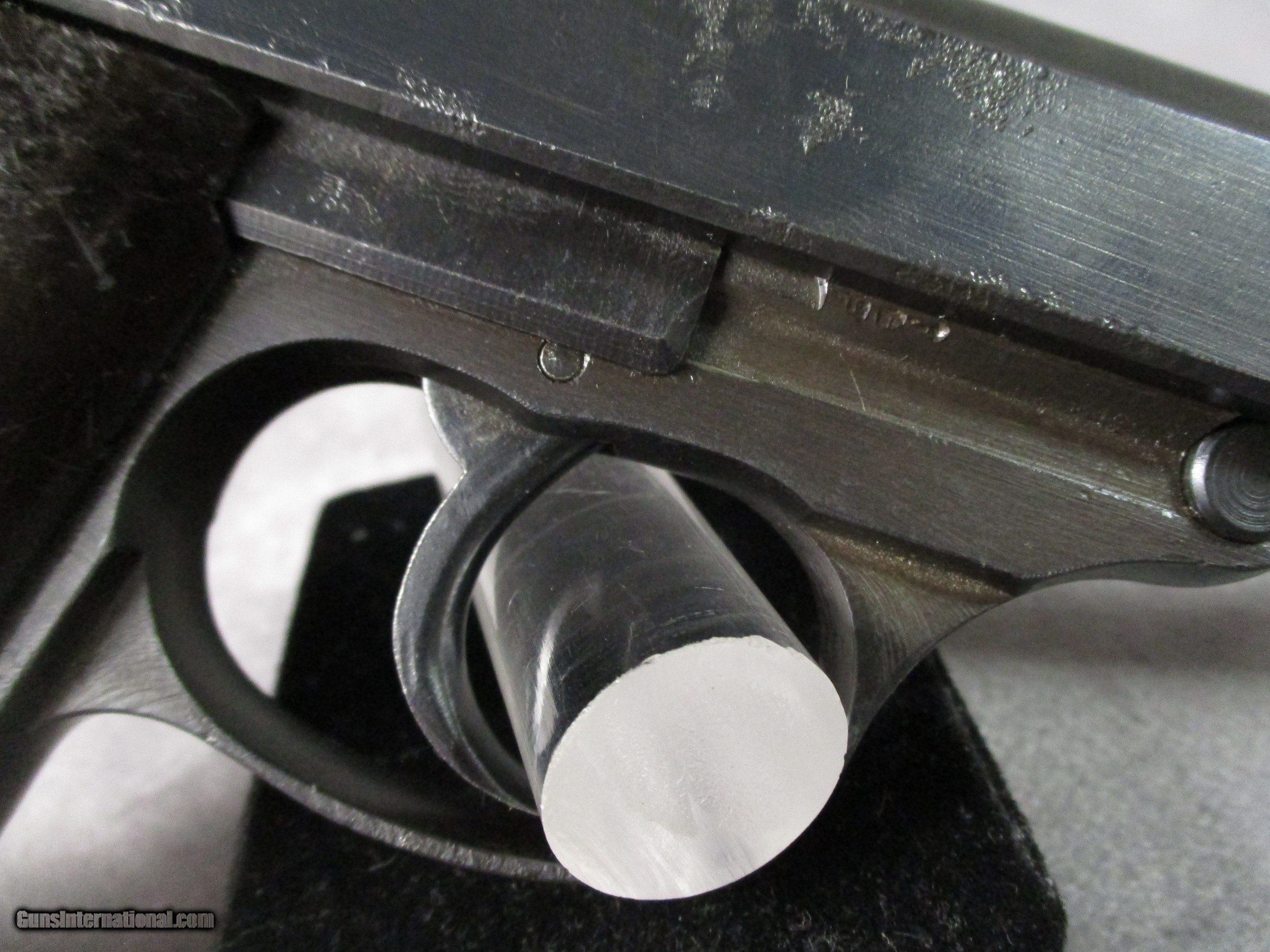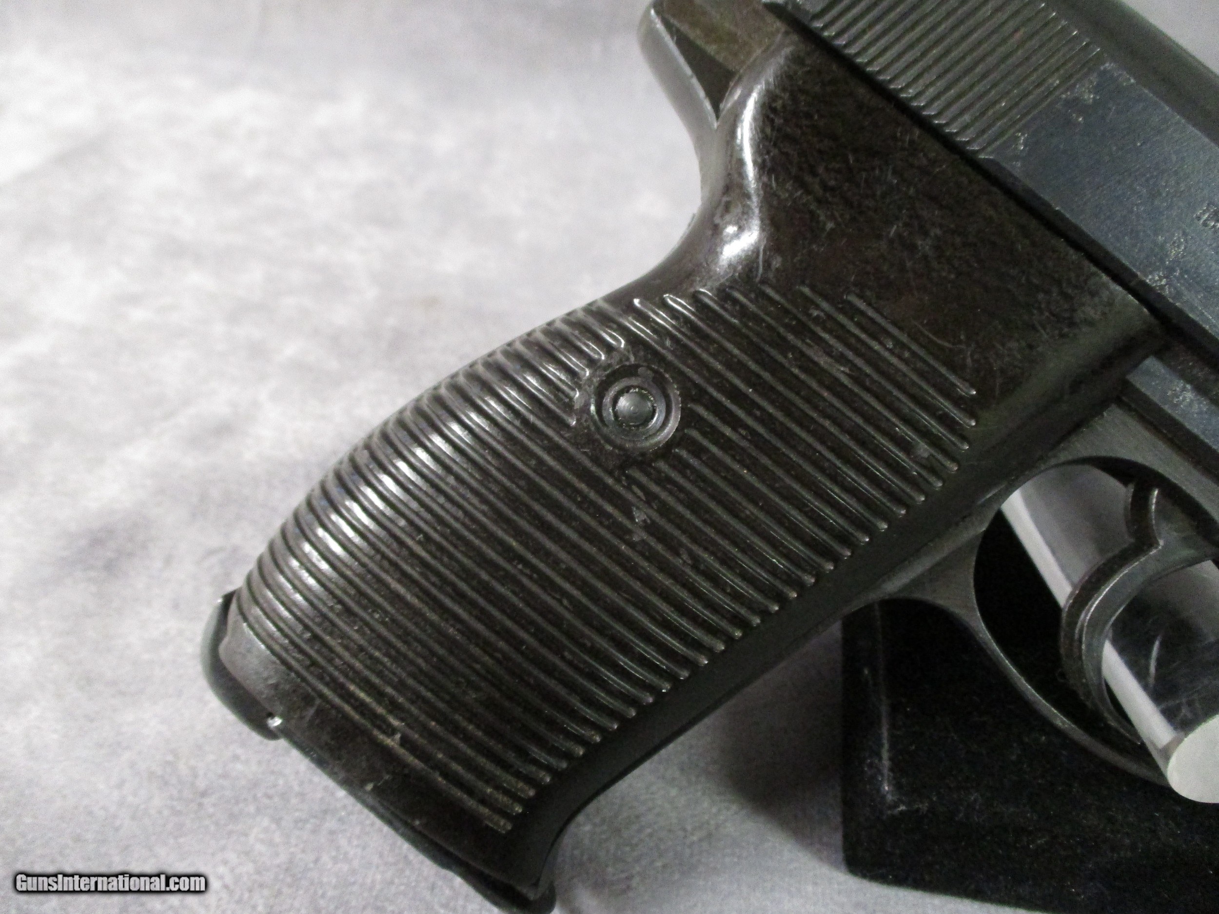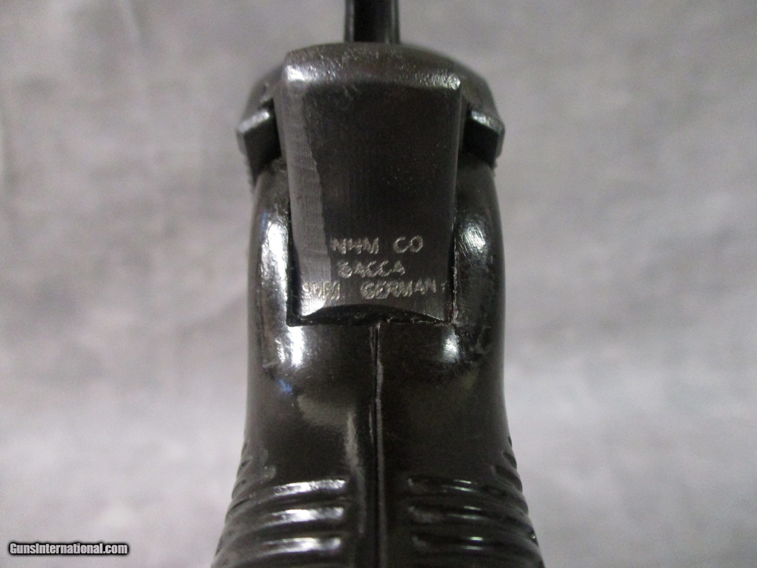 Description: The P38 was developed during the 1930’s to replace the famous P.08 Luger pistol. While the Luger was an elegant design, its tight tolerances eventually caused problems once mud, dirt, or other battlefield detritus found its way into the action. The P38 was designed to be simple and easy to operate. More importantly, it was the first locked-breech pistol to use a double-action/single-action (DA/SA) trigger. The combined de-cocker/safety provided an extra measure of safety. Many of the features the P38 pioneered are still in use today, most notable on the Beretta 92FS/M9. Indeed, the P38’s then-unique hinged locking block was later copied by Beretta for the M1951 pistol and later found its way into the design of the 92/M9. The P38 shown here was built at the Walther factory in December of 1944. It has the “X” mark on the left side of the frame indicating that the pistol was captured by the Russians in the last few months of the war, possibly having been taken off the body of a dead German soldier. Alternatively, it may simply have been turned in at the time of surrender. There are import marks are on the underside of the beavertail. The pistol was imported by NHM Co. in Sacramento, California (NHM = New Helvetia Mercantile). Overall, its condition ranges from fair to good. The Waffenamt E/359 stamp is present in the following locations: both sides of the frame, on the trigger bar, left side of the barrel frame, right side of the locking block, and two times on the right side of the slide (one is mostly worn from pitting). There is also an eagle and swastika stamp on the right side as well. The front sight has the number “4” on the left side. The bore has some frosting in the grooves, but the rifling is still well-defined. Accuracy with jacketed bullets should still be decent. The slide and frame both exhibit shallow pitting, the former more so than the latter. As there is bluing present over the pitting, the pistol has been refinished. The Bakelite grips are in fairly good shape. They exhibit light scratches on the surface, but no cracks. Mechanically the pistol functions quite well. The feed ramp can accommodate hollow points just as well as FMJ. One of the nice aspects of the P38 is that is chambered for a cartridge that is widely available, so shooting it just for fun does not cost as much as other military pistols, such as the Japanese Nambu or the British Webley revolver. The P38 does come with a holster, although it is in poor shape. The flap cover is ripped in two for most of its height (i.e., vertically). The leather strap is surprisingly still attached. One of the belt loops is a replacement. SOLD Handgun Caliber: 9x19mm Parabellum (9mm Luger, 9x19mm NATO) Manufacturer: Walther Arms, Inc. Model: P38 Serial Number: 7808L Bore: Rifled, 6 grooves, 1:10" (1 in 254 mm) RH Twist Condition: Fair to Good Barrel Type: Tapering Action: Semi-automatic, double-action/single-action, short recoil, hinged locking block action Triggers: Hook Trigger Stock: Bakelite Grips Finish: Matte blue Weight: 28.2 oz. Sights: U-notch rear sight, blade front sight, sight radius 7.0625 inches (179.388 mm) Manufacture Date: December 1944 Extras: Old P38 holster |