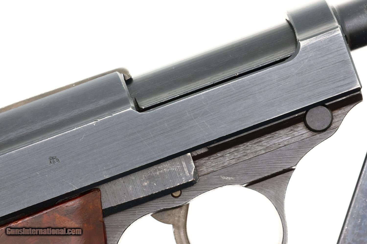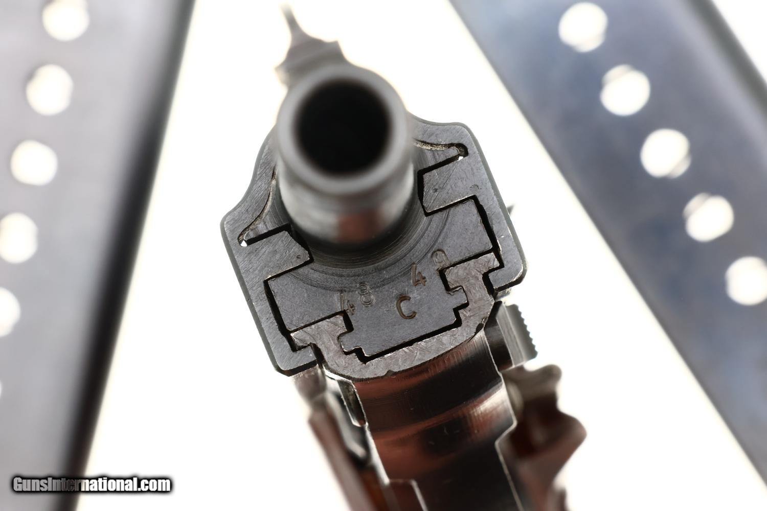 Description: Synopsis: Wonderful example of a very late World War II mismatched P38 with a mixture of blued and phosphated small parts, this example with an FN frame, Walther accepted slide, barrel and locking block, all with different numbers, both magazines with a subcontracted jvd E/WaA706 acceptance. Description: Very late war, standard configuration Walther P38 pistol, blued with several phosphated small parts ( loaded indicator cover, hammer, extractor, slide release and trigger), and mismatched with FN frame, SN: 2468, cal. 9mmP, with 5-inch barrel, drift adjustable front sight and fixed rear sight. Left side of slide is marked "P.38" followed by serial number "5067 c ac 45", barrel "4849 c", while the left side of frame below the trigger guard numbered "2468" with the FN E/140 acceptance. Locking block unnumbered with Walther E/WaA359 acceptance. Brown composition grips with horizontal ribbing. Complete with two blued subcontracted magazines, each with 7 cartridge indicator holes, marked "P 38" on left side and E/WaA706 / jvd" on spine. Condition: Collector quality 98+% original salt blue with comparable condition phosphate on the loaded indicator cover, extractor, slide release and trigger. Comparable condition grips and magazines. Bright bore with sharp rifling. Correct manual mechanics. Manufacturer: Walther Model: P38 Serial Number: 11024 Caliber Info: 9mm Condition: EXC Price: $2,295.00 Contact Seller |