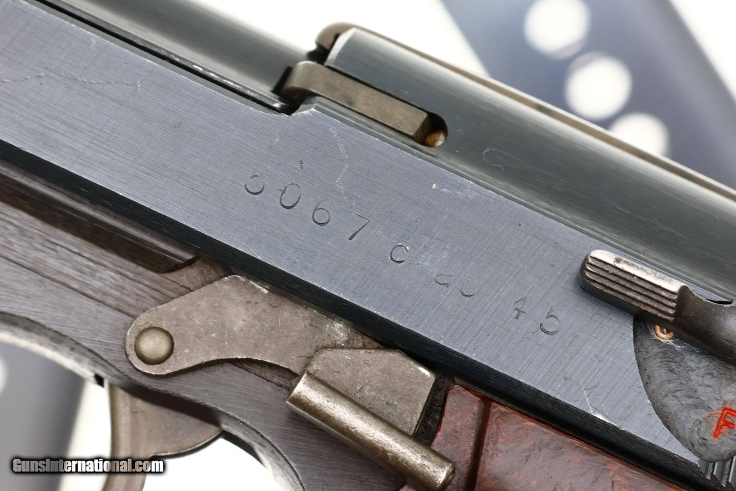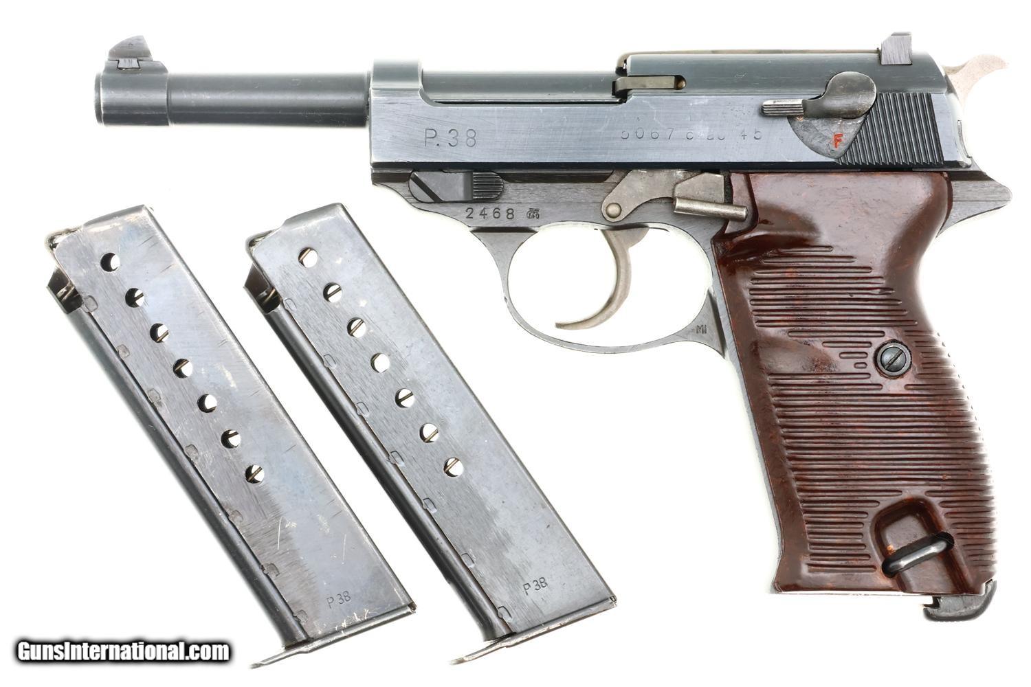 Very late war, standard configuration Walther P38 pistol, blued with several phosphated small parts ( loaded indicator cover, hammer, extractor, slide release and trigger), and mismatched with FN frame, SN: 2468, cal. 9mmP, with 5-inch barrel, drift adjustable front sight and fixed rear sight. Left side of slide is marked "P.38" followed by serial number "5067 c ac 45", barrel "4849 c", while the left side of frame below the trigger guard numbered "2468" with the FN E/140 acceptance. Locking block unnumbered with Walther E/WaA359 acceptance. Brown composition grips with horizontal ribbing. Complete with two blued subcontracted magazines, each with 7 cartridge indicator holes, marked "P 38" on left side and E/WaA706 / jvd" on spine.