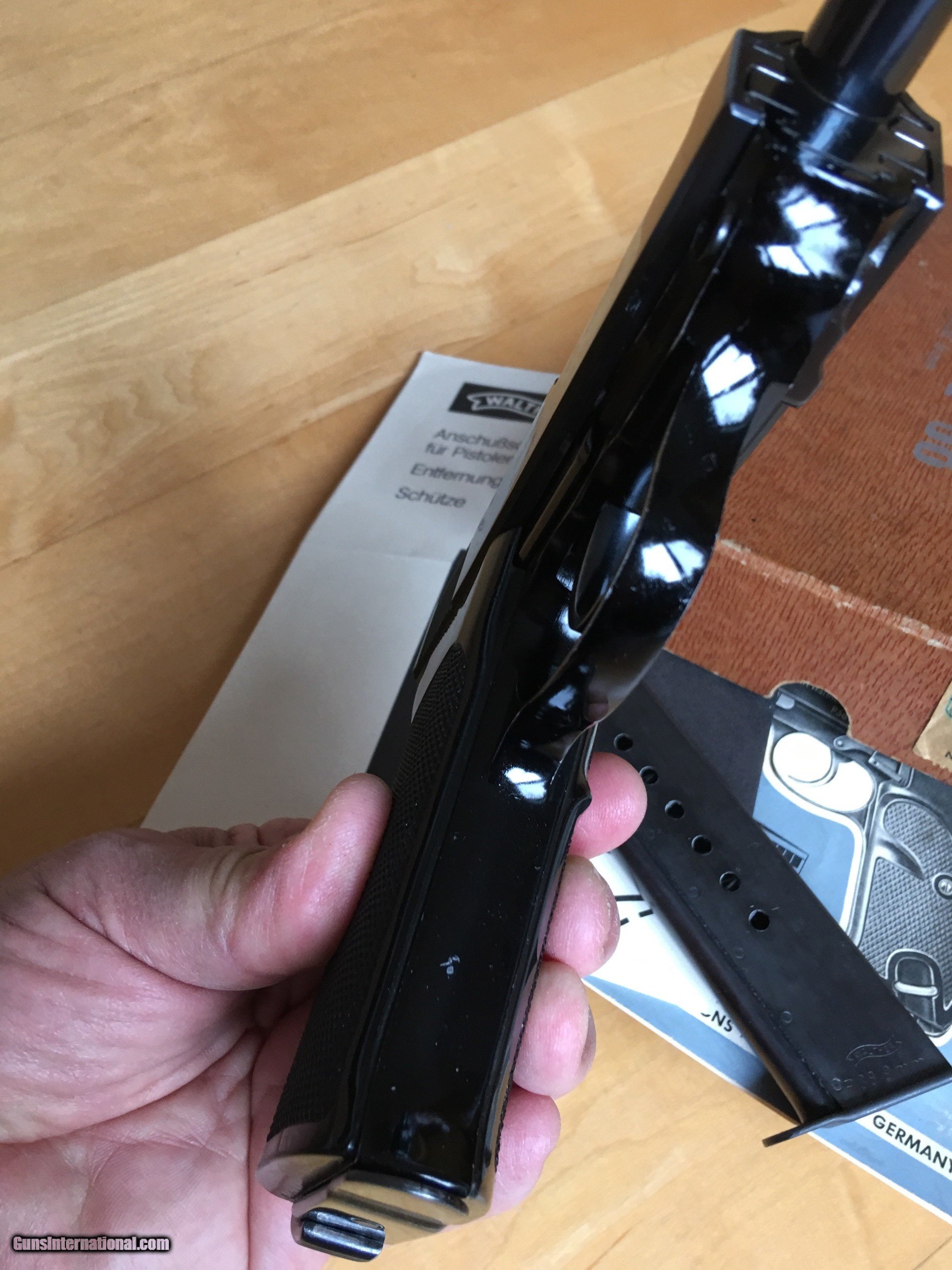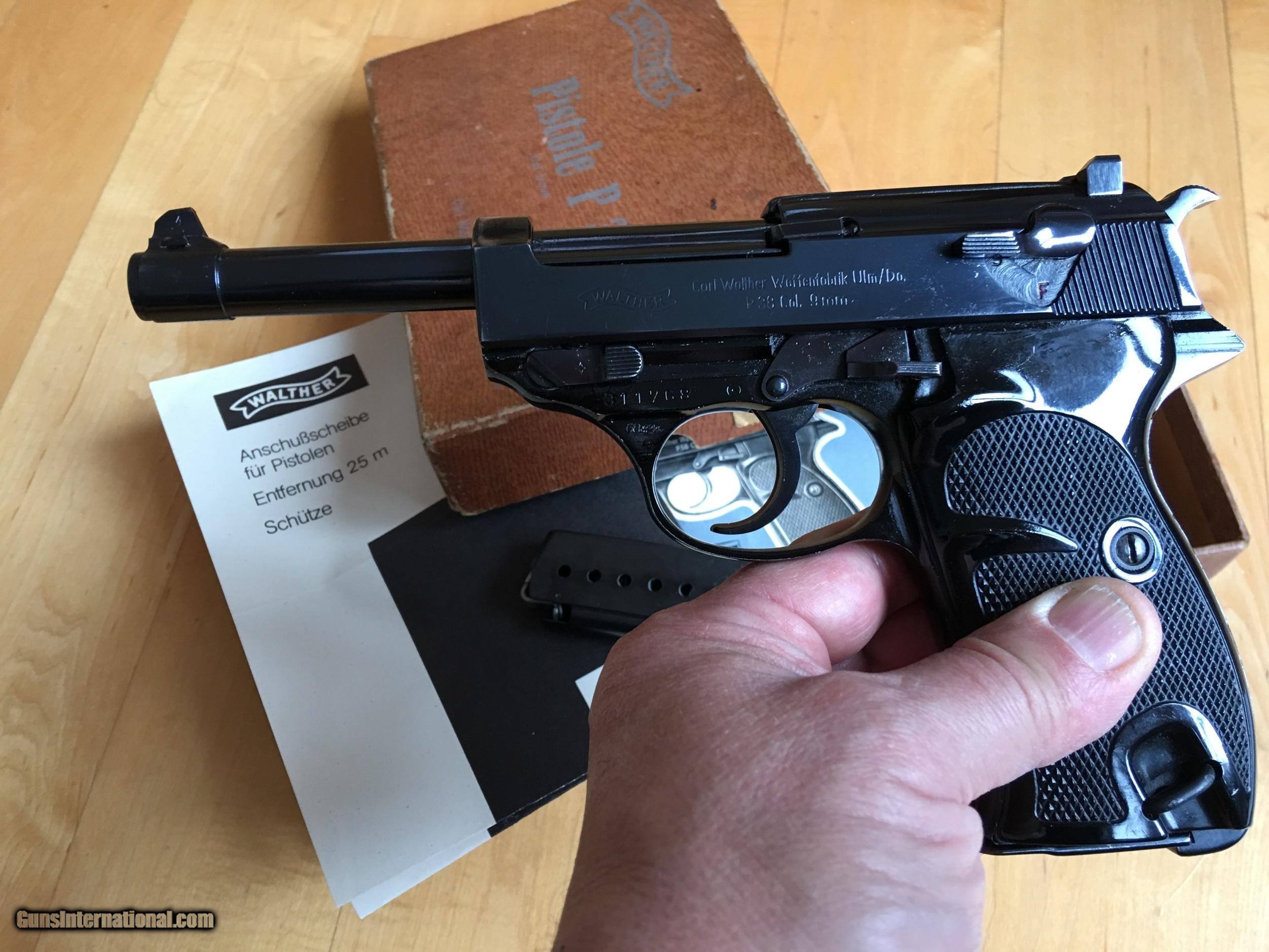 Description: This is a spectacular example of post war Walther P38 pistol, chambered in 9mm Para, that is pretty much “as new in the box”. The gun appears unfired with just a hint of “box” wear here and there - too tiny to be seen in the pictures - on the right side of the frame, and a tiny scratch the size of a pinhead on the front grip strap. This is a much less common “poliert” - high polish variant that has a beautiful lustrous blue on the slide and barrel and an anodized lightweight “dural” frame. This a complete set with a matching box, 2 magazines, manual and a blank test target. Made in 1968 in West Germany and is so marked. This is a great collector and investment set that would only appreciate in the future. perfect bore and grips. All matching. 3-day inspection. FFL or C&R(where allowed). $30 shipping in Conus. SOLD Curio/Relic: Yes Handgun Caliber: 9x19mm Parabellum (9mm Luger, 9x19mm NATO) |