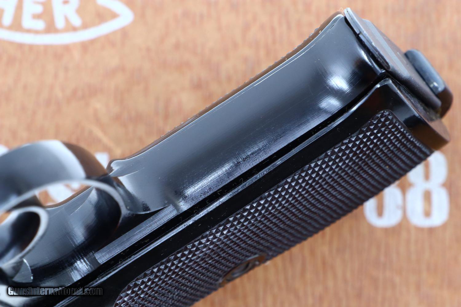 Description: A very unusual P38 made for European distribution in that the only caliber designation on the slide references 5.6mm (not .22LR). Slide dated 4/67 with final assembly reflected by the frame date of “68”. Also unusual in that the slide markings are masked within a high polish oval, typical for the earliest of these pistols, the rest of the slide assembly having a matte finish. Standard configuration with 5” barrel having drift adjustable front sight and fixed rear sight. Lightened slide with usual two line Walther legend on left side stipulating model and caliber. The right side of the slide is dated “4/67”. Usual Eagle/N proofs on left side of frame, right side of slide and under barrel. Discrete import markings on base of frame. The left side of the trigger guard is marked with the year “68” next to the antler proof and Eagle/N. Fitted with two piece black plastic grips with the left side recessed for the lanyard loop. Accompanied with two high polish magazines manufactured to reliably feed the .22LR cartridge and marked with the Walther banner along with the European denomination “cal. 5.6mm”. The barrel and slide have a matte finish while the alloy frame is black anodized. Each of the magazines were finished with high polish salt blue. Complete with standard instruction booklet and brown/faux wood grain cardboard box marked with model and caliber, end label with matching serial number. Synopsis: Scarce Walther P38, assembled 1968, in caliber 5.6 (.22LR), with early masked slide markings, no Interarms, in orginal shipping box, with booklet and spare magazine. Condition: Pistol and each of the two magazines have 99+% original finish, some congealed grease on the right side of the slide, near the date. The grips are in about the same condition though the right panel has a few scuffs in the smooth area above the checkering. Mirror bore. Perfect manual mechanics. Excellent, crisp shipping box. An impressive post war P38, having the most desirable early features, in a scarce caliber! ~~Insured shipping fee of $65; most packages shipped using FedEx 2nd Day.~~ SOLD Curio/Relic: Yes Manufacturer: Walther Serial Number: 313582 Caliber Info: .22LR |