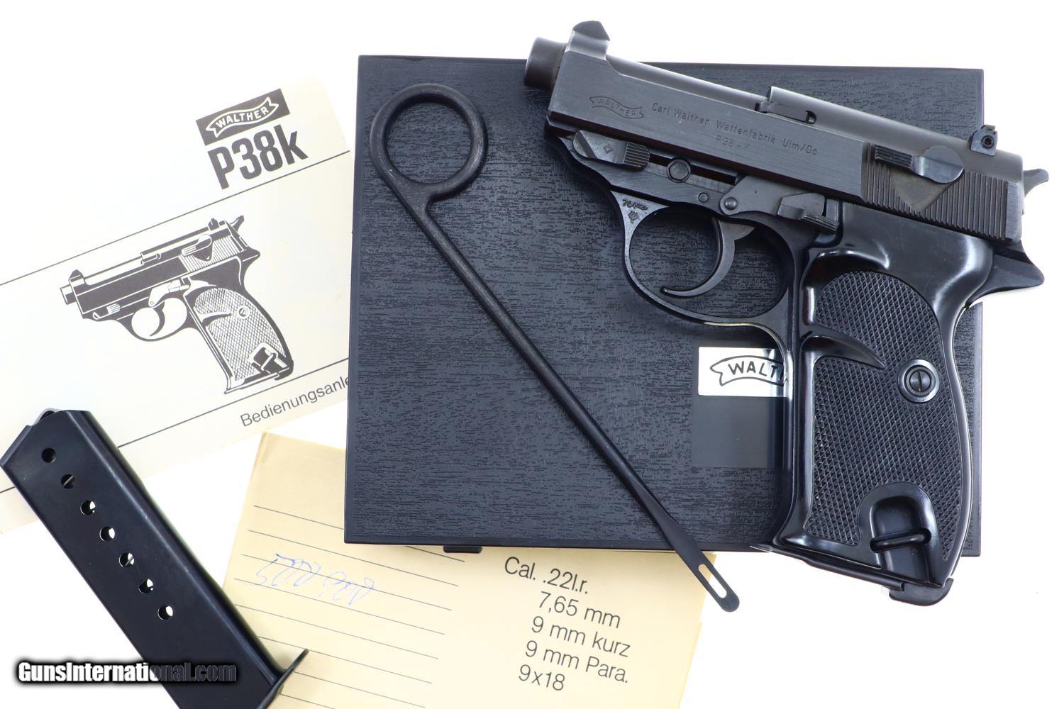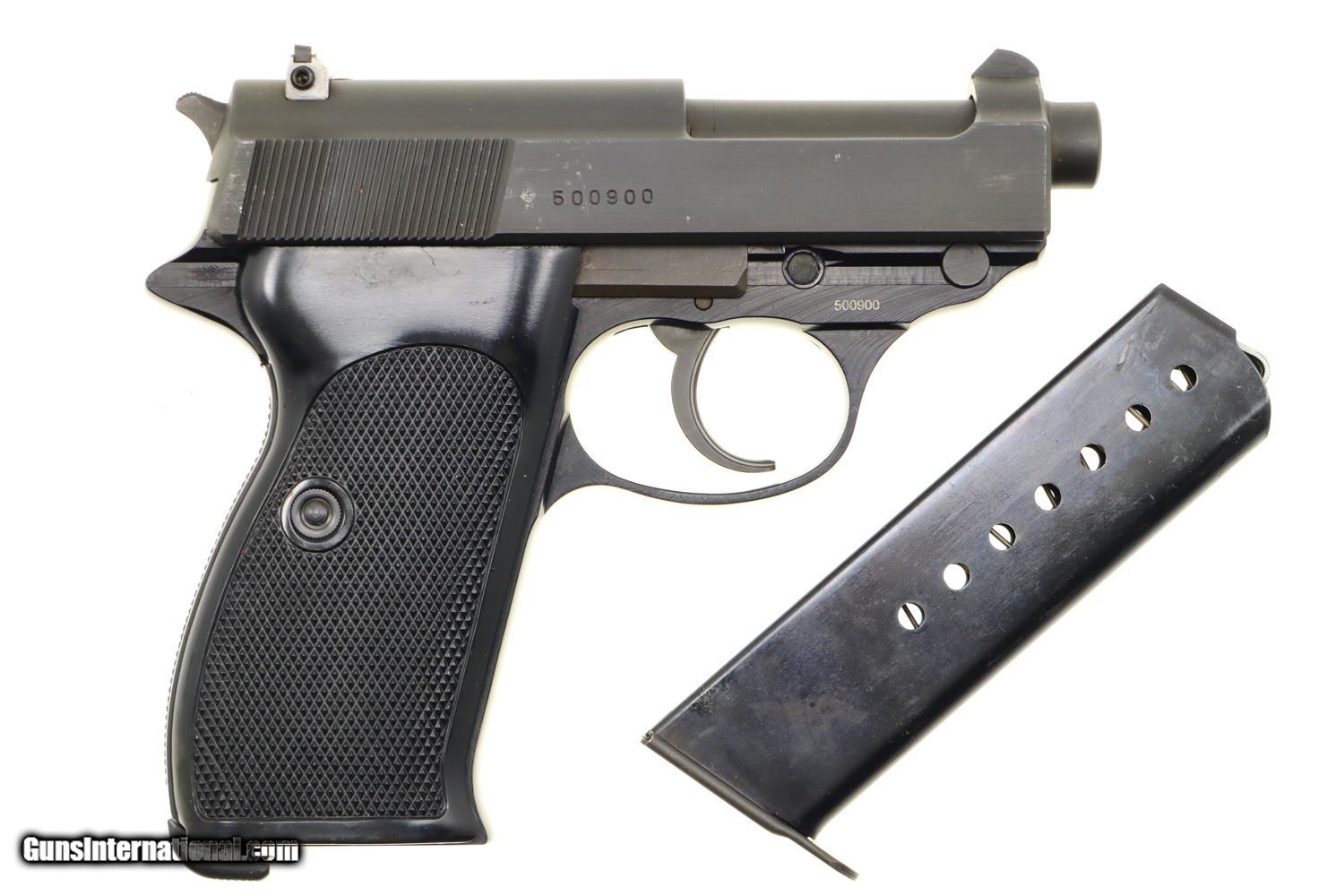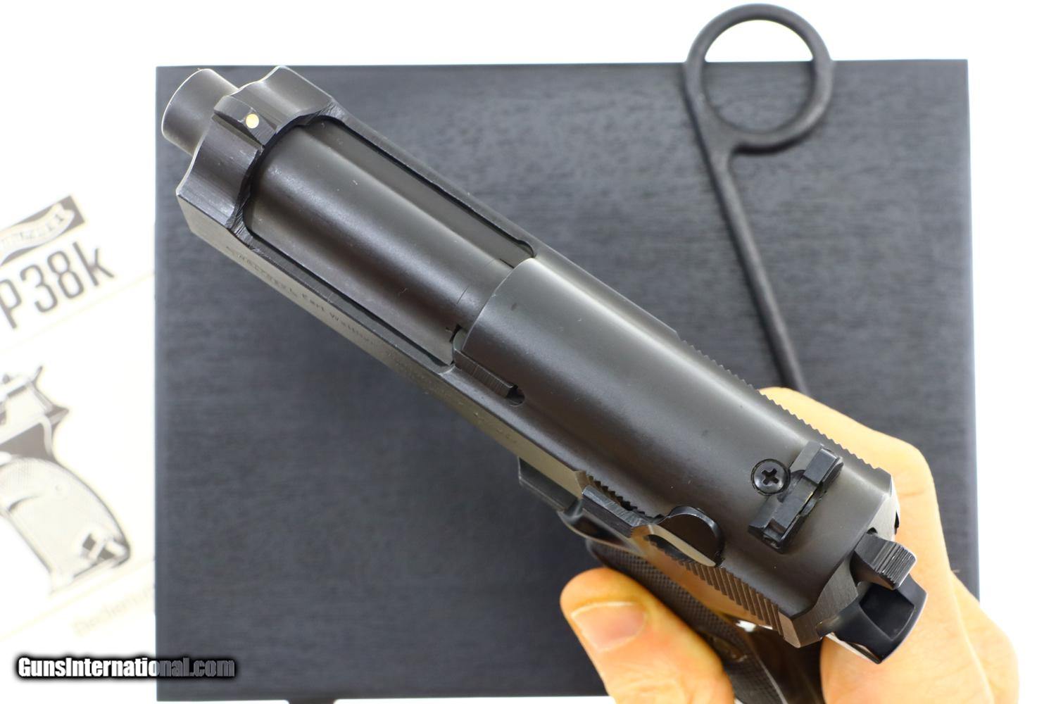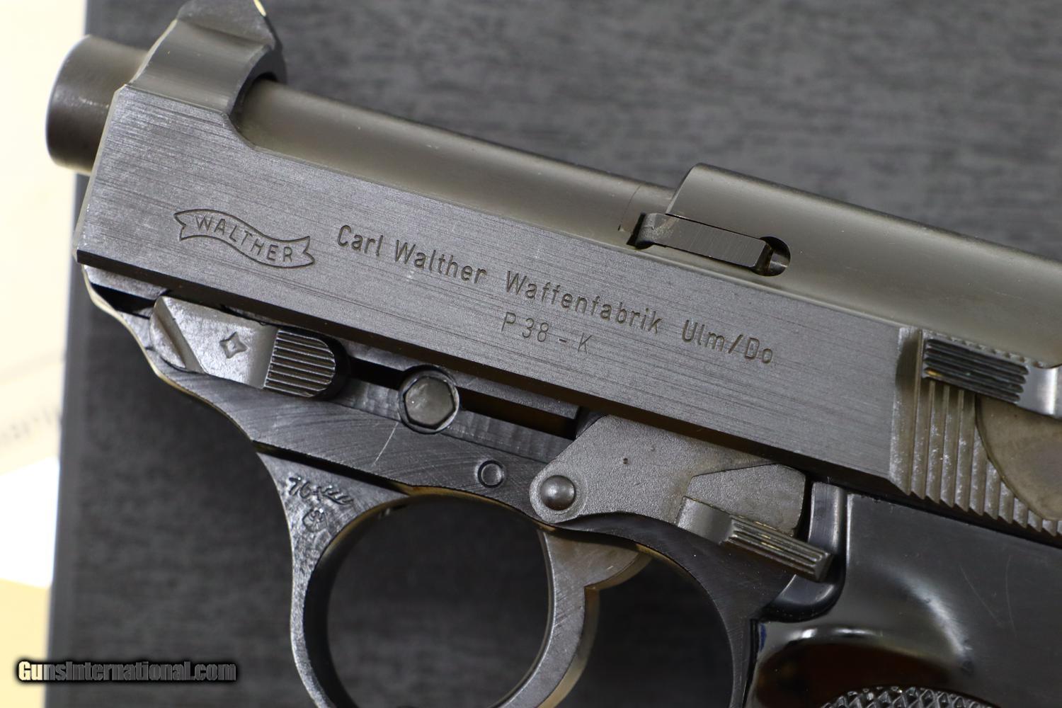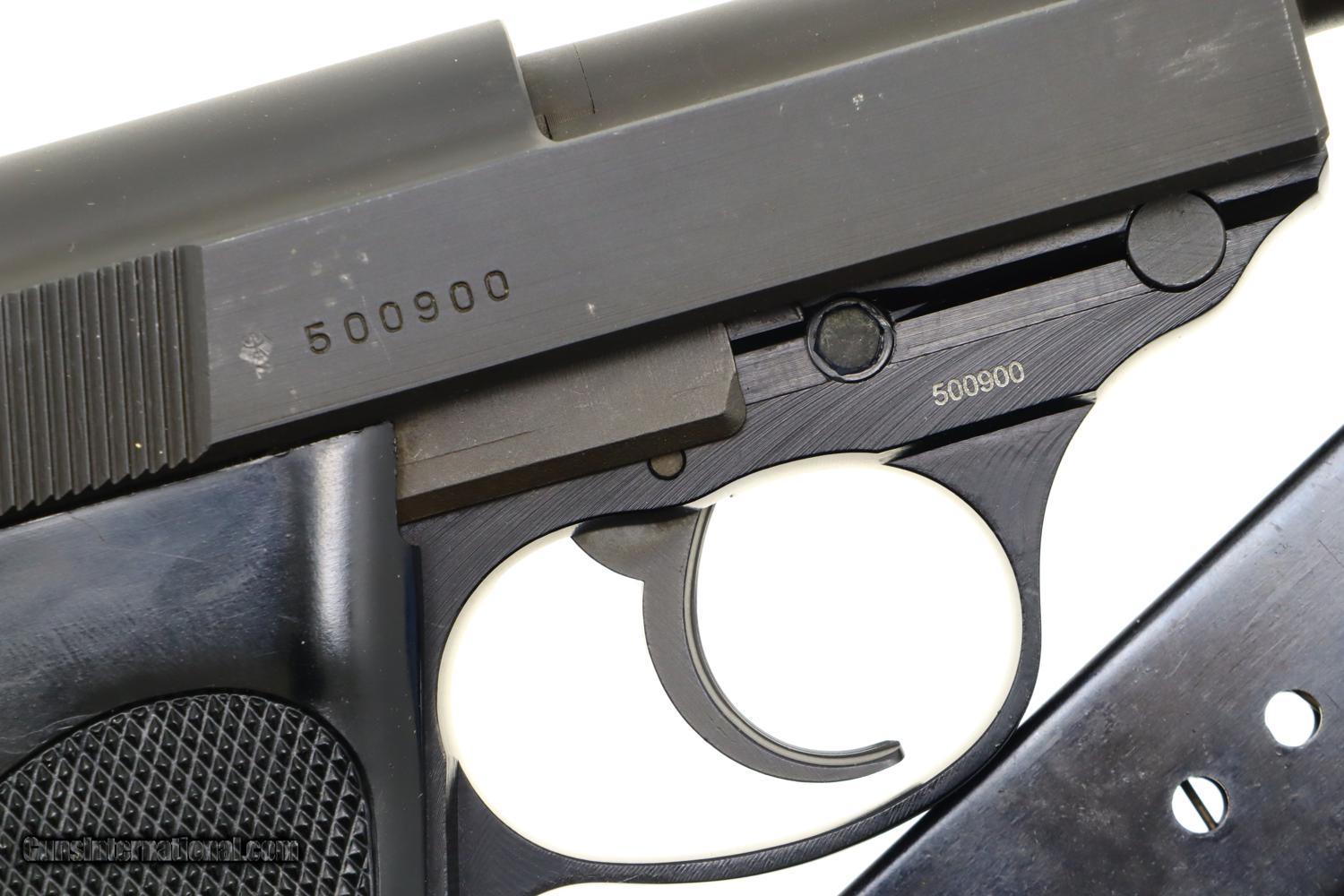 Description: Standard P38-K with 2.75? barrel. White insert front sight mounted on forward slide bridge. Horizontally adjustable rear sight. Left side of frame with Walther banner followed by single line Walther address surmounting the “P38-K” designation. The full serial number is on the right side of the slide. Production year 1976. Proof marked on left side upper trigger guard. Matte finish barrel, slide, and all small parts except the decocking lever and black anodized alloy frame. Two piece checkered walnut grips with left panel recessed for lanyard loop. Two high polish commercial magazines each marked with the Walther banner over P38 9mm. Standard black plastic cleaning rod. Crisp test target and instruction booklet. Shipping box with minimal external scuffs. Synopsis: Super scarce Walther P38-K, as new, with black plastic grips, spare magazine, cleaning rod, P38-K instruction booklet, numbered test target, in original black plastic factory box with matching orange/black P38-K end label. Condition: Fantastic, 99++%, near new condition that equally applies to all accessories. Mirror bore. Perfect manual mechanics. It would be virtually impossible to upgrade this P38-K that does not have the "Interarms" logo. A wonderful addition to any Walther collection. ~~Insured shipping fee of $75; most packages shipped using FedEx 2nd Day.~~ SOLD Manufacturer: Walther Serial Number: 500900 Caliber Info: 9 mmP |