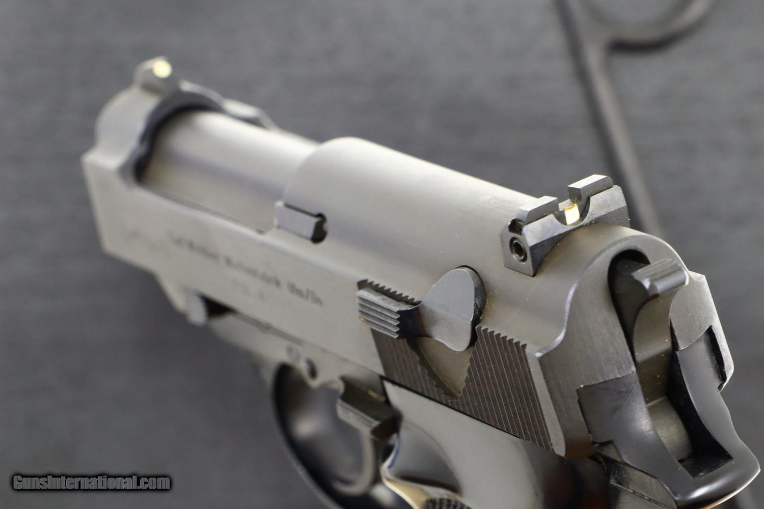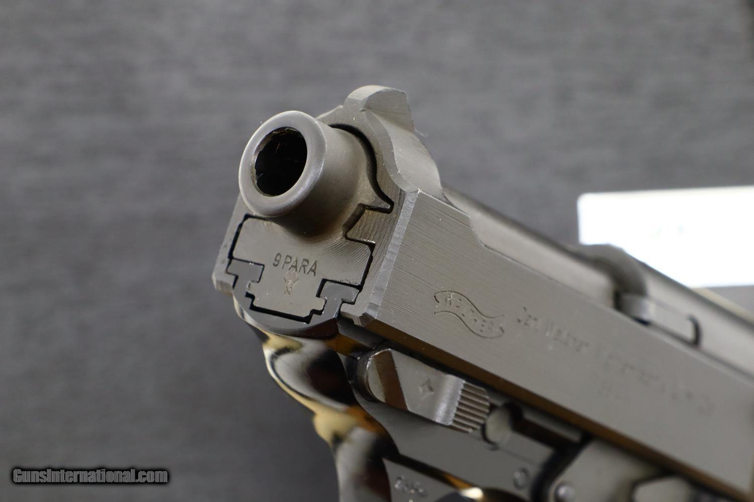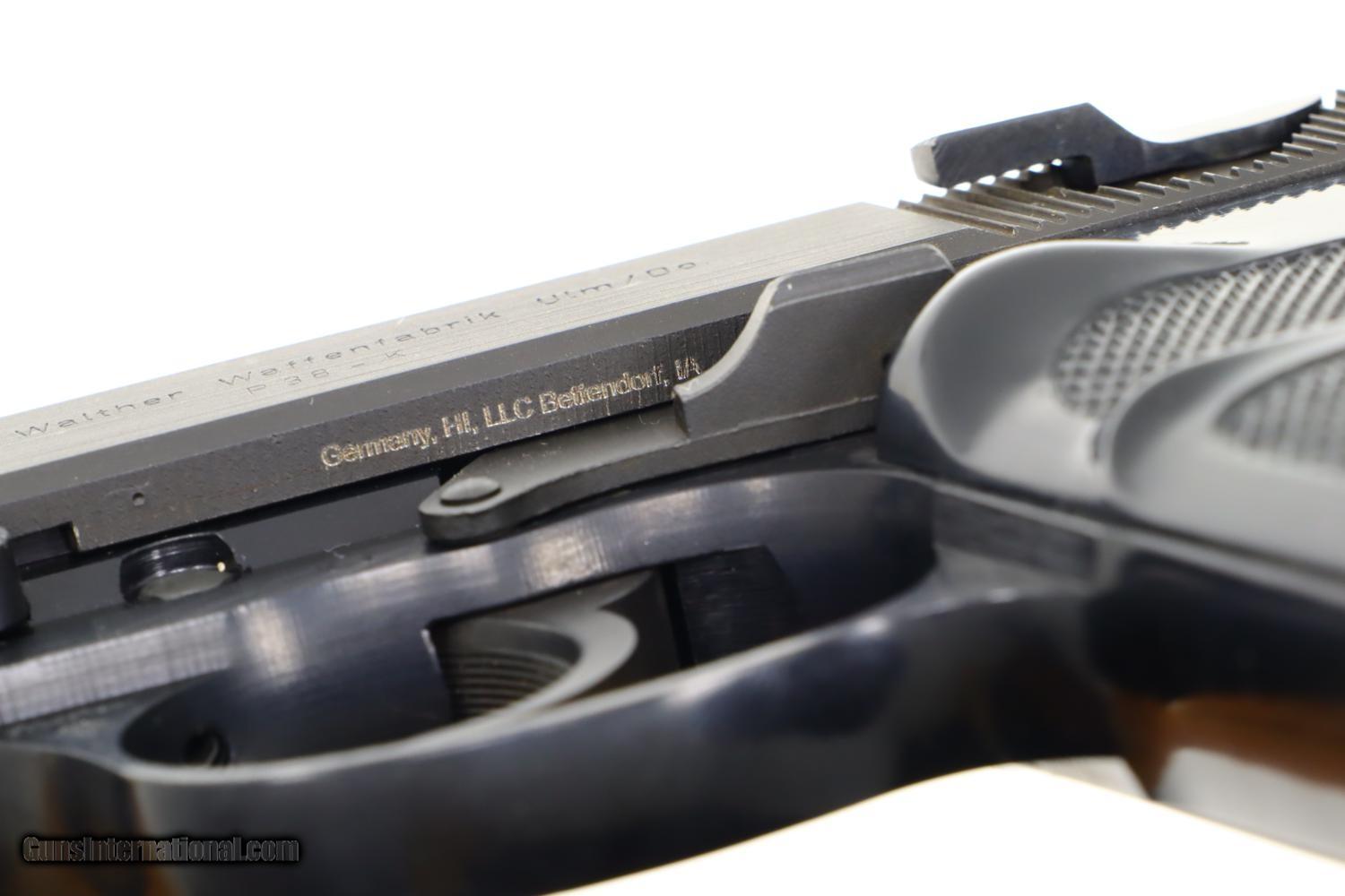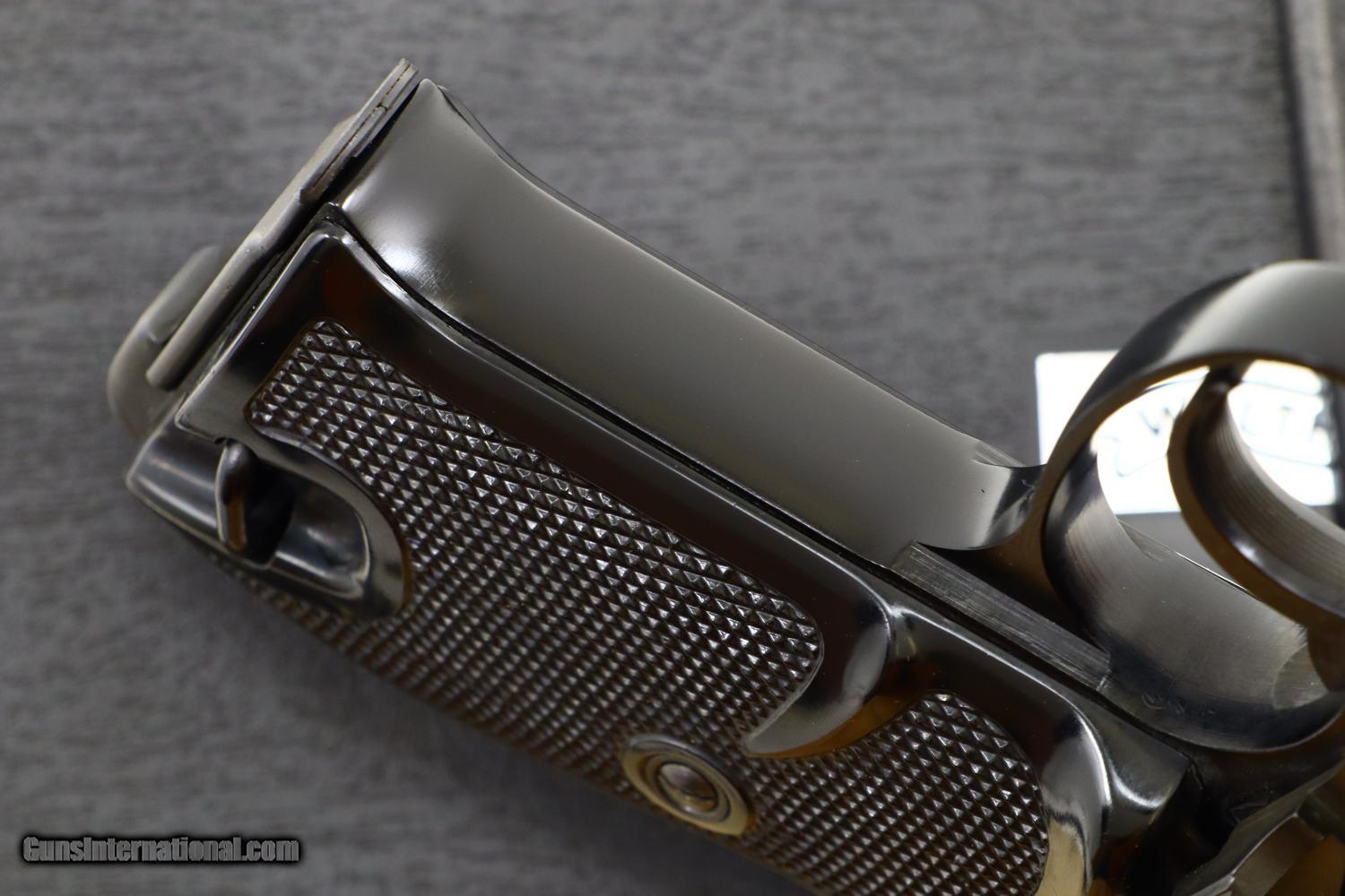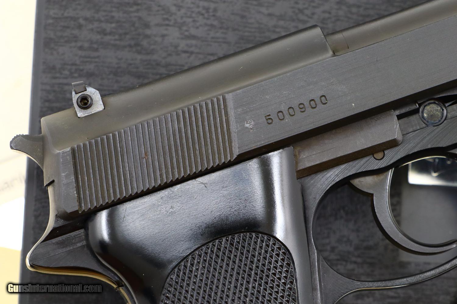 Description: Standard P38-K with 2.75? barrel. White insert front sight mounted on forward slide bridge. Horizontally adjustable rear sight. Left side of frame with Walther banner followed by single line Walther address surmounting the “P38-K” designation. The full serial number is on the right side of the slide. Production year 1976. Proof marked on left side upper trigger guard. Matte finish barrel, slide, and all small parts except the decocking lever and black anodized alloy frame. Two piece checkered walnut grips with left panel recessed for lanyard loop. Two high polish commercial magazines each marked with the Walther banner over P38 9mm. Standard black plastic cleaning rod. Crisp test target and instruction booklet. Shipping box with minimal external scuffs. Synopsis: Super scarce Walther P38-K, as new, with black plastic grips, spare magazine, cleaning rod, P38-K instruction booklet, numbered test target, in original black plastic factory box with matching orange/black P38-K end label. Condition: Fantastic, 99++%, near new condition that equally applies to all accessories. Mirror bore. Perfect manual mechanics. It would be virtually impossible to upgrade this P38-K that does not have the "Interarms" logo. A wonderful addition to any Walther collection. ~~Insured shipping fee of $75; most packages shipped using FedEx 2nd Day.~~ SOLD Manufacturer: Walther Serial Number: 500900 Caliber Info: 9 mmP |