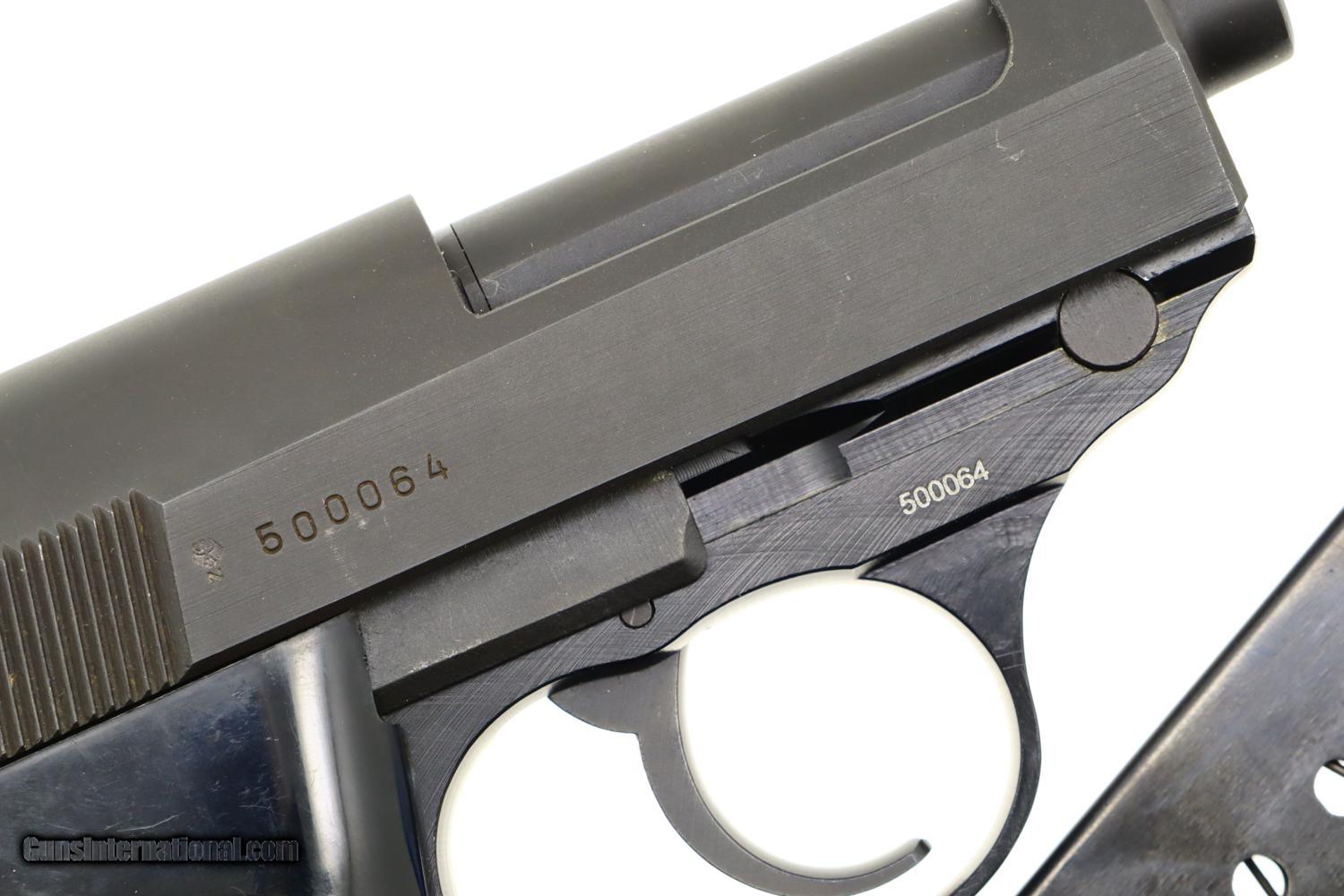 Description: This P38-K is a super early gun, the 64th made, this example having been proofed in 1974. Shipped in a standard P38 wood grain box with a factory matching label, the “K” having been hand written. This is the same kind of adjustment found on the test target, again numbered to the pistol, but with a hand written “K” suffix, likely a transitional effort before Walther made up its standard stamps and labeling. The gun itself has standard features with a white insert front sight mounted on forward slide bridge. Horizontally adjustable rear sight. Left side of frame with Walther banner followed by a single line Walther address surmounting the “P38-K” designation. The full serial number is on the right side of the slide. Production year 1974. Proof marked on left side upper trigger guard. Matte finish barrel, slide, and all small parts; black anodized alloy frame. Two piece checkered black plastic grips with left panel recessed for lanyard loop. Two high polish commercial magazines each marked with the Walther banner over P38 9mm. Crisp test target and instruction booklet. Standard P38 shipping box with external scuffs. Synopsis: Super scarce and super early Walther P38-K, near new, with black plastic grips, spare magazine, P38-K instruction booklet, numbered test target, in wood grain box with matching orange/black P38-K end label. Condition: Fantastic, 99+%, near new condition that equally applies to the grips and magazines. Mirror bore. Perfect manual mechanics. A wonderful, early P38 whose condition would be impossible to improve upon, especially nice in having its numbered test target and transitional box. ~~Insured shipping fee of $75; most packages shipped using FedEx 2nd Day.~~ SOLD Manufacturer: Walther Serial Number: 500064 Caliber Info: 9mmP |