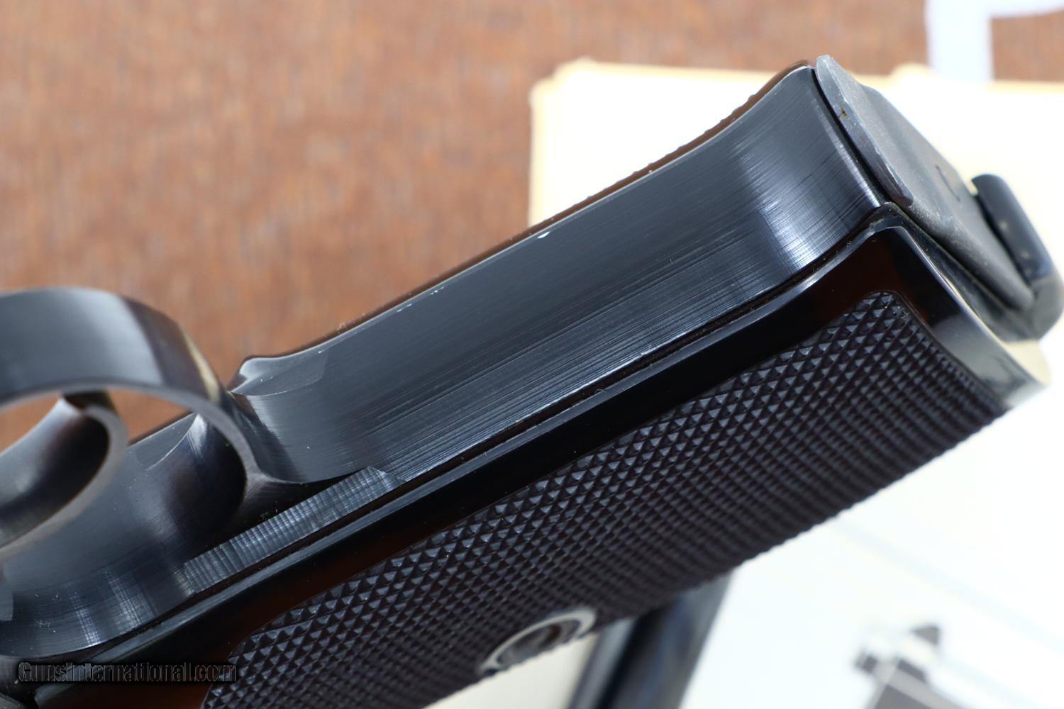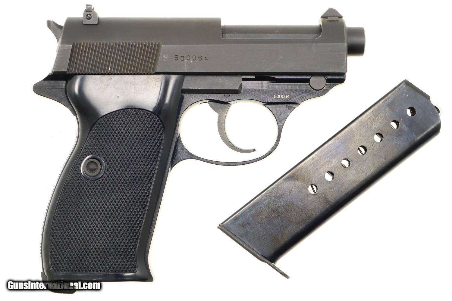 Description: This P38-K is a super early gun, the 64th made, this example having been proofed in 1974. Shipped in a standard P38 wood grain box with a factory matching label, the “K” having been hand written. This is the same kind of adjustment found on the test target, again numbered to the pistol, but with a hand written “K” suffix, likely a transitional effort before Walther made up its standard stamps and labeling. The gun itself has standard features with a white insert front sight mounted on forward slide bridge. Horizontally adjustable rear sight. Left side of frame with Walther banner followed by a single line Walther address surmounting the “P38-K” designation. The full serial number is on the right side of the slide. Production year 1974. Proof marked on left side upper trigger guard. Matte finish barrel, slide, and all small parts; black anodized alloy frame. Two piece checkered black plastic grips with left panel recessed for lanyard loop. Two high polish commercial magazines each marked with the Walther banner over P38 9mm. Crisp test target and instruction booklet. Standard P38 shipping box with external scuffs. Synopsis: Super scarce and super early Walther P38-K, near new, with black plastic grips, spare magazine, P38-K instruction booklet, numbered test target, in wood grain box with matching orange/black P38-K end label. Condition: Fantastic, 99+%, near new condition that equally applies to the grips and magazines. Mirror bore. Perfect manual mechanics. A wonderful, early P38 whose condition would be impossible to improve upon, especially nice in having its numbered test target and transitional box. ~~Insured shipping fee of $75; most packages shipped using FedEx 2nd Day.~~ SOLD Manufacturer: Walther Serial Number: 500064 Caliber Info: 9mmP |