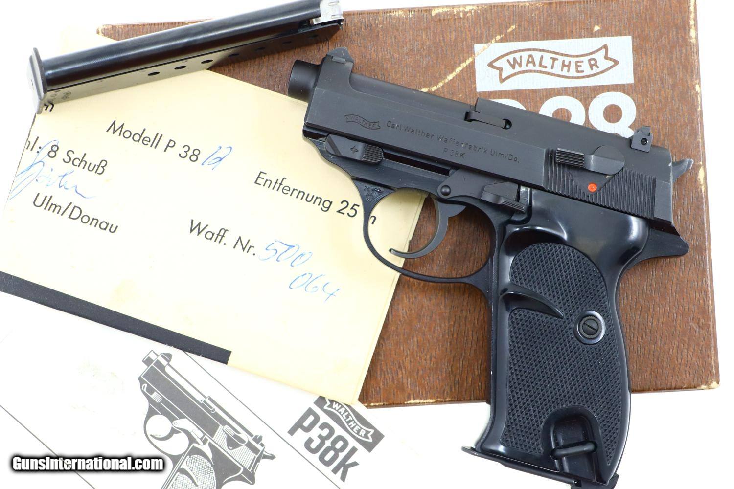 Super scarce and super early Walther P38-K, near new, with black plastic grips, spare magazine, P38-K instruction booklet, numbered test target, in wood grain box with matching orange/black P38-K end label.