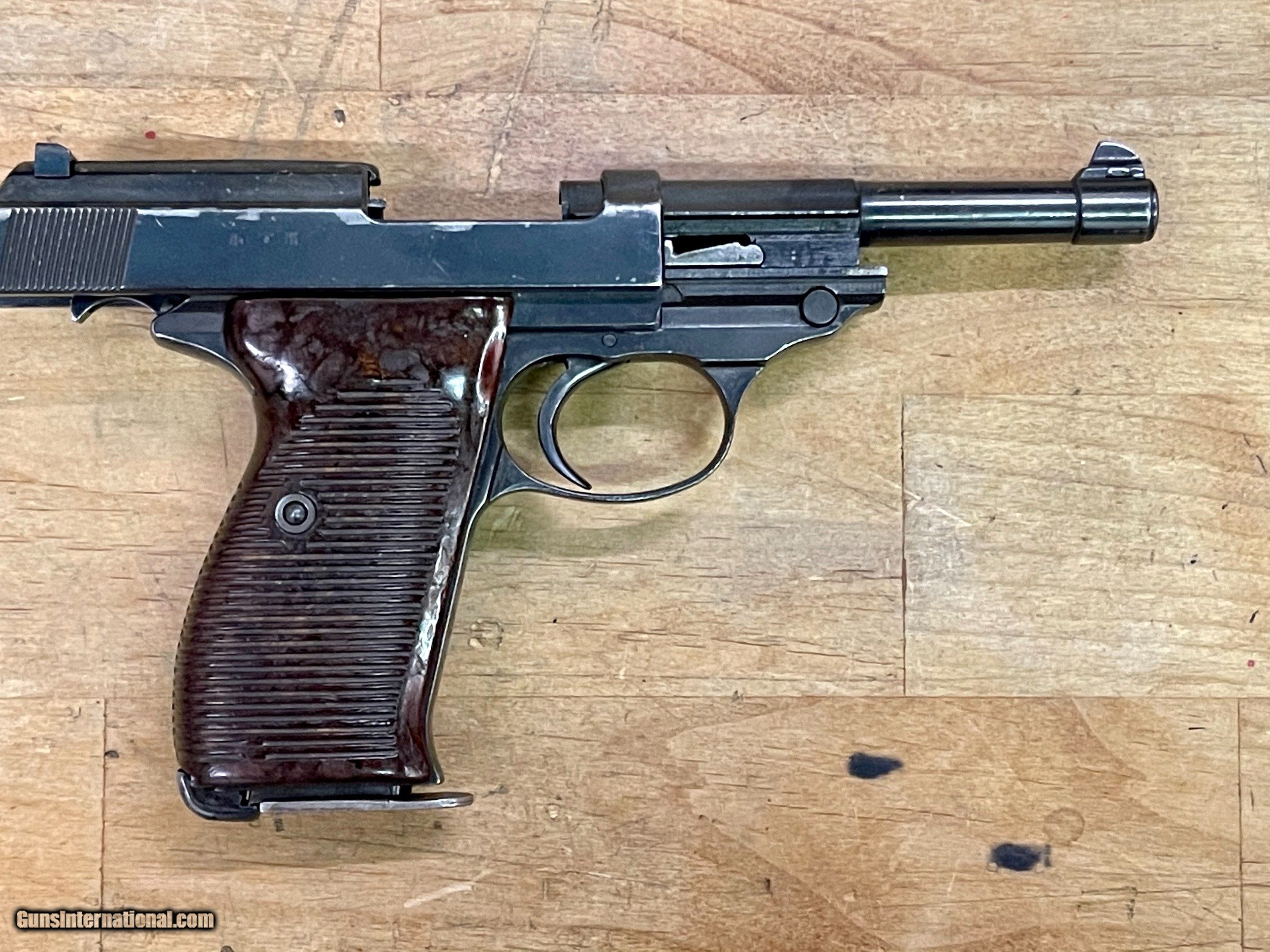 Description: SOLD PENDING PAYMENT...TAKING BACKUP OFFERS. Make: Walther Model: P.38 Serial Number: 5164a Year of Manufacture: 1945 Caliber: 9mm Parabellum Action Type: Single or Double Action Semi-Auto fed by Removable Magazine. Markings: The left side of the slide is marked "P.38", “5164 a" and "ac 45”. The right is marked with two eagle over "359" waffenamts, one to each side of an eagle clutching swastika proof. The left of the frame is marked "5164 A" and with eagle over "359" waffenamt above the trigger guard. The front face of the barrel assembly is marked "5164 / a", the left is marked with eagle over "359" waffenamt at the front and with eagle clutching swastika proof at the rear. The right of the locking block is marked with eagle over "359" waffenamt, the left with eagle clutching swastika proof and a six-pointed star, the bottom with "164 / A". Barrel Length: 5” Sights / Optics: The front sight is a blade dovetailed to a boss at the front of the barrel, marked "4" on the left. The rear sight is a "U"-notch dovetailed to the rear of the slide. Stock Configuration & Condition: The grips are two-piece serrated black Polyamid 6 panels. The grips have light handling wear with some scattered nicks and scuffs, most in the smooth borders. The serrations are well defined. There are no chips or cracks. Overall, the grips are in normal wear condition. Type of Finish: Blued, some small scratches and wear marks throughout. Finish Originality: Original Bore Condition: The bore is mostly bright and the rifling is sharp. Overall Condition: This pistol retains about 85% of its metal finish. The finish is thinning at some edges. There are some scattered light nicks and scuffs with a couple of more notable scratches on each slide flat near the front. The action shows light operational wear. The screw head is sharp. The markings are clear. Overall, this pistol is in about Fine condition. Mechanics: The action functions correctly. We did not fire this pistol. As with all used firearms, a thorough cleaning may be necessary to meet your maintenance standards. Box, Paperwork & Accessories: This pistol comes with a single 8-round magazine marked "P38v / U" on the left. The magazine has light operational wear, intact feed lips and a strong spring, in about Very Good-Fine condition. Our Assessment: The P38 occupies a significant place in history. It was the first locked breech pistol to have a single action/double action trigger. It was adopted by the German Army as their standard issue sidearm and continued to be issued after the war in both West and East Germany. This P.38 pistol is a late-war example made by Walther in 1945. It shows several characteristics of late-war Walther production including a capital "A" used for that suffix due to worn or missing lower-case dies, small parts which were installed in the white, and simplified three-groove hammer spur. It has the correct markings, matching serial numbers, and has made it here to America without an import mark. The pistol is in about Fine condition retaining about 95% of its metal finish. It retains a nice bore and the mechanics are strong. This will make a great addition to a WWII or P.38 collection. NO PAYPAL! PAYMENT: -Payment must be recieved within 10 days of purchase. 3% additional charge for credit card processing. SHIPPING & HANDLING: -$30 for handguns and $45 for long guns SHIPPING FIREARMS: -Firearms shipped to FFL dealer only -We will ship upon receipt of payment and signed legible copy of dealer's FFL via Fax, Mail or E-mail. SALES TAX: -Florida residents add 7.5% sales tax. PRODUCT: -We operate a gun shop which means that every item is for sale in our store and it may have already been sold when you contact us. NEW GUNS: -On new Firearms we may use file photos instead of the actual gun. CONTACT: -Contact me with any and all questions. We want you to be happy with your purchase. PHONE #: (904) 271-5270 STORE HOURS: Mon-Fri: 11p-6pm Sat: 9a-3p BUYER: -It is Buyer's responsibility to ensure that the weapon is LEGAL to own in your city/state. SOLD Handgun Caliber: 9x19mm Parabellum (9mm Luger, 9x19mm NATO) Manufacturer: Walther Model: P-38 |