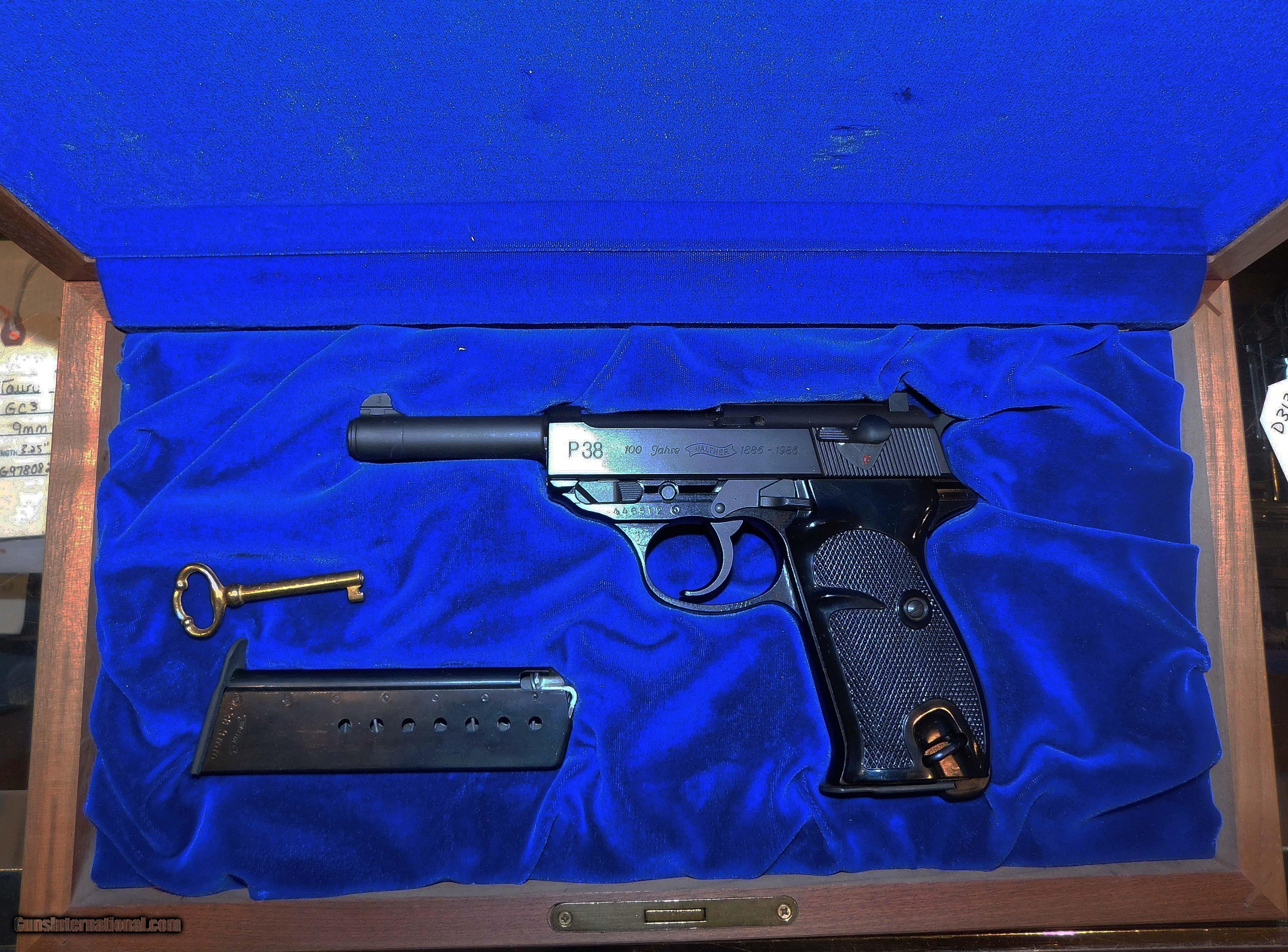 Description: WALTHER P38 IN 9MM CAL., WITH 5" BARREL. COLOR MATTE. CONDITION 98% LIKE NEW UNFIRED. SERIAL NUMBER 446512. WALTHER MODEL P38 (100 YEAR 1886-1986 1 OF 1000 SPECIAL PRESENTATION EDITION) IN 9MM CALIBER, COMES WITH BLUE VELVET LINED PRESENTATION OAK CASE WITH SECOND FACTORY MAGAZINE AND KEY, 98% LIKE NEW UNFIRED OVERALL CONDITION, OUR STOCK # D3132 SOLD |