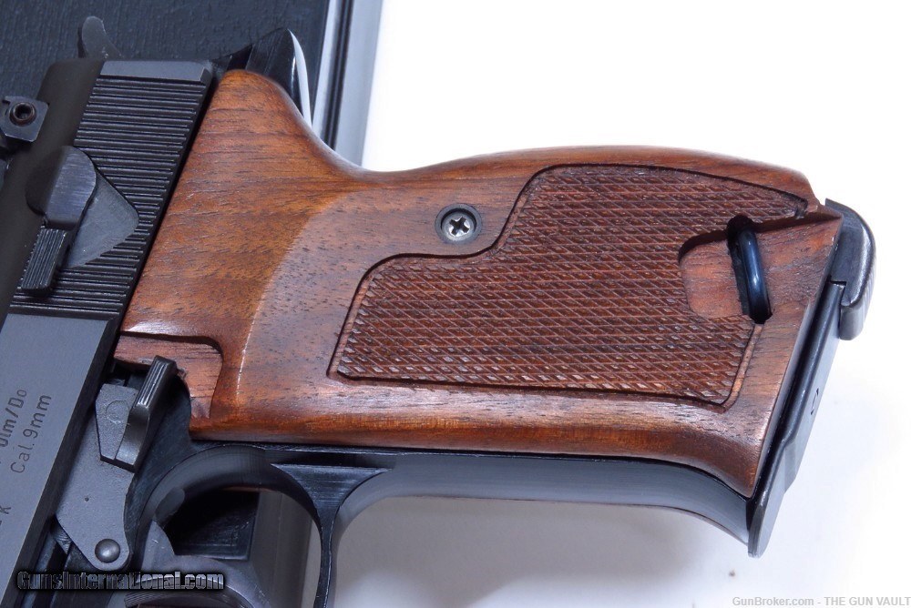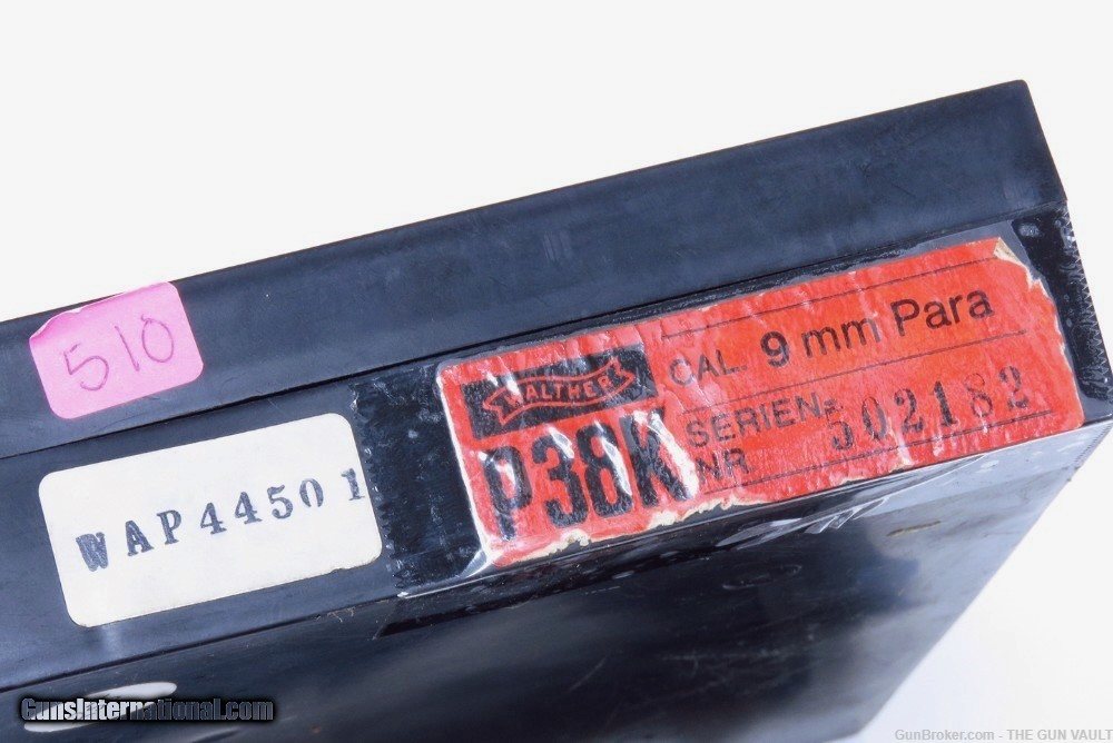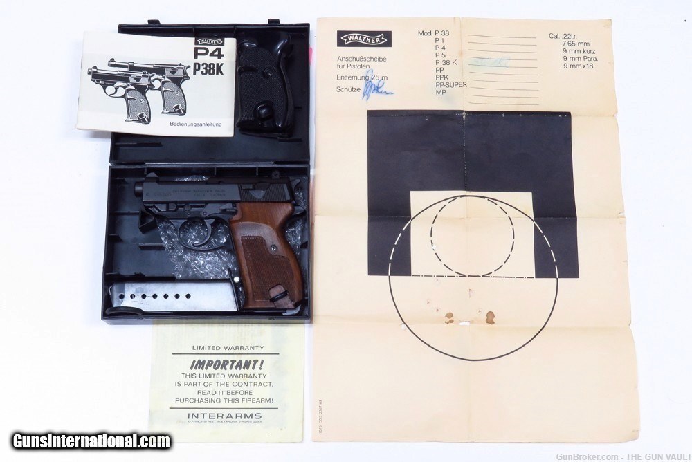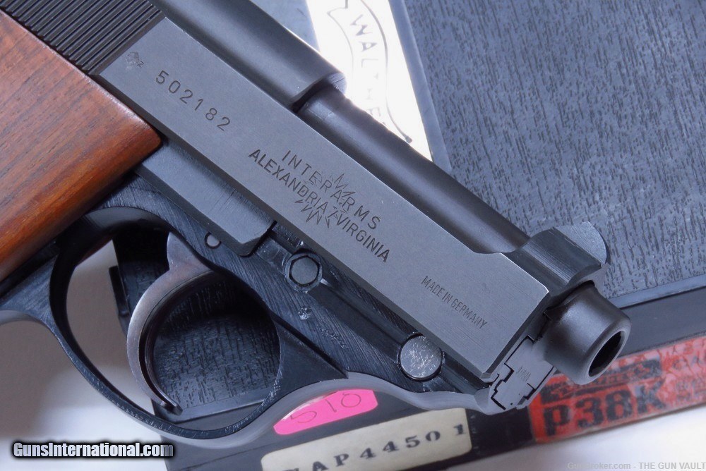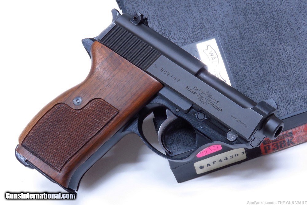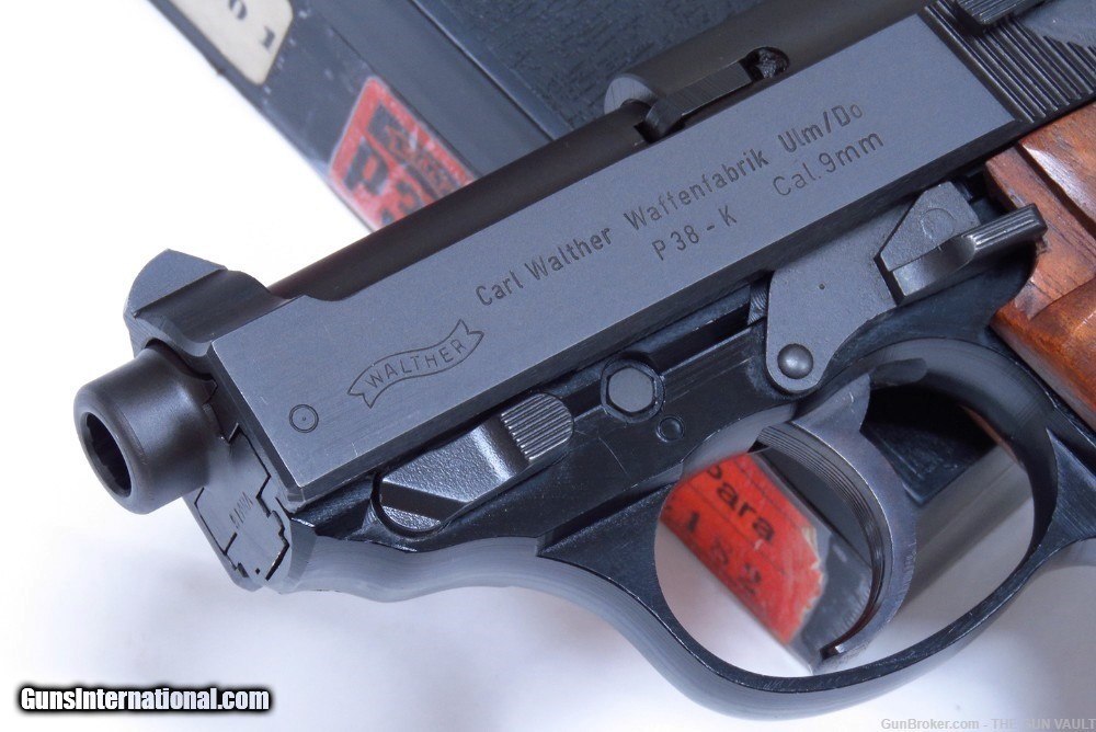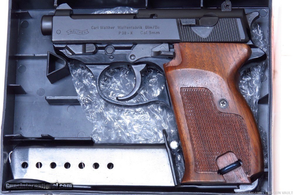 Description: HIGHLY COLLECTIBLE & SUPER SCARCE Walther model P38K 9mm semi-automatic pistol New In Box (NIB). This is a rare variant of Walther P38 pistol, made with a shortened 2.5 inch barrel in 1981 in West Germany. Only 2,600 of these interesting pistols were made in the 1970s-80s and even fewer were actually imported into the US. One of, if not THE, most desirable collector's Walther found in the US market. She is accompanied by the original clamshell box with the factory label matching the pistol's frame, both factory magazines, cleaning rod, all of the paperwork including the test target, original black composite stocks and a tastefully upgraded set of gorgeous walnut target grips. Her condition is second to none as pictured. There are only the faintest handling marks found on this scarce German masterpiece. These are EXTREMELY RARE to find in this condition. They typically always have finish loss on the sharp edges. All of the mechanics are crisp. The pistol shows factory test fired only. Price: $3,195 Firm Shipped Subject to prior sale elsewhere. Payment by:
