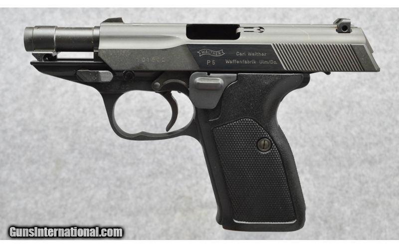 Description: Walther Model P5 Standard chambered in 9mm Luger. Very high condition German production imported by Interarms. Includes factory box, test target, extra magazine and manual. SOLD Caliber Info: 9mm Luger Metal Condition: Blued slide, black alloy frame shows few minimal scratches Bore Condition: Bright and Sharp Barrels: 3 1/2 Inch Triggers: DA/SA, Decocking Lever Stock: Checkered plastic Weight: 28 Ozs Sights: Windage adjustable rear sight, Dotted front Item Location: Buda, TX |