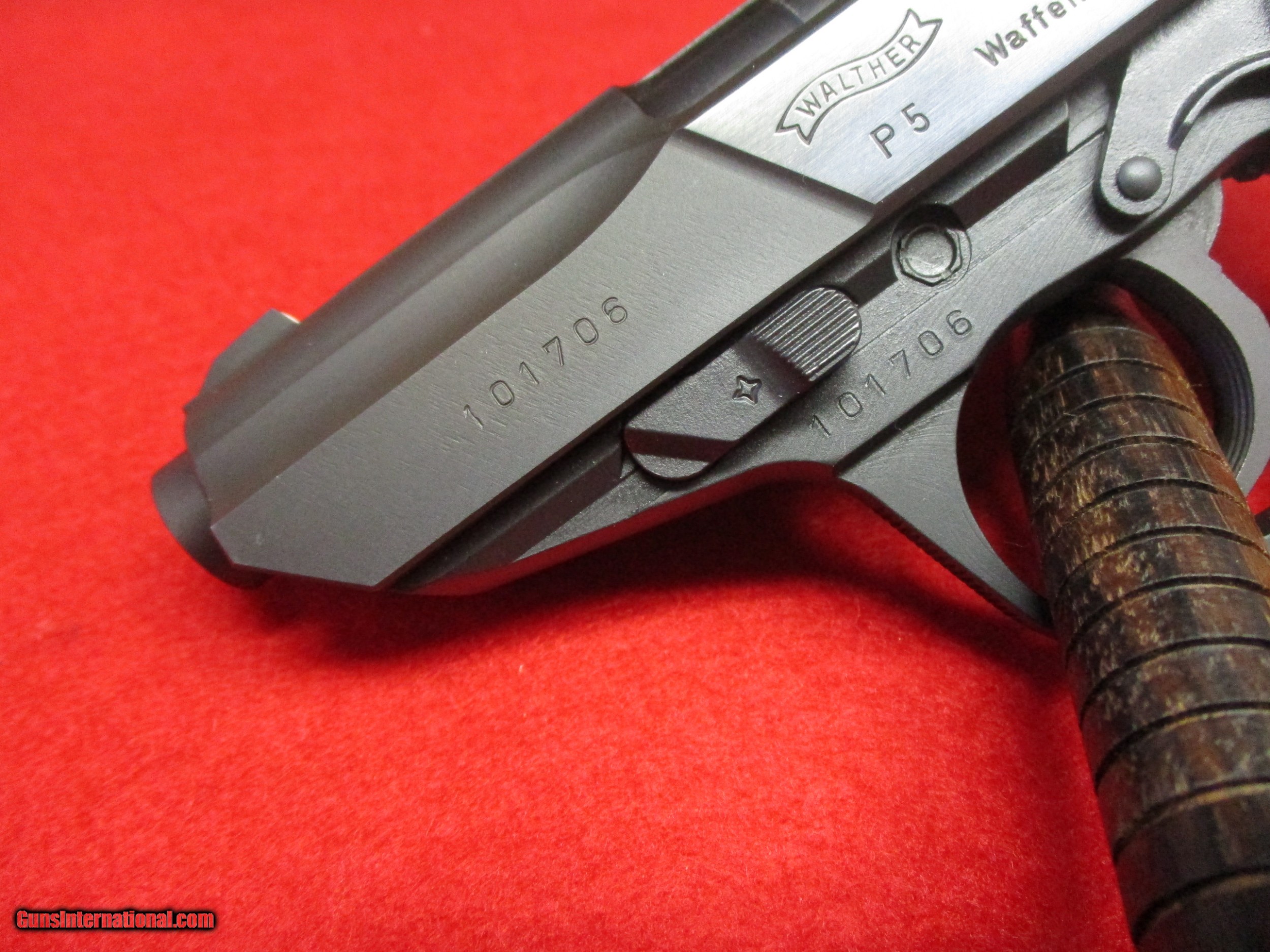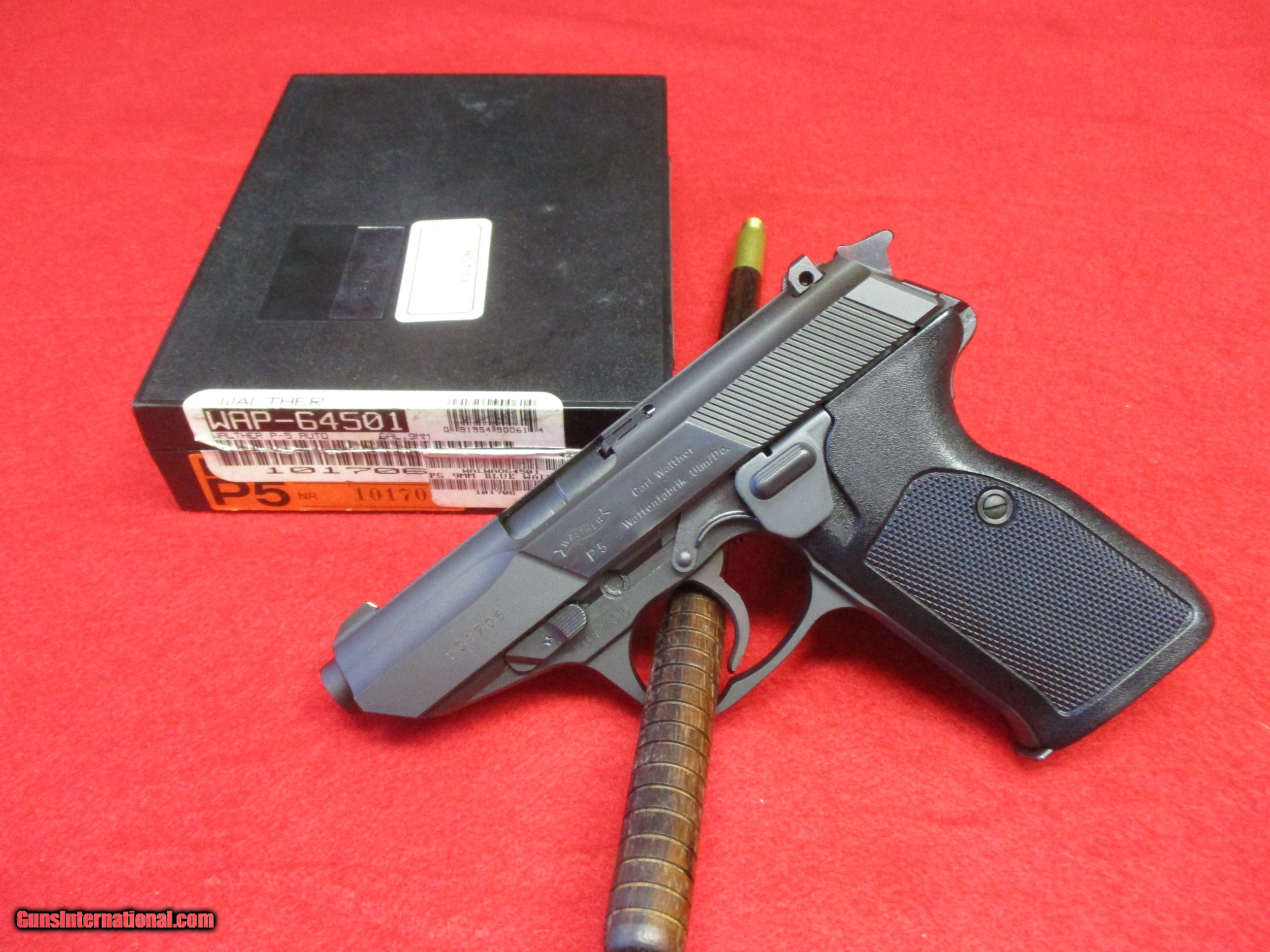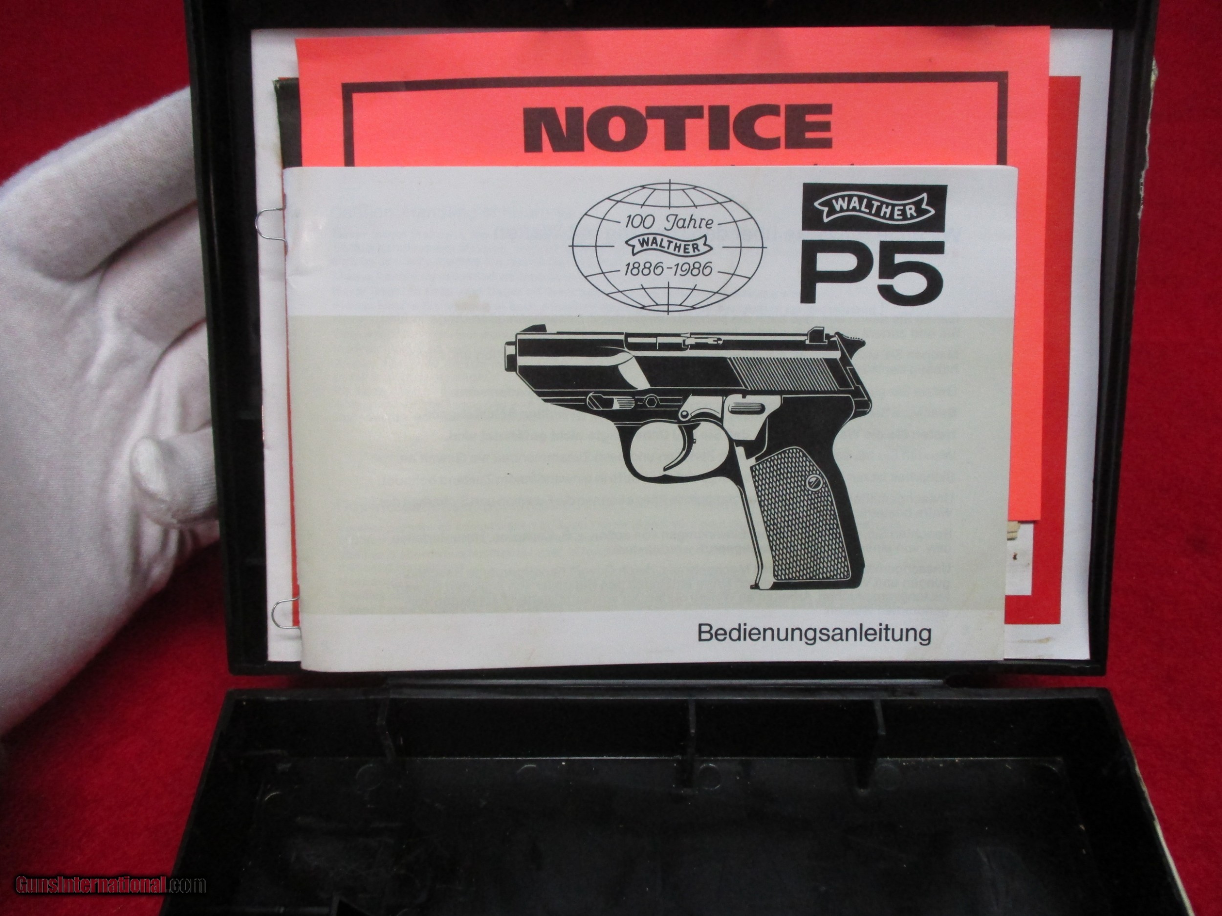 Description: The P5 was designed to replace the Walther P38/P1 pistols in use by German police. It features a shortened barrel, longer slide, and a slide release that also functions as the decocker. It utilizes the P5 magazine, which is similar to the original P38/P1 with some minor differences. The pistol operates as a DA/SA action, with the first shot being double-action and the remaining shots being fired in single-action. The pistol was imported into the U.S. by Interarms of Alexandria, Virginia. It comes in its original box with paperwork and two 8-round magazines. The pistol itself is in excellent condition. The bore has some residue in it but is in excellent condition otherwise. The bluing is in pristine condition. The P5 would make a nice addition to any Walther collection. SOLD Manufacturer: Walther Model: P5 Serial Number: 101706 Caliber Info: 9mm Parabellum aka 9mm Luger Condition: Used - Excellent Metal Condition: Excellent - Bluing 98% or better Bore Condition: Excellent - Minor Residue, no rust or pitting Barrels: 3.9 inches (100mm) Barrel Type: Short Recoil, Locked Breech Action: DA/SA Finish: Blued Sights: Fixed Extras: Spare Mag, Paperwork Case: Original Walther box |