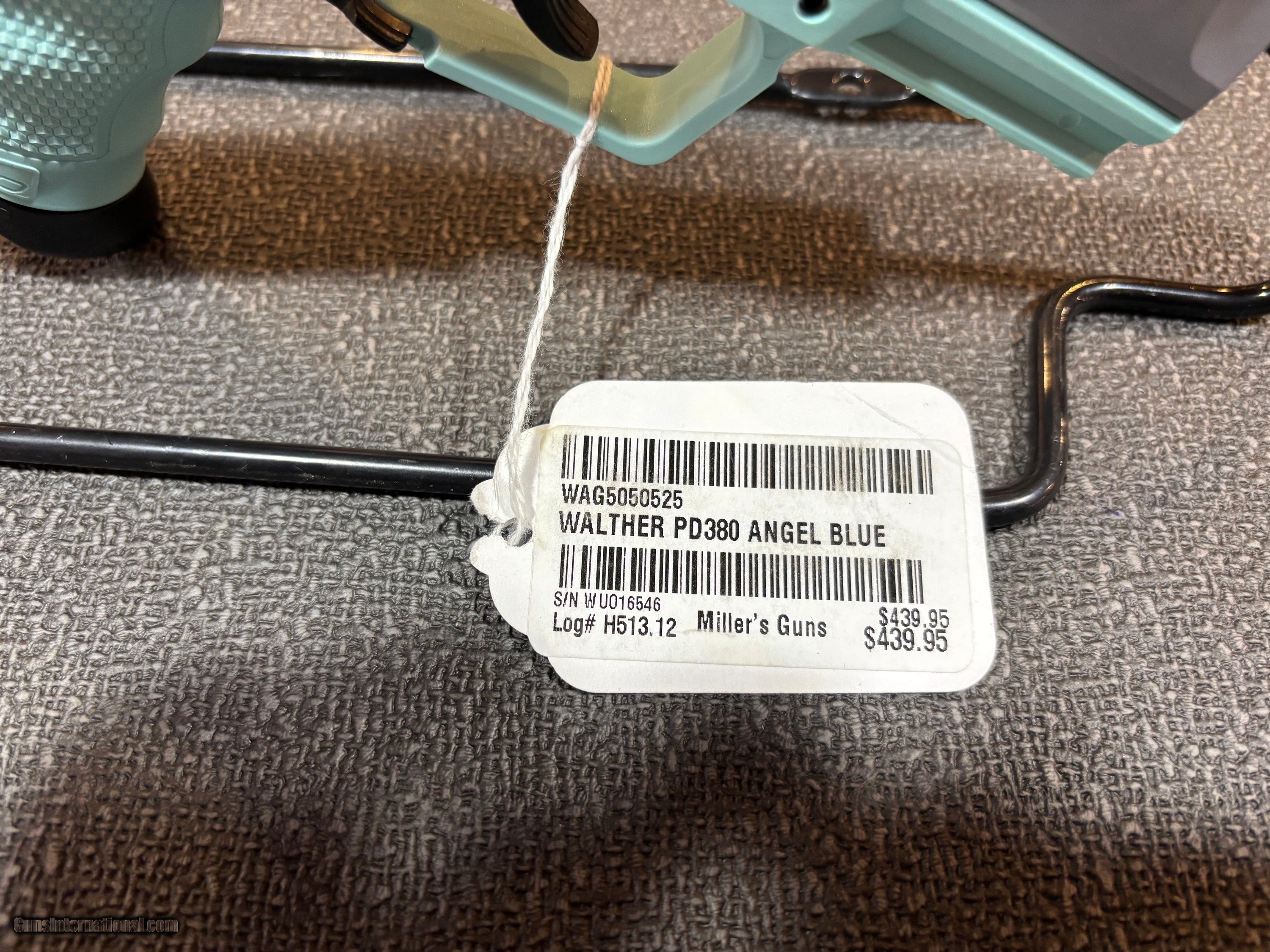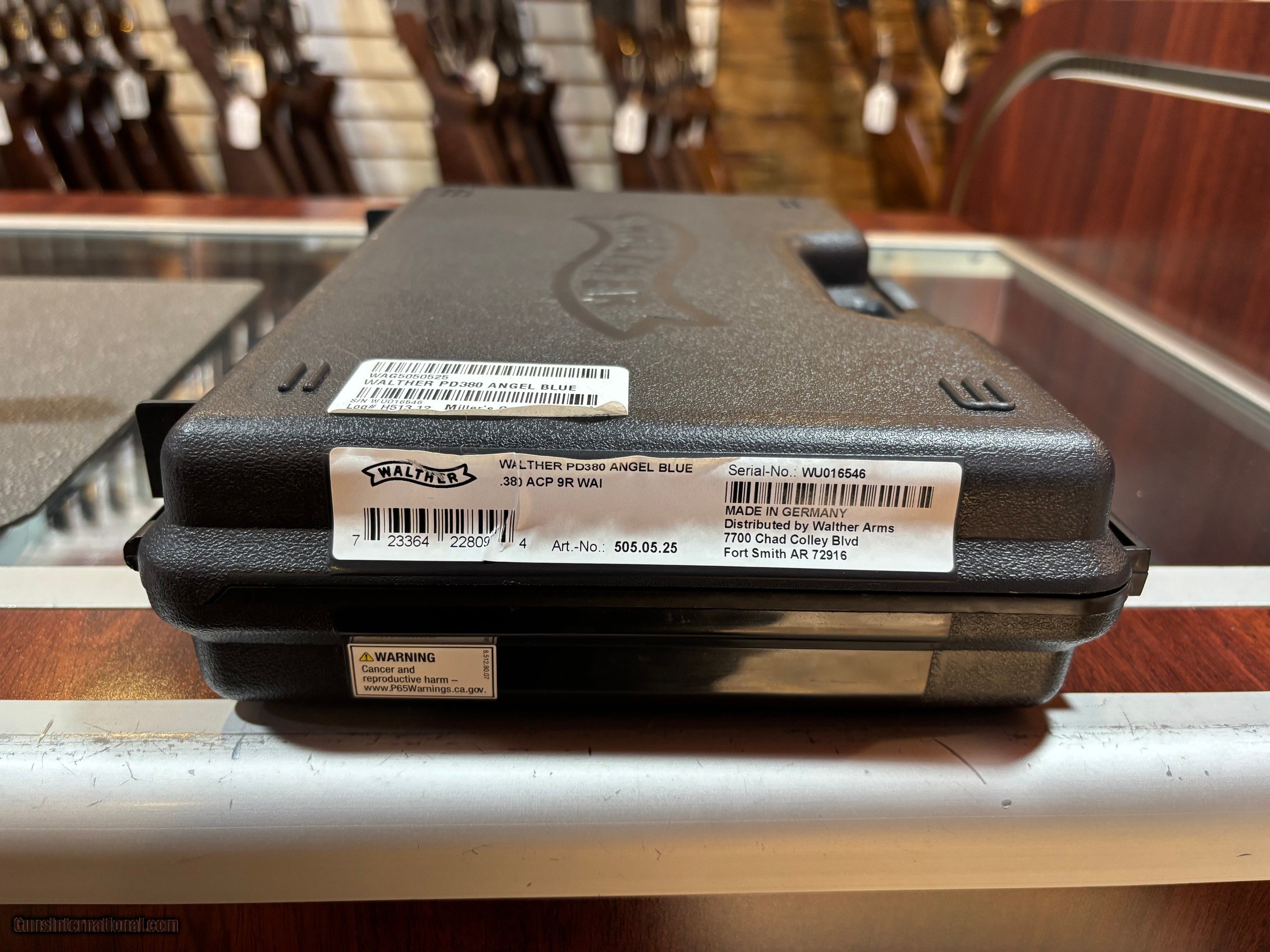 Description: Walther PD380 Angel blue .380acp 9 round capacity (2) magazines included DA/SA Manual safety SOLD Handgun Caliber: .380 ACP (9x17mm Browning Short) Manufacturer: Walther Model: PD380 Serial Number: WU016546 Barrel Length: 3.7 Condition: NEW |