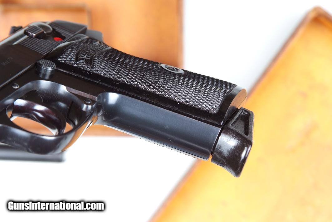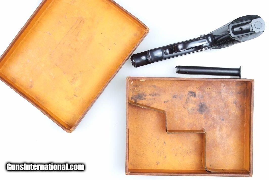 Description: Standard configuration Walther PP, .22LR, with fixed front sight, drift adjustable rear sight. Left side of slide with usual Walther address reflecting manufacturer, model, and caliber. Full serial number on right side of frame. Eagle/N proofing on exposed barrel boss, right side of barrel near muzzle. Matching scribed slide. Standard black plastic grips and original magazines, one with black finger extension. Correct gold/woodgrained shipping box green/white label denoting .22, serial number on right side has been neatly removed. Synopsis: Walther, PP .22, German, Early Wartime Commercial, Boxed. Condition: Impressivve, 99+% bright original salt blue with just a few sharp edge rub marks and an occasional scuff, mainly at bottom of backstrap. Comparable condition grips and magaizines. Mirror bright bore. Perfect manual mechanics. Box with scuffs and early separations as pictured. A very high condition Wartime Commercial Walther PP, especially nice with an original shipping box. ~~Insured shipping fee of $65; most packages shipped using FedEx 2nd Day.~~ SOLD Manufacturer: Walther Serial Number: 142347P Caliber Info: .22 LR |