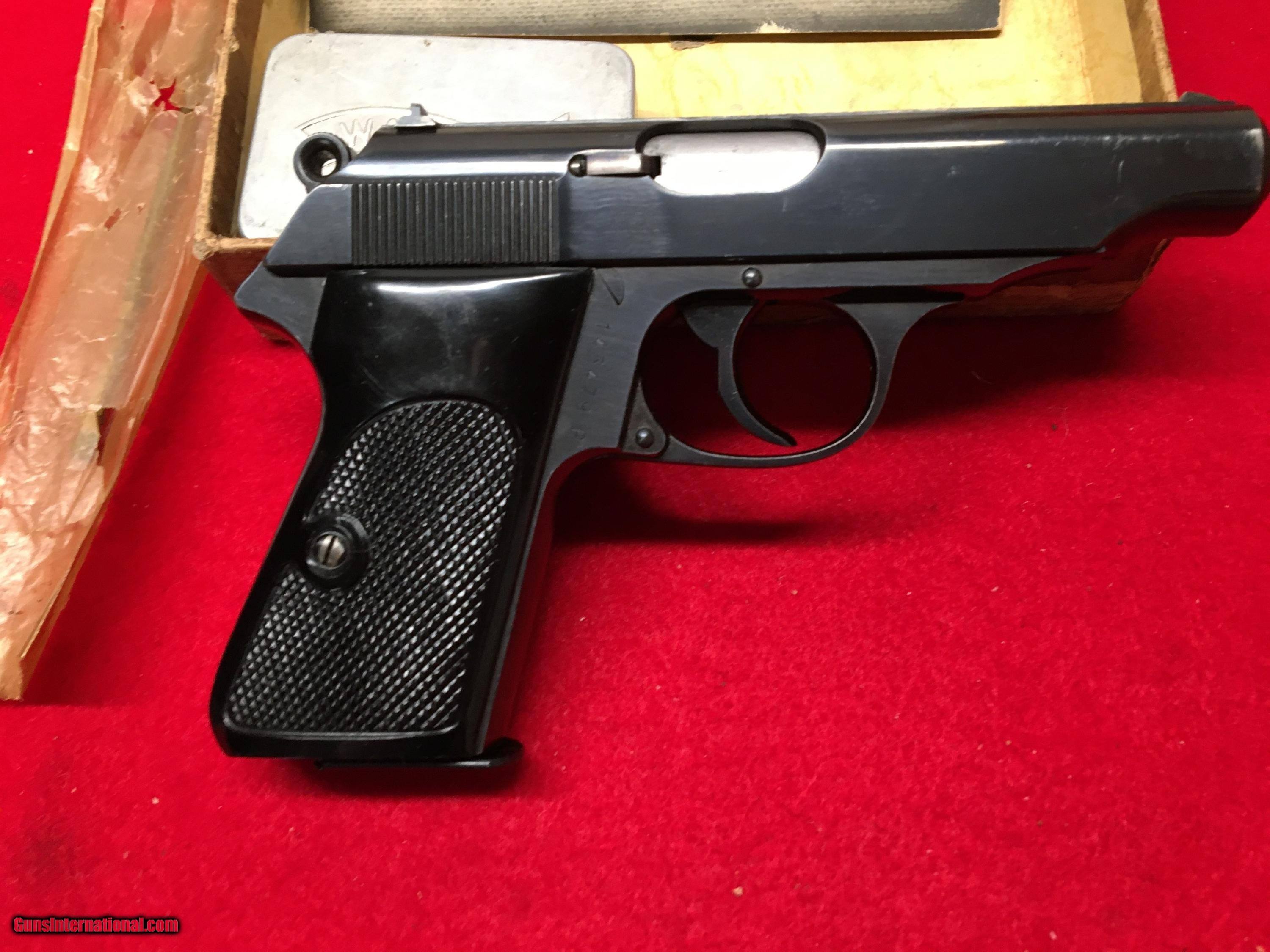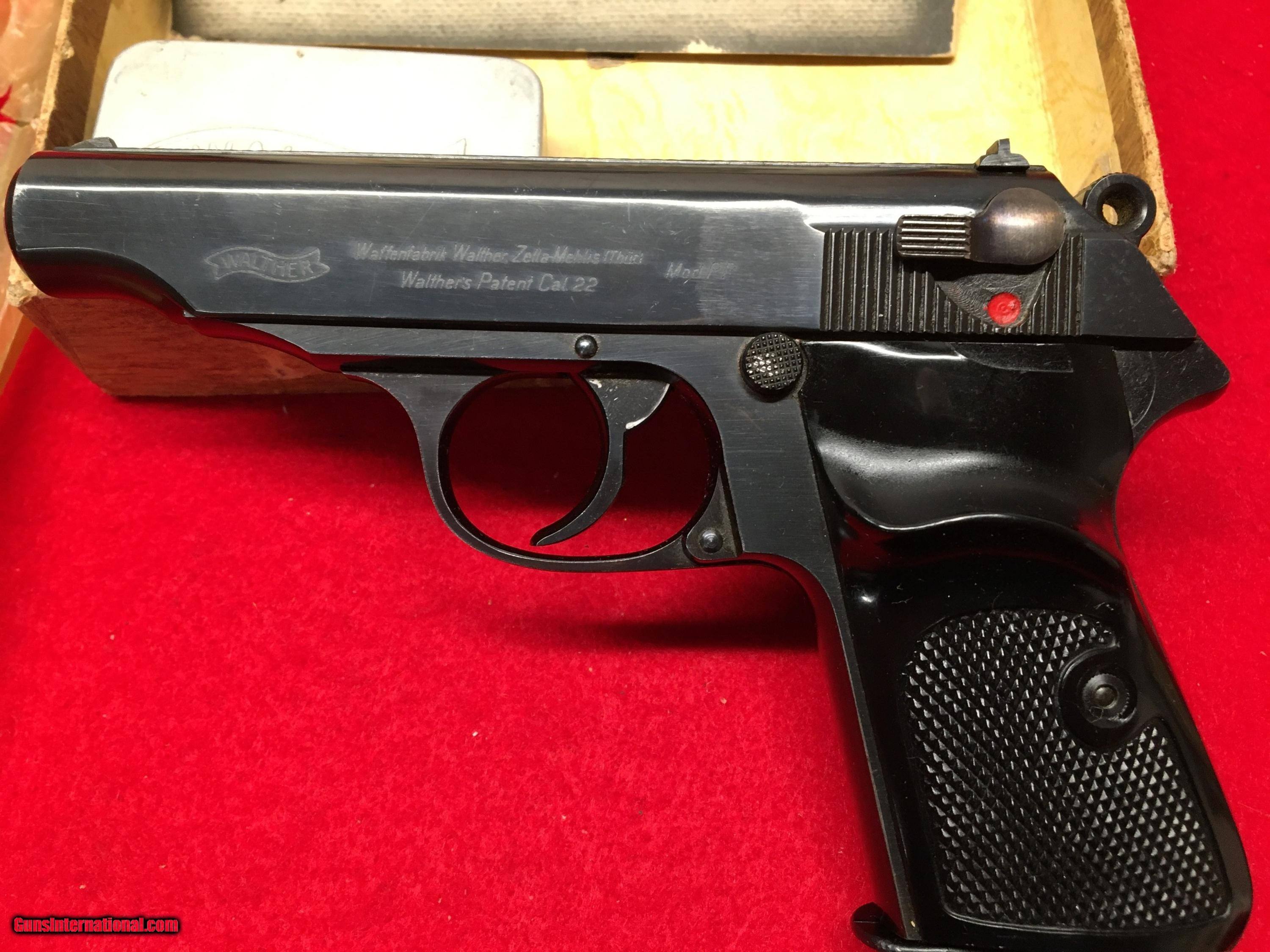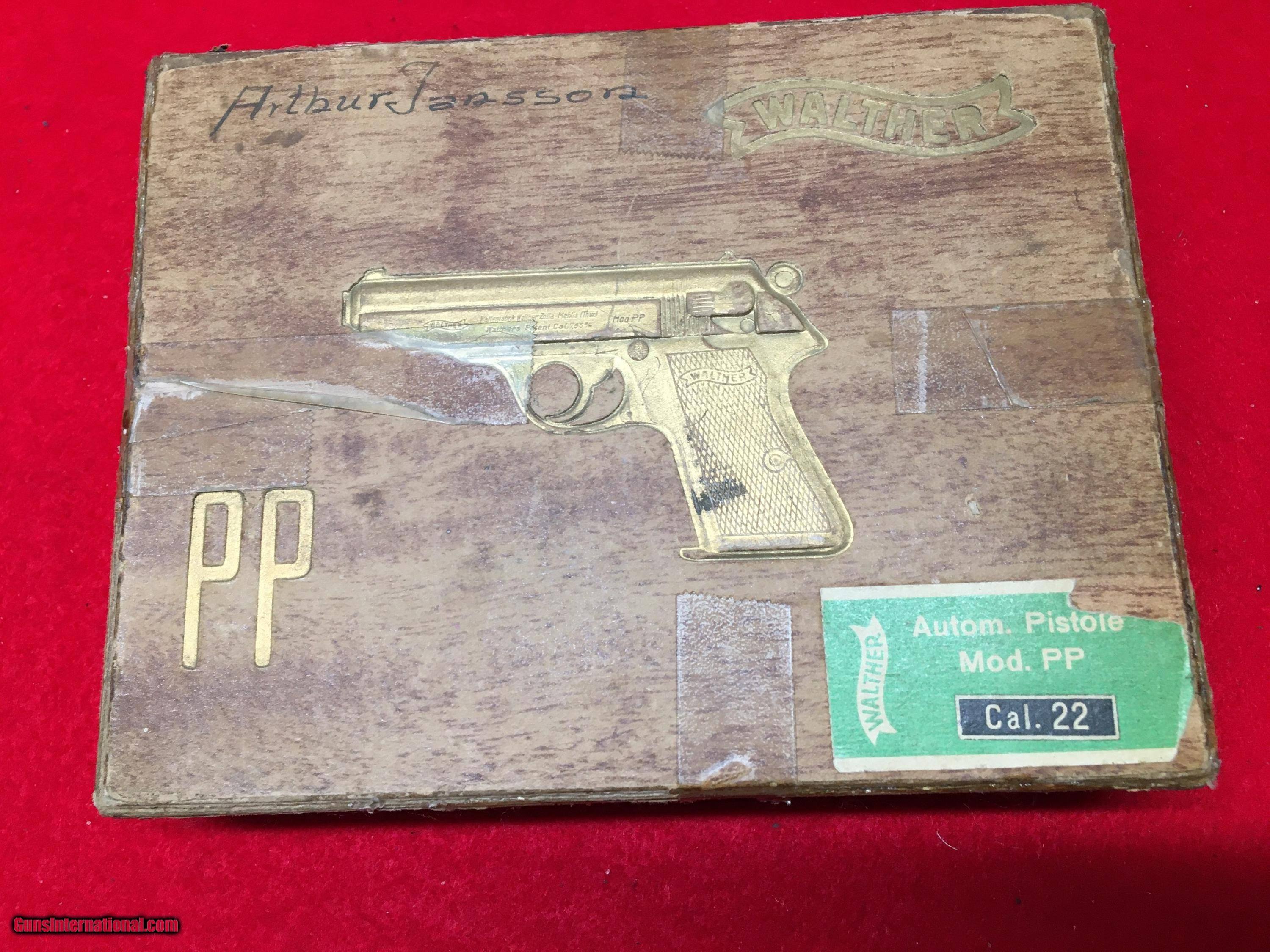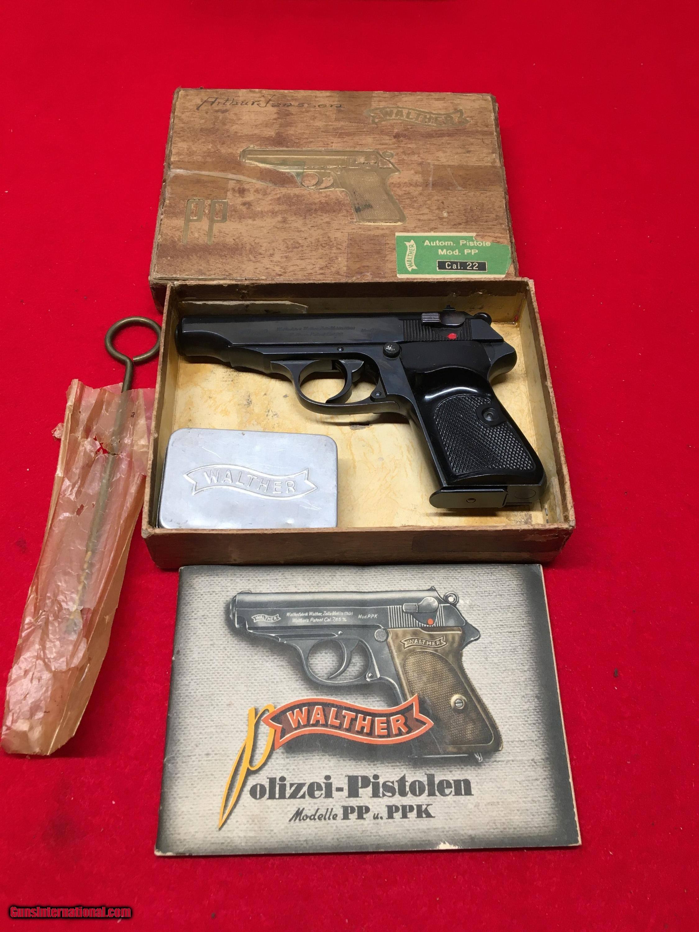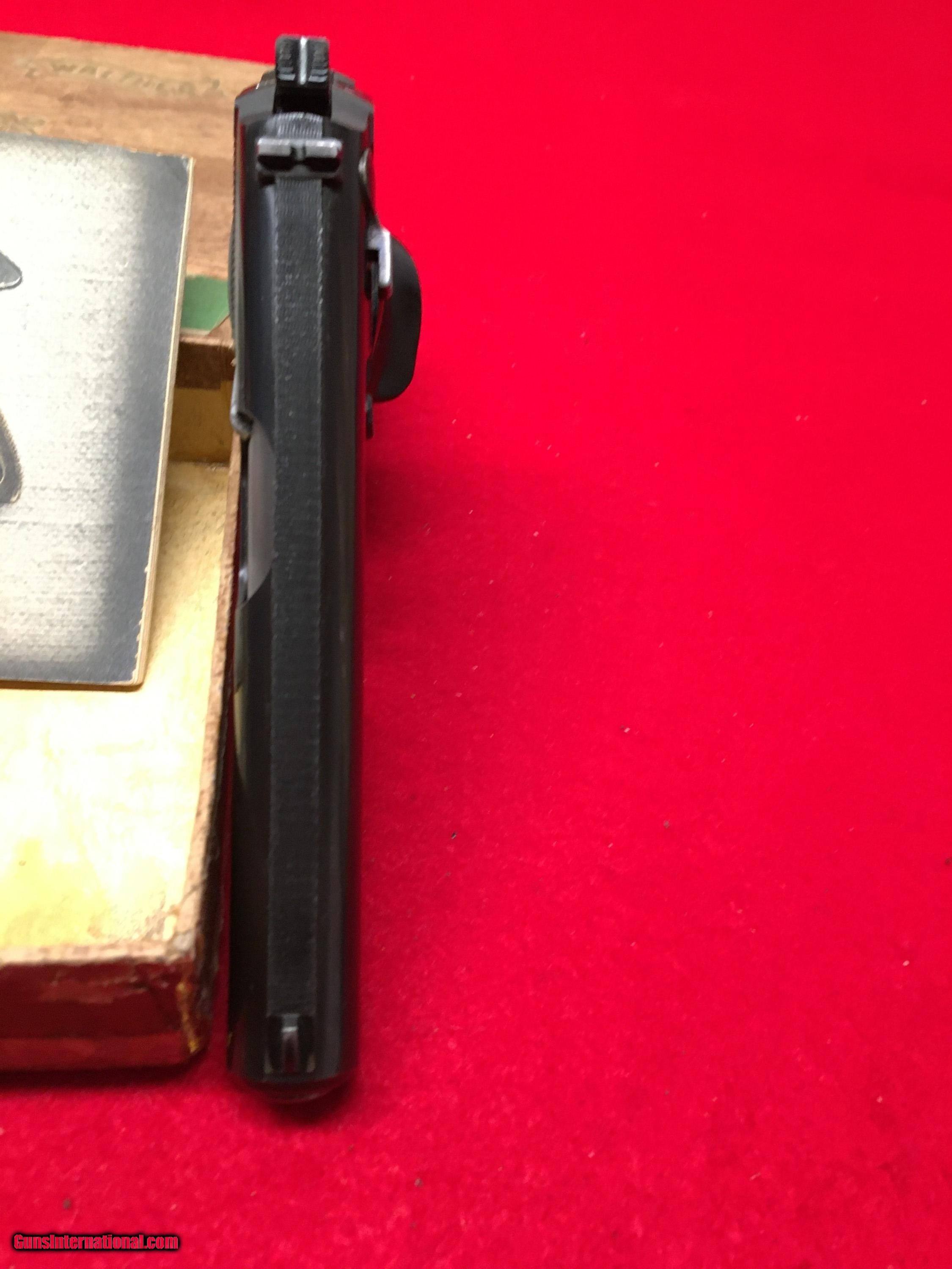 Description: Boxed Walther PP 22LR Pre WWII SN 145479, mfg. 1938. "Crown N" proof mark, in excellent 99% condition. Bore is same. Comes in correct numbered to gun box with correct manual, cleaning rod, and accessory tin, 1 well used dummy cartridge, all correct and in excellent condition. No import marks. One of the world's most desirable pistols. SOLD: AS IS. Payment: USPS Money Order, Certified Check, Personal Check. Buyer pays shipping, handling and insurance costs; flat rate $35 SOLD Manufacturer: Walther Serial Number: 145479 |