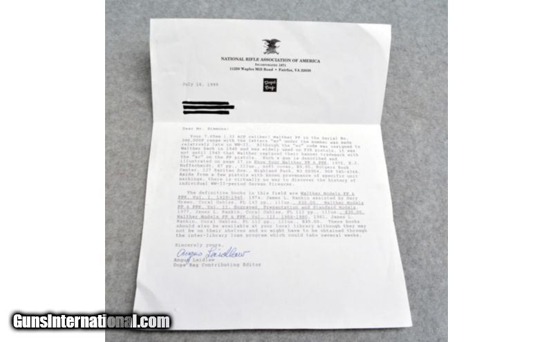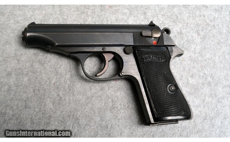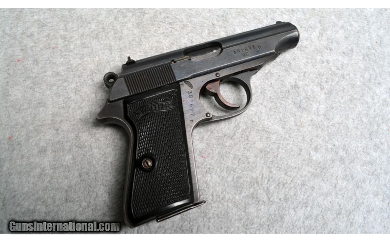 Description: The Walther PP (Polizeipistole, or police pistol) series pistols are blowback-operated semi-automatic pistols, developed by the German arms manufacturer Carl Walther GmbH Sportwaffen. It features an exposed hammer, a traditional double-action trigger mechanism,[6] a single-column magazine, and a fixed barrel that also acts as the guide rod for the recoil spring. This pistol comes with a certification letter from the NRA. SOLD Curio/Relic: Yes Manufacturer: Late World War II. Caliber Info: .32 ACP Chambers: Semi-Auto. Metal Condition: Very good with some very light surface use marks. Wood Condition: Grips are in excellent condition. Bore Condition: Very good, bright and shiny. Barrels: 3.9 Inches. Triggers: Factory blue steel. Stock: Checkered polymer black grips with Walther logo. Weight: 23 Oz. Sights: Fixed iron sights, rear notch and front blade. Item Location: Hazelwood, MO |