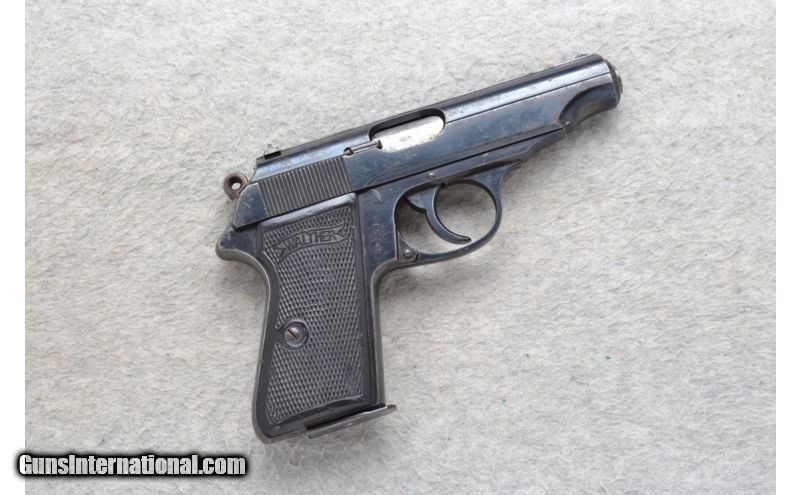 Description: This Walther Model PP is a right hand blow-back operated semi-automatic pistol in .32 ACP Cal. It has a 3.9 inch barrel with a rear serrated slide. A blade front and notch rear sight. The grip panels are a checkered hard black plastic. It has a ringed serrated hammer. A hammer decocker. SOLD Manufacturer: S/N 815140 Caliber Info: .32 ACP Chambers: Semi-Auto 8 round magazine. Metal Condition: Fair. Has freckling. Handling marks and light wear. Wood Condition: Fair. Left grip panel has a crack. Right panel has wear and handling marks. Bore Condition: Very good. Barrels: 3.9 inch barrel with a rear serrated slide. Triggers: Single Action / Double Action. Stock: Diamond checkered hard black plastic grip panels. Weight: 26 oz. Sights: Blade front. Notch rear. Item Location: Hoffman Estates, IL |