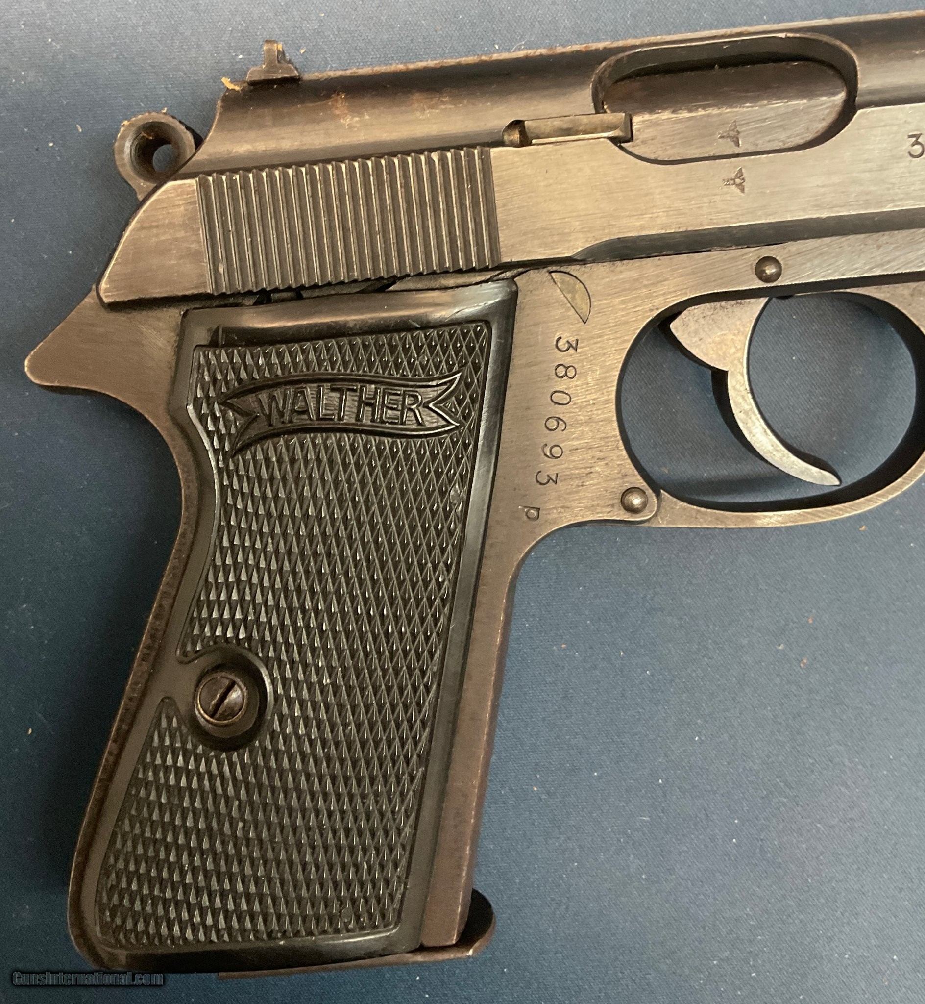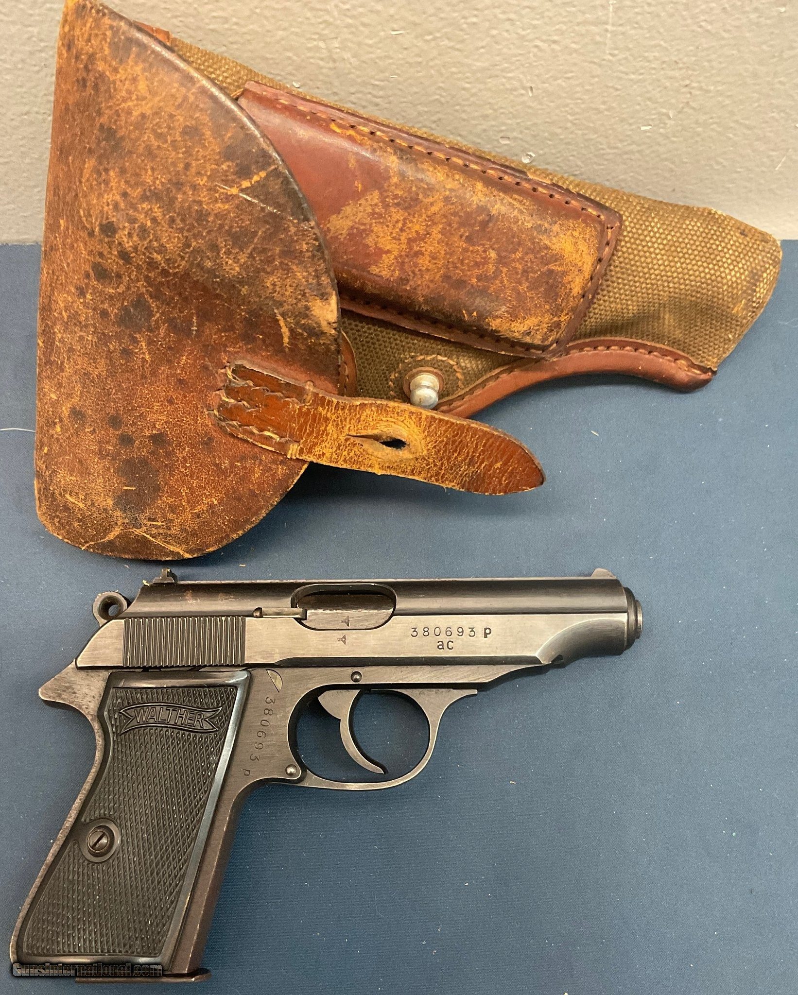 WALTHER PP .32 ACP  Description: Guns Listing ID: 584895 The Walther PP, or Polizeipistole, was designed by the German company Walther in 1929 as a police pistol. It gained popularity for its reliability and features like a double-action trigger and a safety/decocker, leading to its adoption by German police, military, and intelligence agencies. The smaller PPK variant was introduced in 1931 for more concealable use, and the PP series was used throughout the war and remained in production afterward, becoming iconic through its association with James Bond and other films. As seen in photos this has NAZI markings, holster is dated 1941 SOLD Manufacturer: WALTHER Model: PP Caliber Info: .32 ACP Condition: Used - Non-Certified Barrels: 3.5" BARREL Action: SEMI AUTOMATIC Finish: blue |