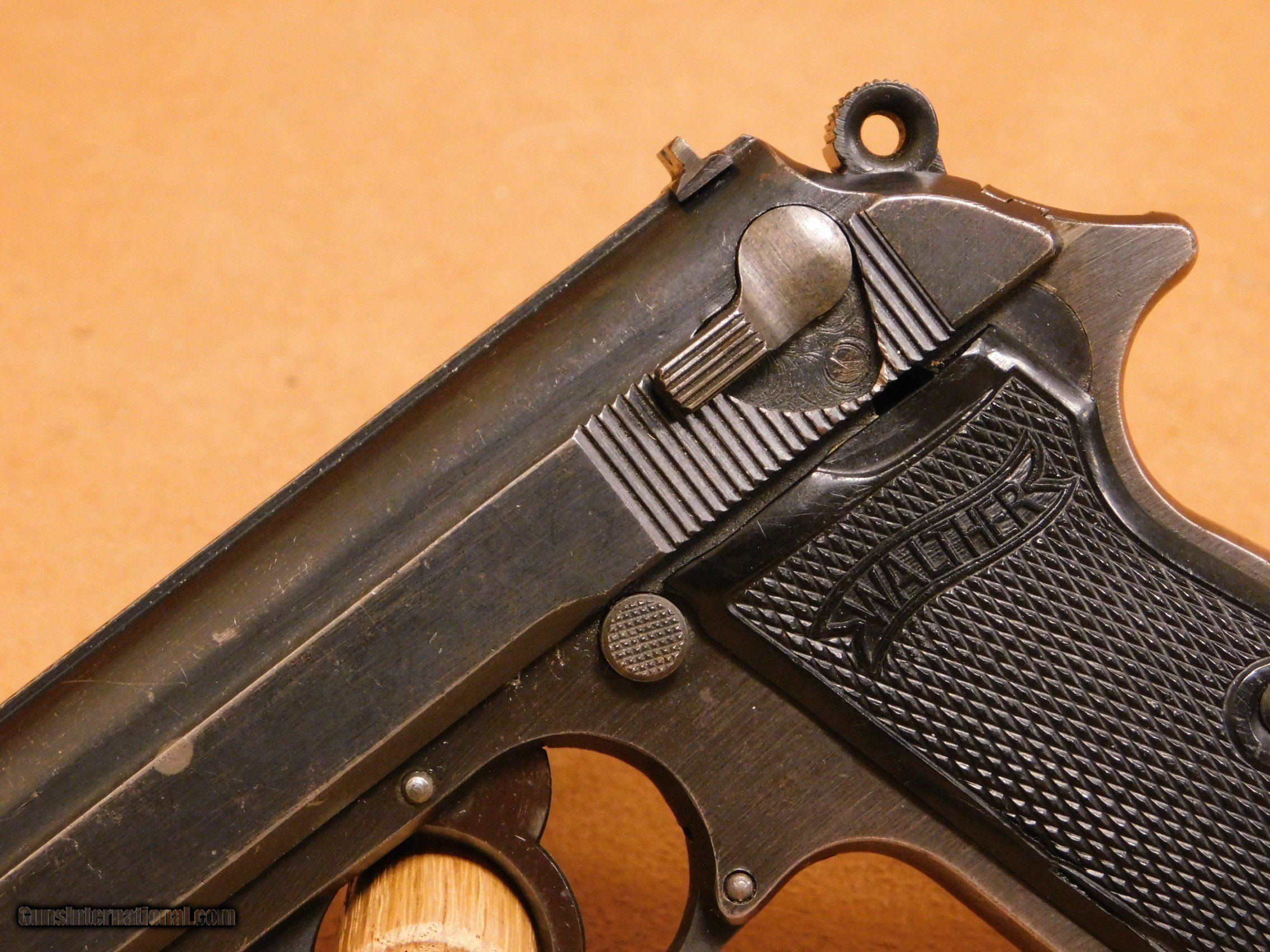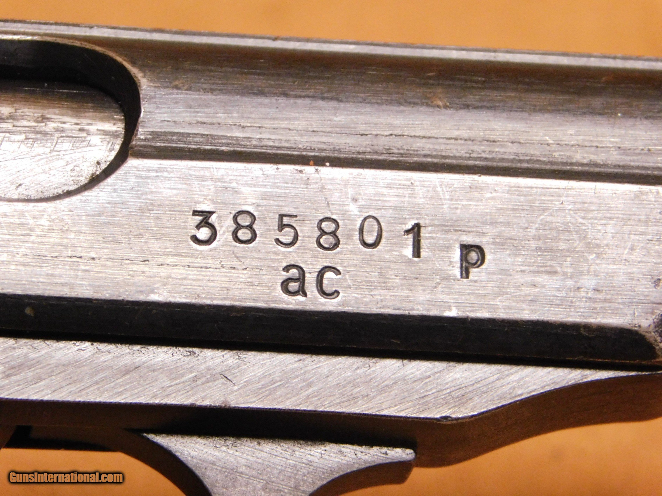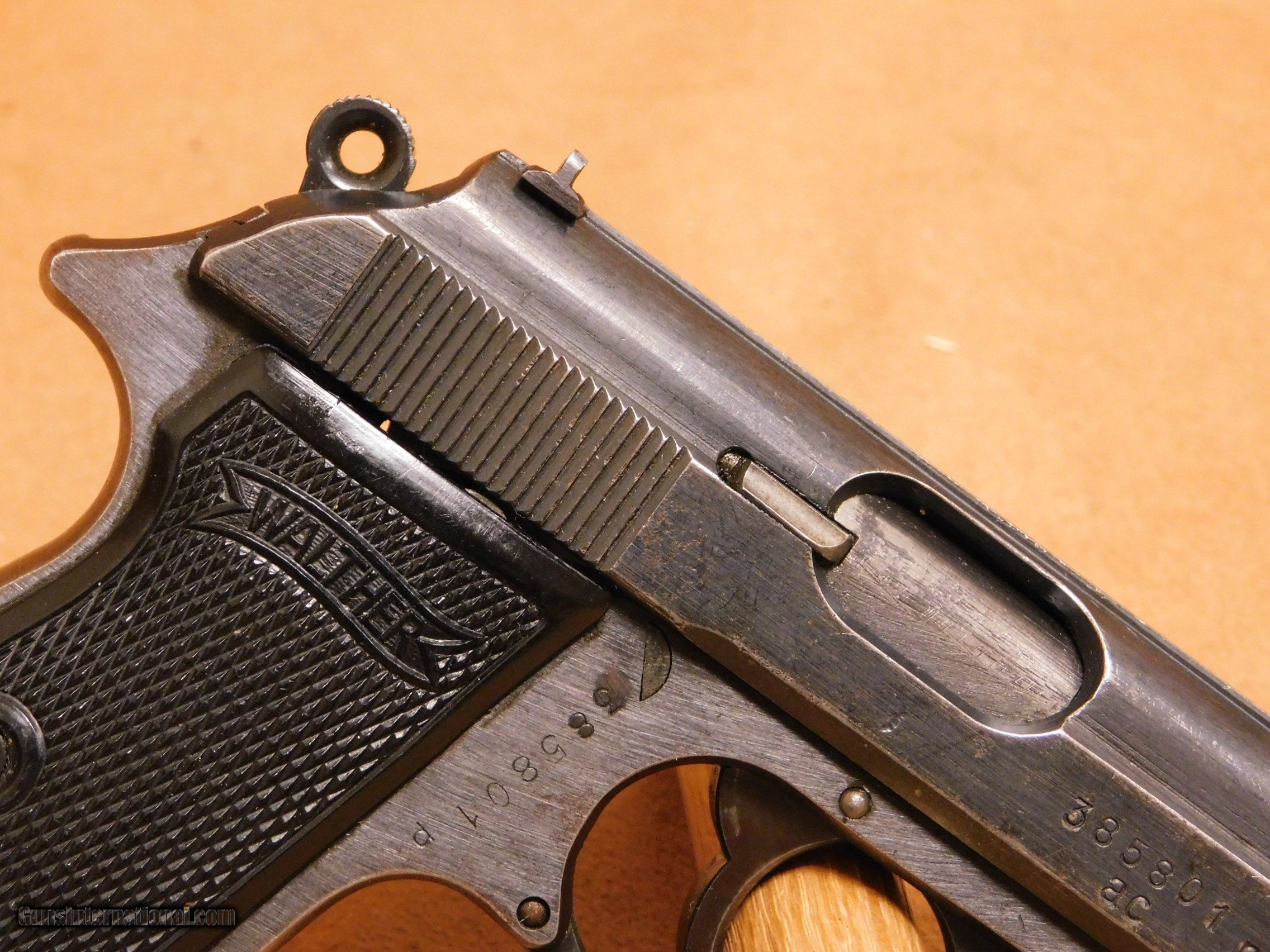 Description: This is a very late-war Walther PP, one of the last 4,000 produced. It has blank, AC-marked slide with no Walther Banner on the opposing side. It has no firing proofs and a matched number on the slide. The pistol was probably picked up by a GI in the Walther factory. It has a mint bore and just a few handling marks. The only finish loss is near the muzzle and one spot on the slide. The grip strap starting to thin. It comes with a "W"-marked mag. All items are also available for sale in our brick & mortar store and are subject to prior sale. Think long, think wrong. Payment On firearms, we typically only accept credit cards or money orders/cashier's checks.