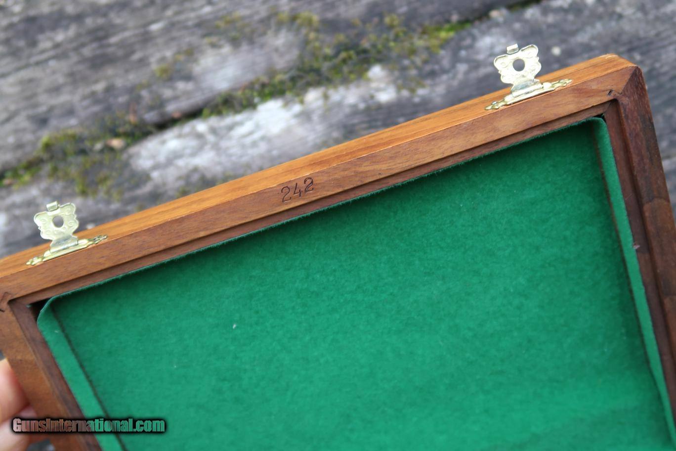 Description: Description: Fantastic, high polished and specially assembledWalther PP 50 Jahre Commemorative, production limited to 500 pistols, this one SN: 242, with fixed front sight and drift adjustable rear sight, each white highlighted. Gold lettered slide address and gold plated small parts to include hammer, trigger, magazine release, and extractor. Imported by Interarms as discreetly marked on right side of frame. Carved grips with traditional oak leaf and acorn pattern. Pair of magazines with black finger extensions. Factory case with Walther label bordered by carved oak leaf and acorn pattern, green velvet lined, compartmentalized for pistol and spare magazine. No literature. Synopsis: Stunning, as New, Walther PP, 50 Jahre Commemorative, W242Von500, A-1665 Condition: The ensemble presents as new with no sharp edge wear, scratches or thinning. Box with a few truly miniscule scuffs. A striking set that is virtually impossible to upgrade, other than adding the factory literature. SOLD Manufacturer: Walther Serial Number: W242Von500 Caliber Info: 9mmK |