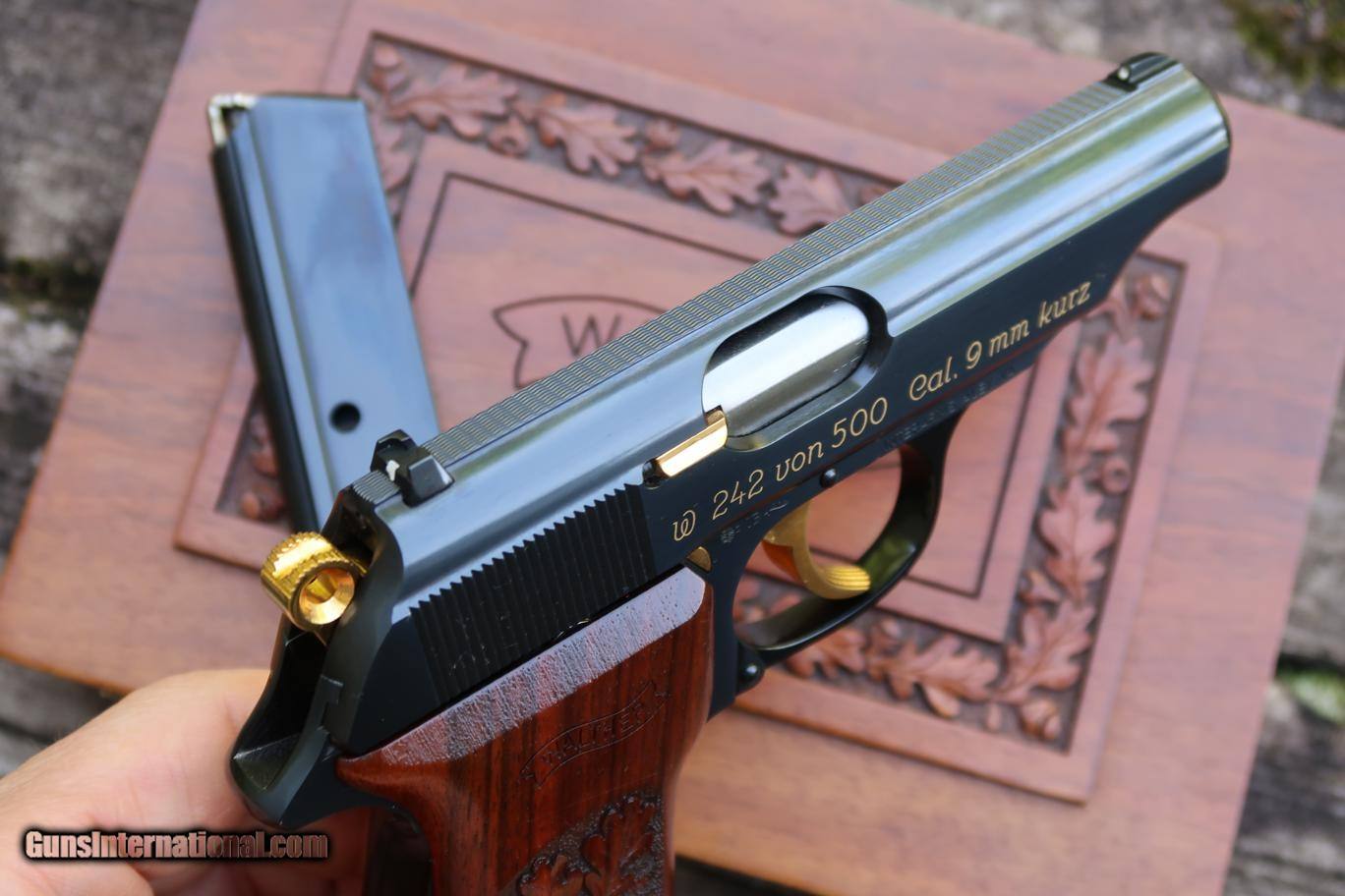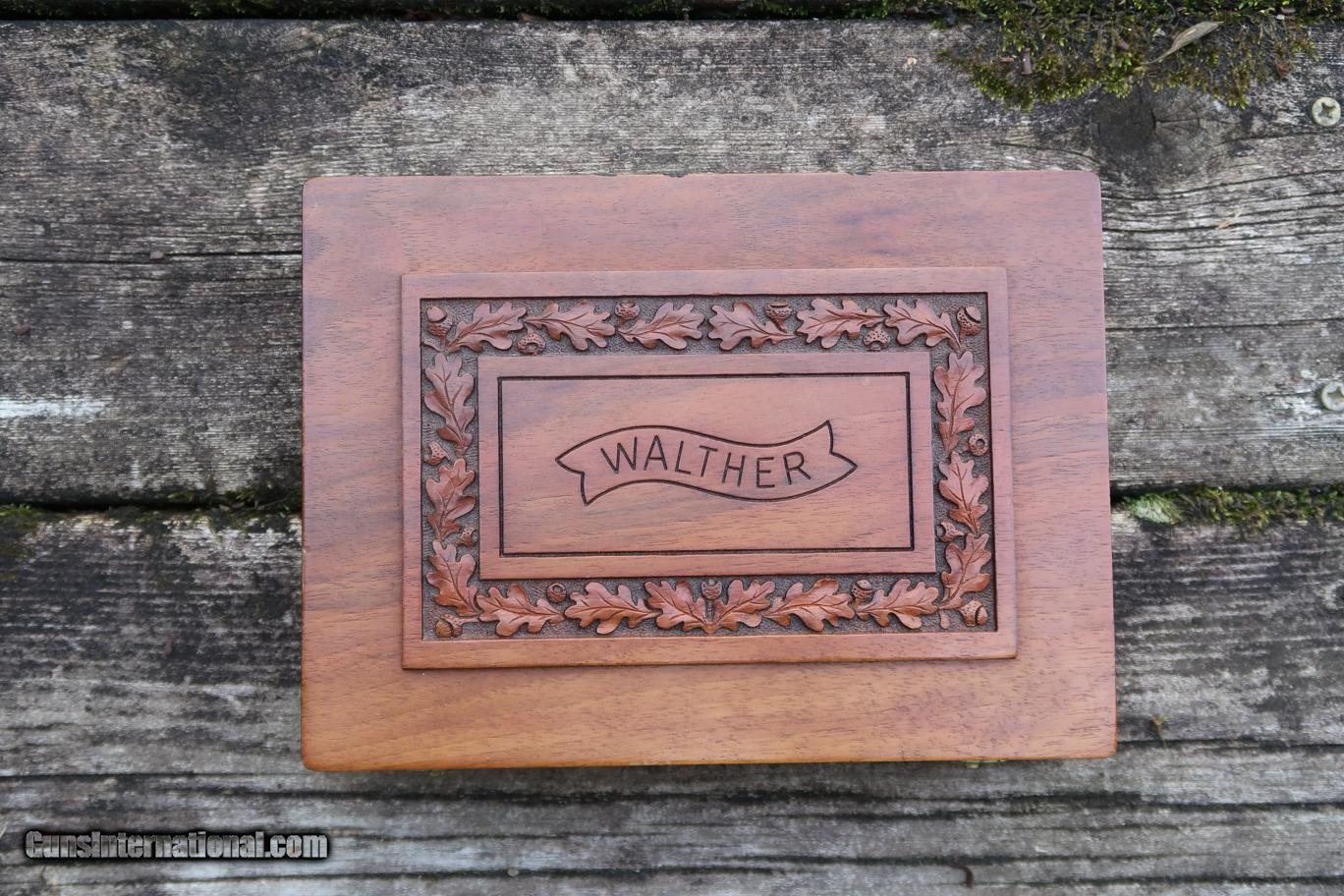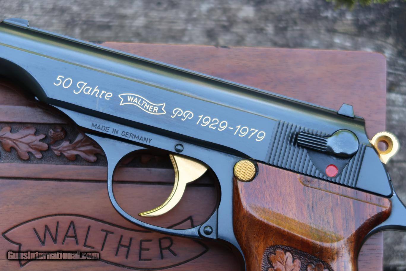 Fantastic, high polished and specially assembledWalther PP 50 Jahre Commemorative, production limited to 500 pistols, this one SN: 242, with fixed front sight and drift adjustable rear sight, each white highlighted. Gold lettered slide address and gold plated small parts to include hammer, trigger, magazine release, and extractor. Imported by Interarms as discreetly marked on right side of frame. Carved grips with traditional oak leaf and acorn pattern. Pair of magazines with black finger extensions. Factory case with Walther label bordered by carved oak leaf and acorn pattern, green velvet lined, compartmentalized for pistol and spare magazine. No literature.