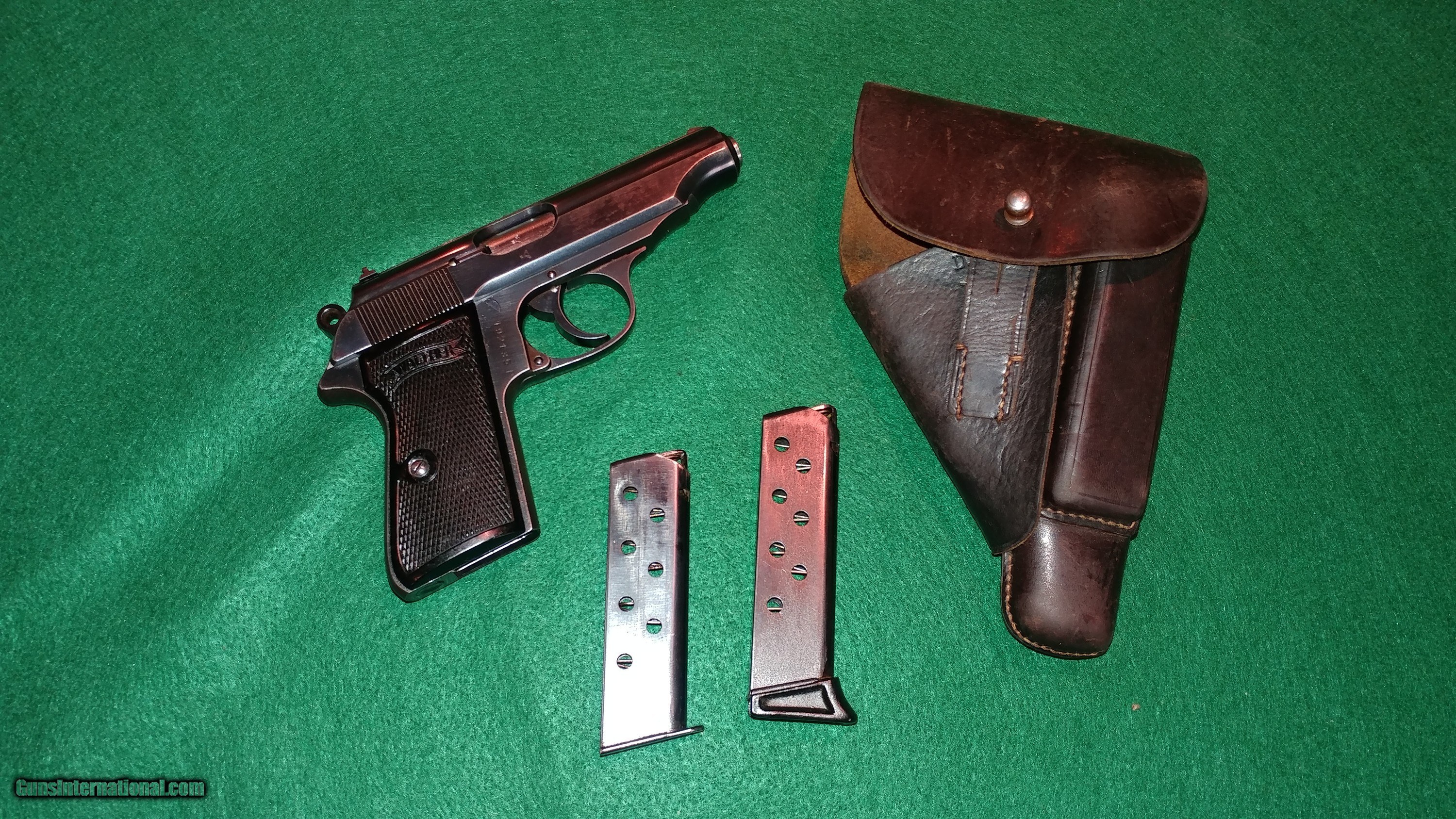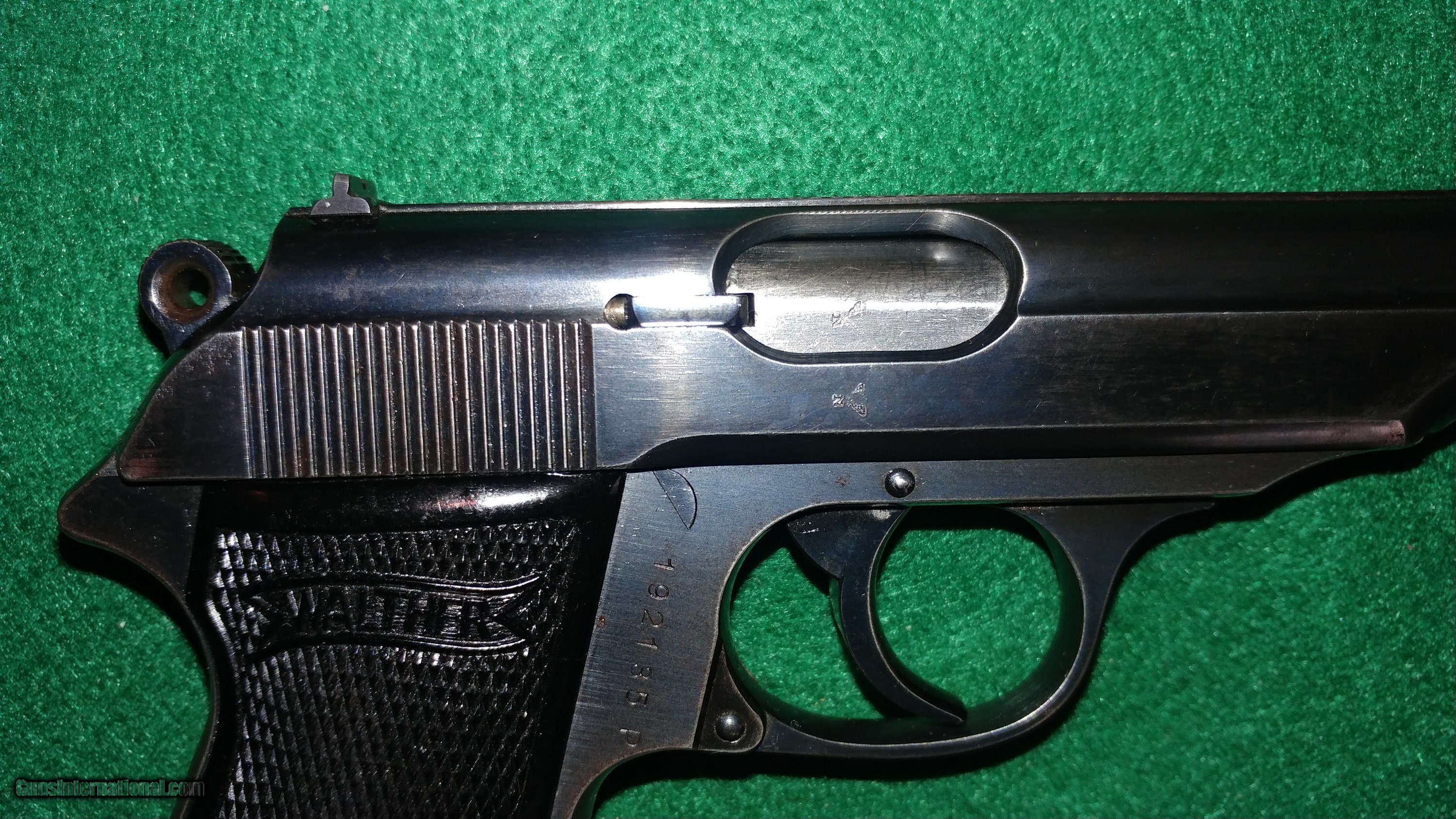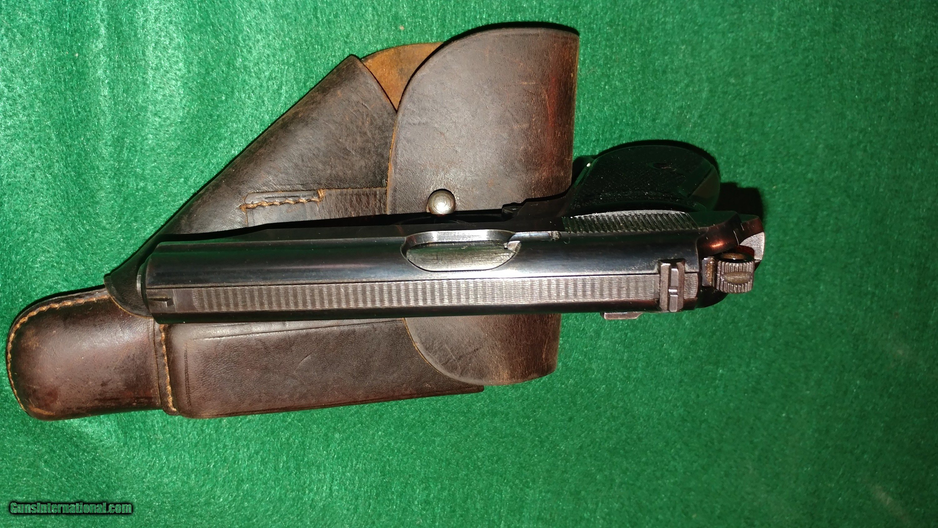 Description: Walther PP, 7.65mm (32ACP) semi-auto pistol; SN 192135P. Eagle over N proofs on receiver, slide and barrel. Fine condition with excellent+ bore; 90% original blue with minor silvering of edges and small spots of the tiniest of pinprick pitting at the front and back corners of slide where it was in contact with holster. Two factory clips and excellent holster marked "D.R.G.M." with coat-of-arms stamp over "Akah"; leather supple and stitching excellent. FFL;$35 shipping. SALE PENDING SOLD Handgun Caliber: .32 ACP (7.65x17mm Browning SR) |