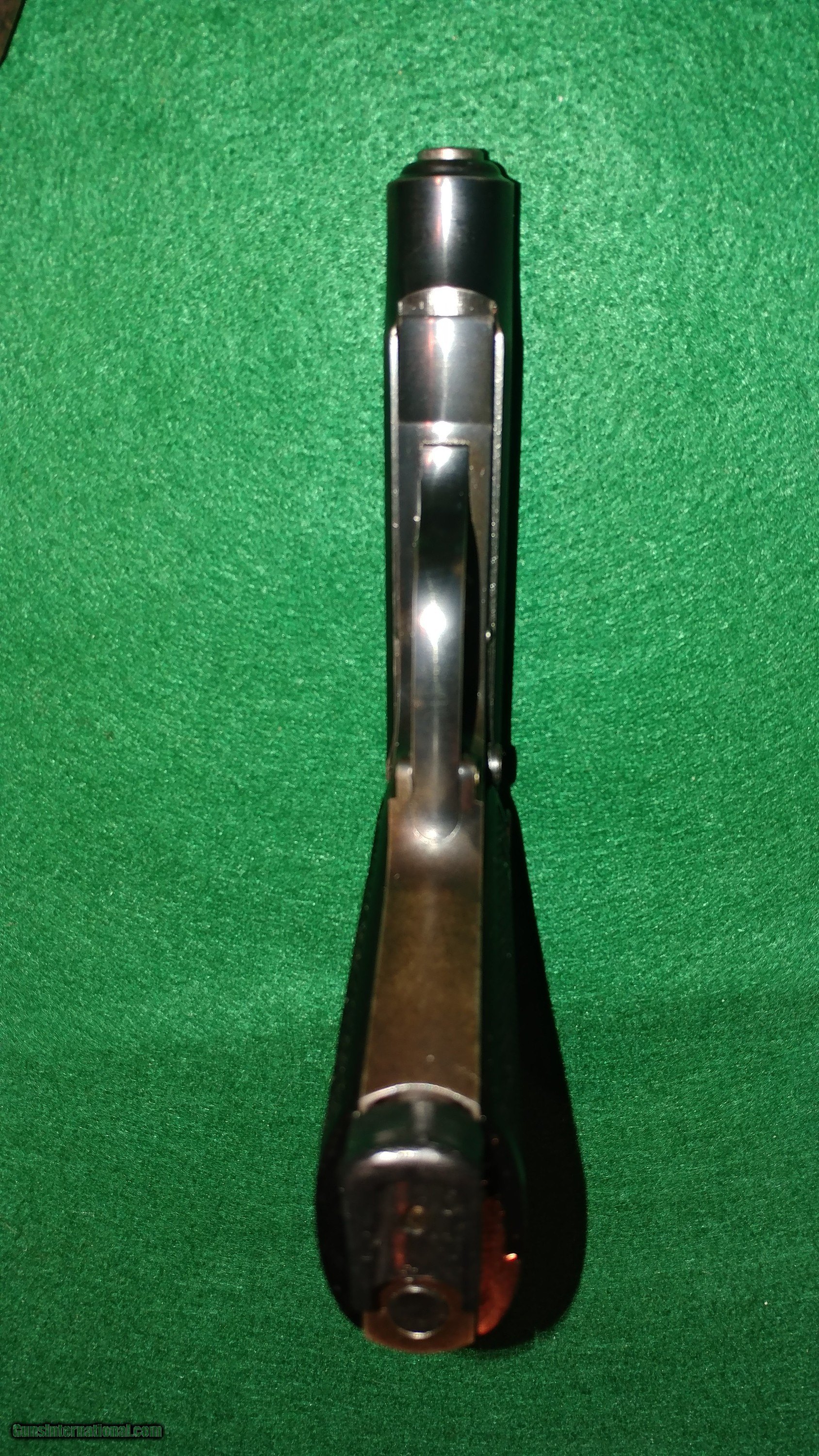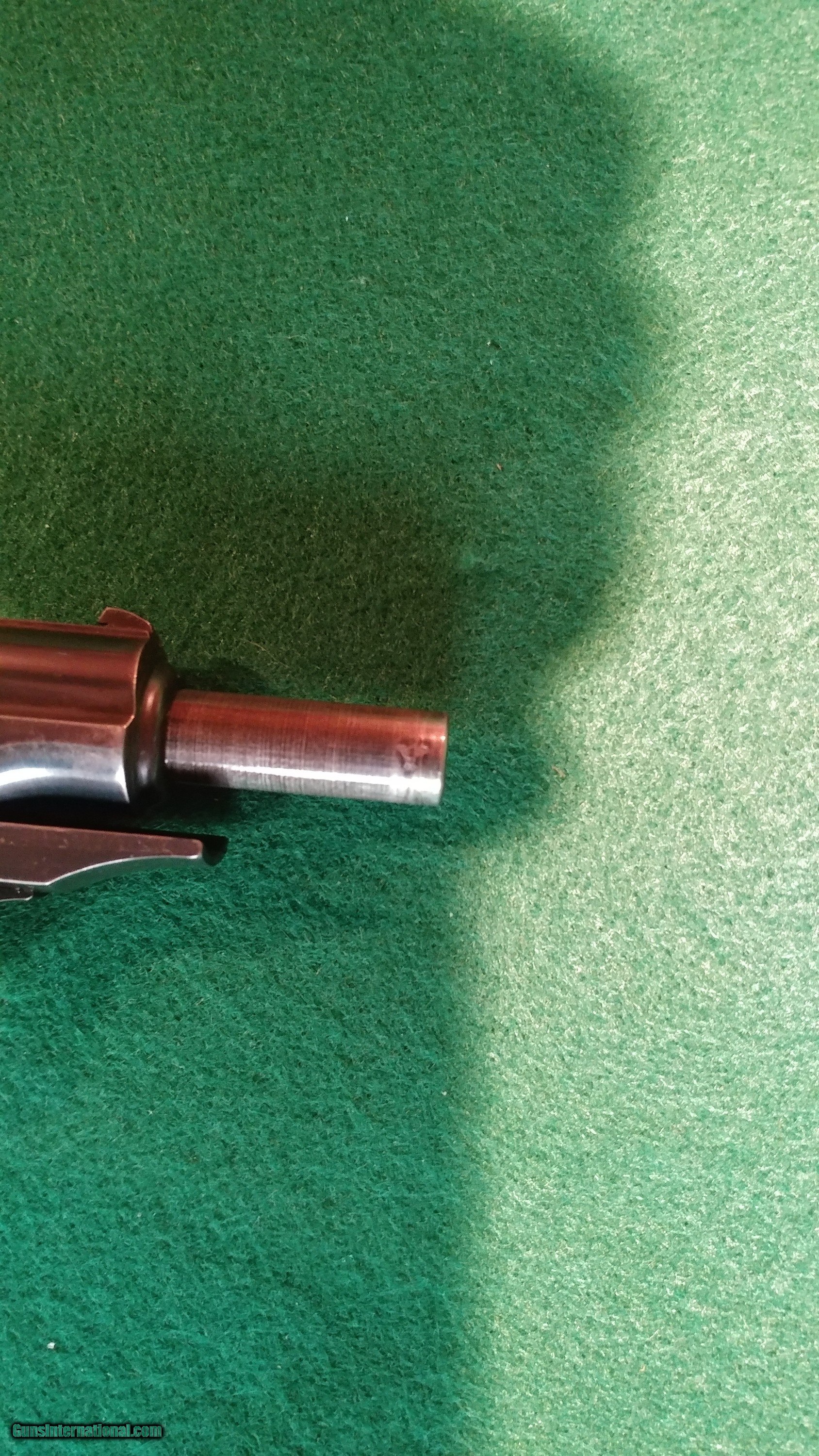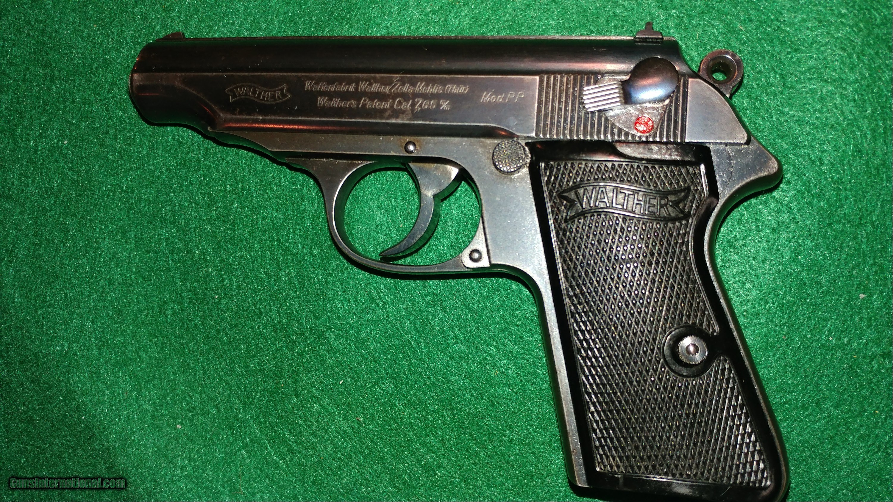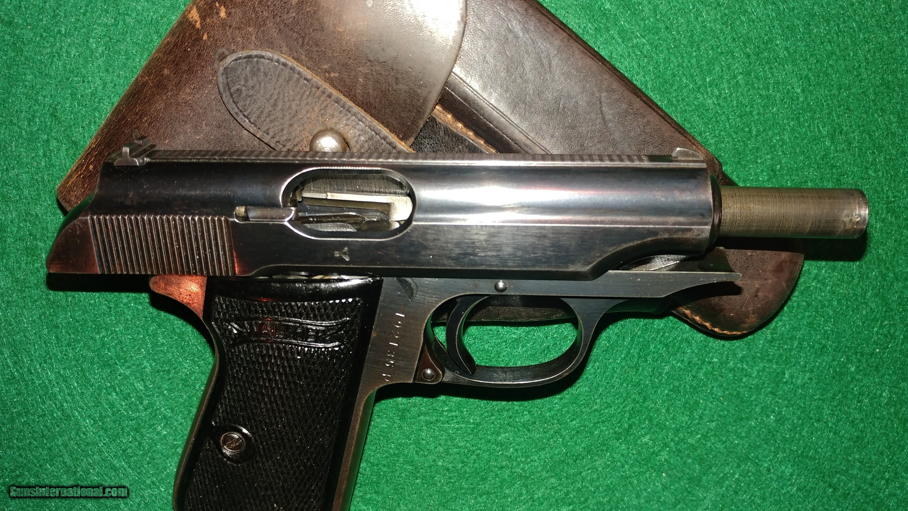 Description: Walther PP, 7.65mm (32ACP) semi-auto pistol; SN 192135P. Eagle over N proofs on receiver, slide and barrel. Fine condition with excellent+ bore; 90% original blue with minor silvering of edges and small spots of the tiniest of pinprick pitting at the front and back corners of slide where it was in contact with holster. Two factory clips and excellent holster marked "D.R.G.M." with coat-of-arms stamp over "Akah"; leather supple and stitching excellent. FFL;$35 shipping. SALE PENDING SOLD Handgun Caliber: .32 ACP (7.65x17mm Browning SR) |