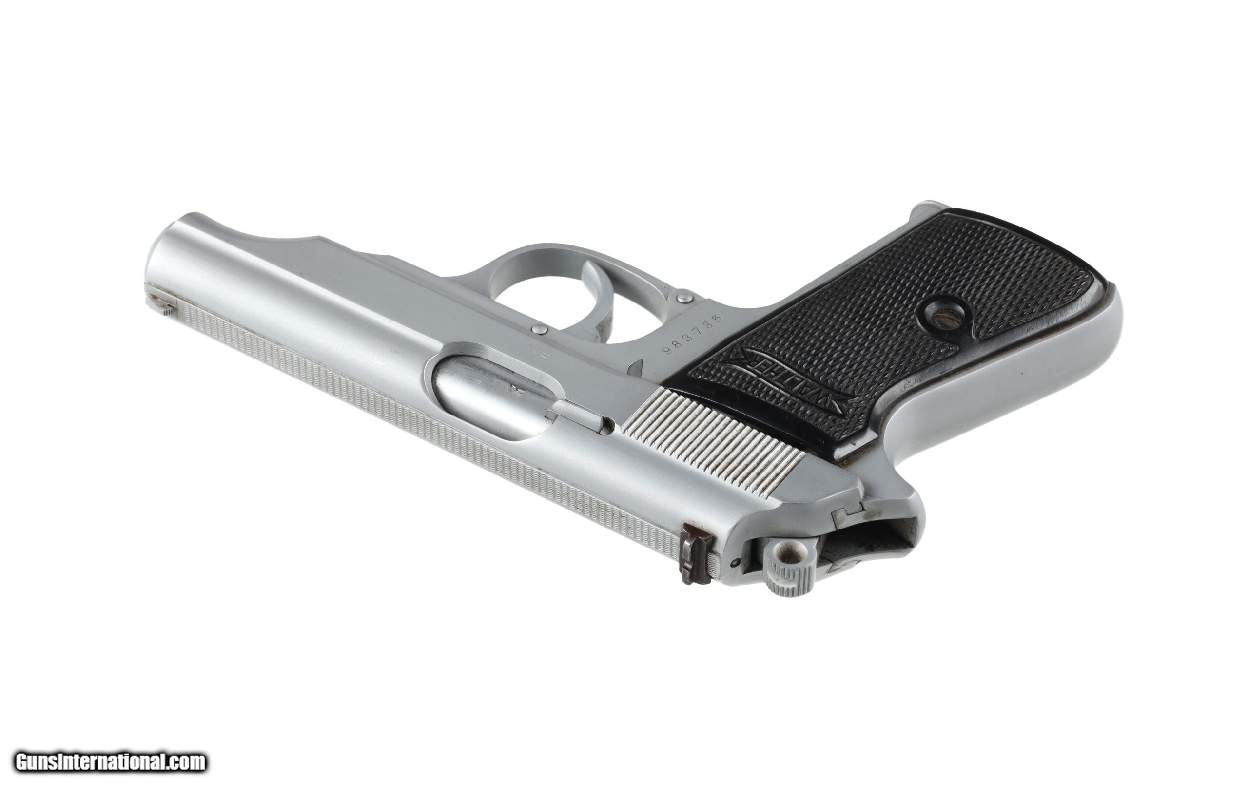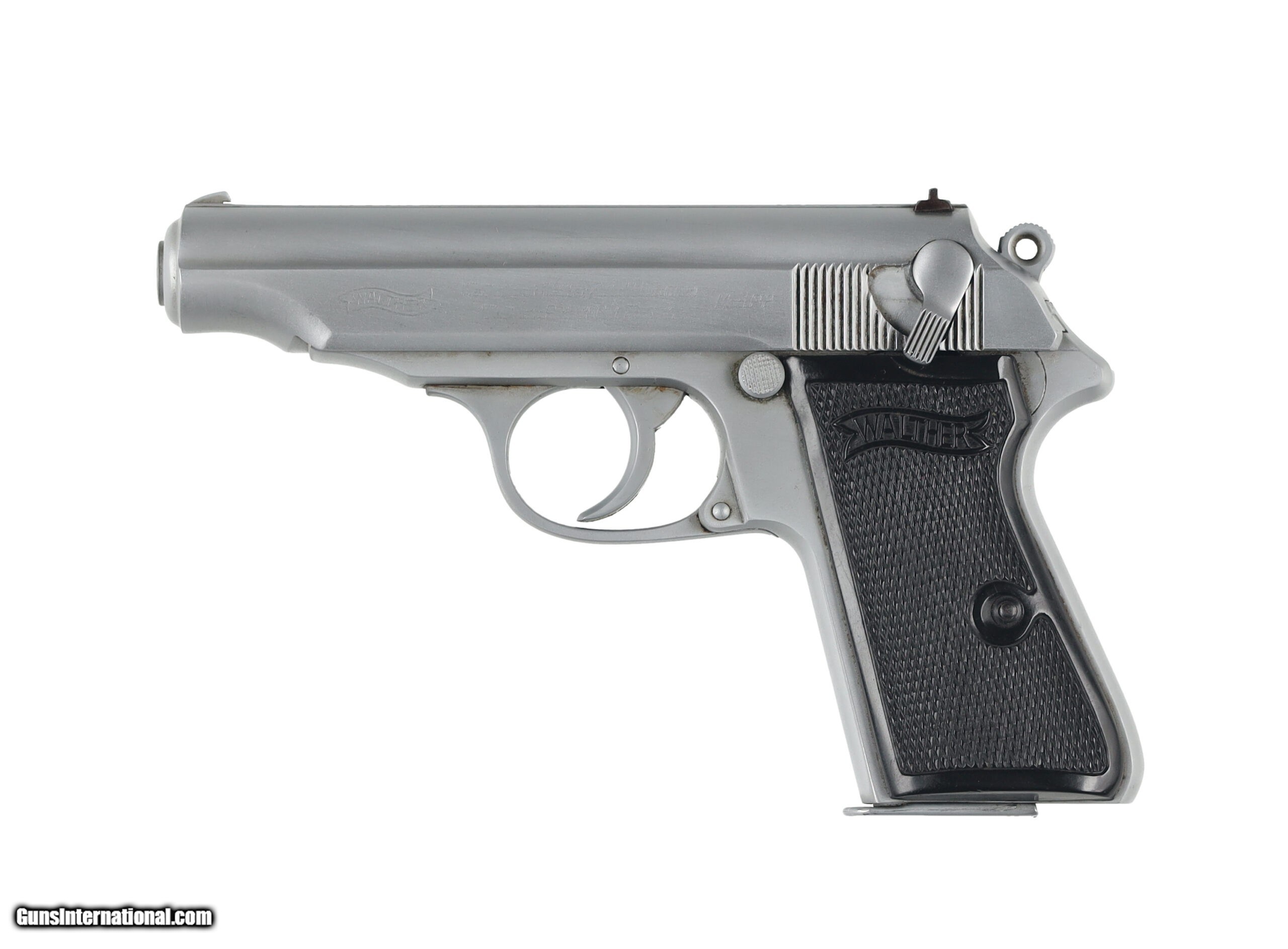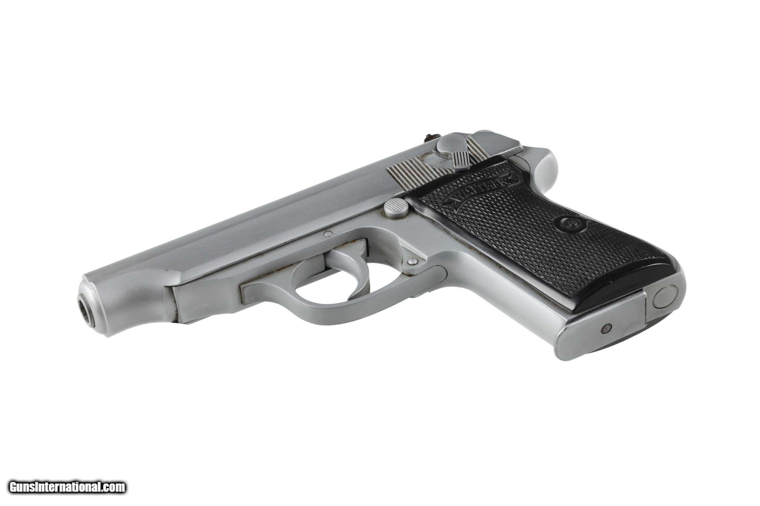 Description: The Walther Model PP is a well made blowback operated double action pistol, developed in the late 1920's, for police use. This example, made in 1938 appears to have been fully scrubbed to remove German military markings and has been re finished with a matte nickel finish. Manufactured in: Germany Hand: Right Hand Action Finish: Brushed Nickel Metal Finish: Refinished Barrel Length: 3.7 Barrel Condition: Very Good Stock Finish: Original Stock Condition: Very Good Grip: Pistol SOLD Curio/Relic: Yes Manufacturer: Carl Walther Model: PP Caliber Info: 7.65 - .32 AUTO Condition: Preowned Metal Condition: Good Action: Semi Automatic Triggers: Single Finish: Refinished Weight: 1.6 lbs Manufacture Date: 1938 Case: NONE |