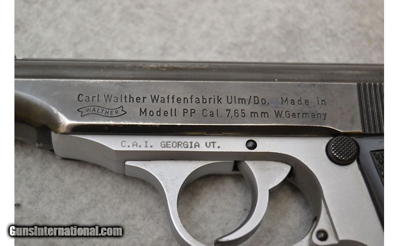 Description: A nice shooter grade example on the model. Finish has wear on the hard edges and some other patches that were probably caused by a holster. Grips have signs of wear such as some of the peaks in the texturing have been worn down and a few light scratches. Comes with the factory box, target, and a total of two magazines. 7.65mm (32 ACP) SOLD Chambers: Semiautomatic fed from detachable magazines. Metal Condition: Good. Wood Condition: Grips are in good condition. Bore Condition: Excellent. Bright shine and well-defined lands/grooves. Barrels: 3½" Matte stainless. Triggers: Wide matte metal with smooth surface. Stock Dimensions: N/A Fore End: N/A Butt Pad: Walther branded black plastic grip panels. Weight: 1lb 9oz Sights: Fixed low profile front blade and rear notch. Chokes: N/A Item Location: Green Bay |