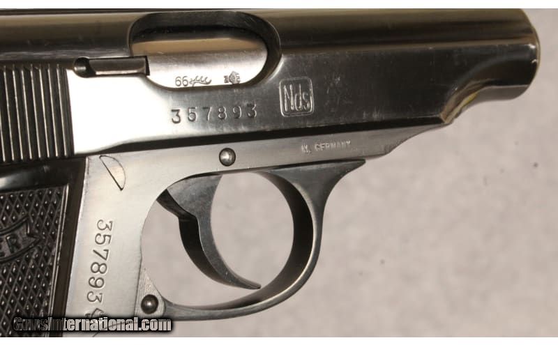 Description: The Walther PP is a superb semi-automatic pistol that is chambered in 7.65mm(.32ACP). This particular model is in excellent condition, showcasing no major signs of wear. It showcases two "NDS" markings on the right side of the slide and the left side of the frame, these are distinct State Police of West Germany markings. It also features a "W. Germany" marking on the frame, as well as a "66" with an antler proof and Eagle over N proof on the barrel. A remarkable firearm and a valuable addition to any collection. 7.65MM (.32 ACP) SOLD Metal Condition: Excellent Bore Condition: Bright Barrels: 4 Weight: 4lbs Sights: U Notch Rear/Front Blade Item Location: Tualatin, OR |