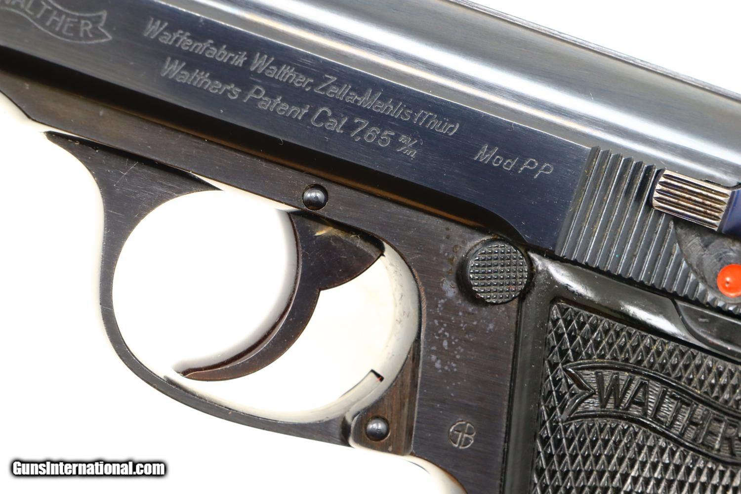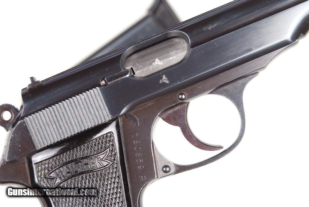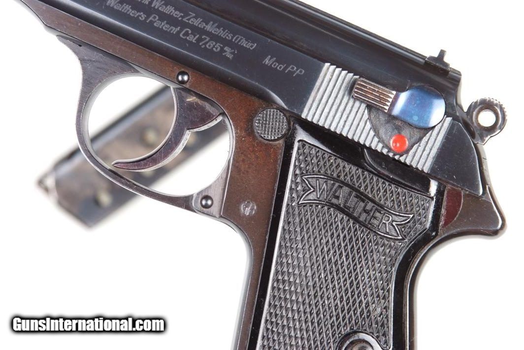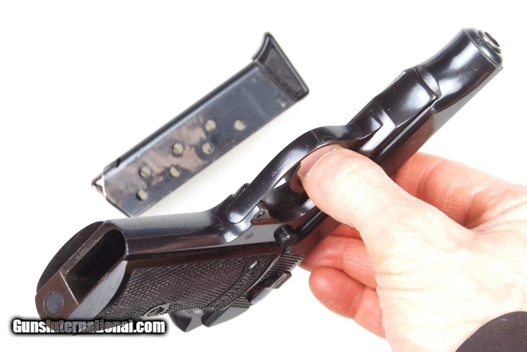 Standard configuration Walther PP, 7.65mm, with fixed front sight, drift adjustable rear sight. Loaded indicator. Left side of slide with usual Walther address reflecting manufacturer, model, and caliber. Left side of frame with “GB” in rondel form, an unknown marking. Full serial number on right side of frame. Eagle/N proofing on exposed barrel boss, right side of slide. Matching scribed slide. Standard black plastic grips and original magazine with black finger extension.