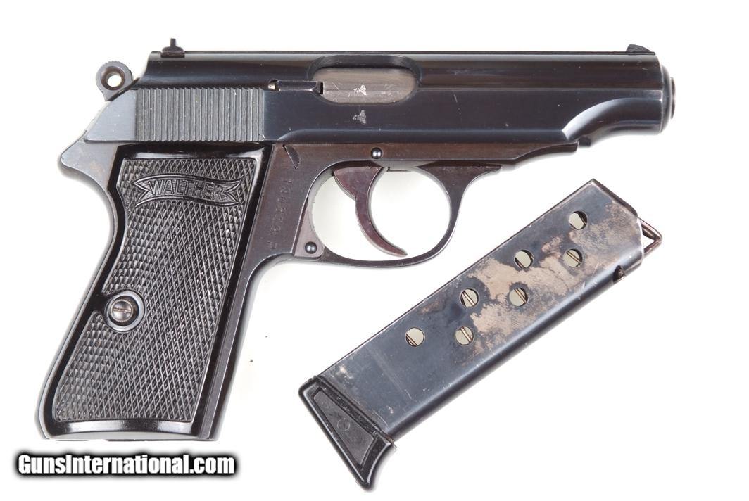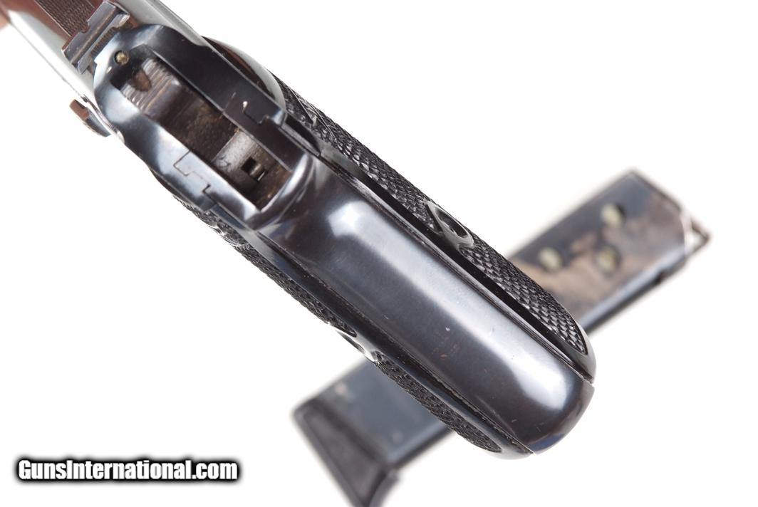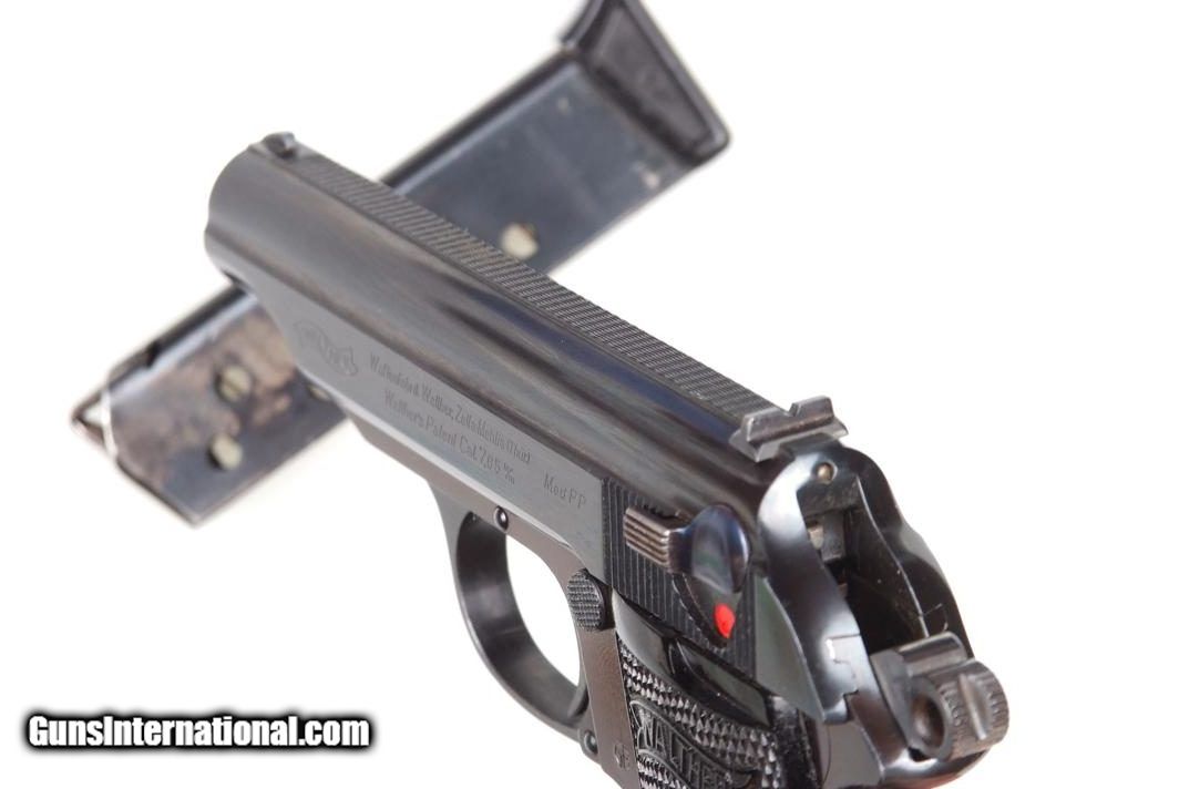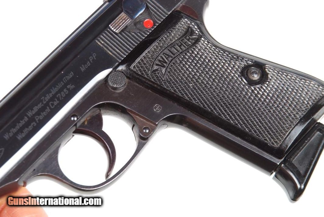 Standard configuration Walther PP, 7.65mm, with fixed front sight, drift adjustable rear sight. Loaded indicator. Left side of slide with usual Walther address reflecting manufacturer, model, and caliber. Left side of frame with “GB” in rondel form, an unknown marking. Full serial number on right side of frame. Eagle/N proofing on exposed barrel boss, right side of slide. Matching scribed slide. Standard black plastic grips and original magazine with black finger extension.