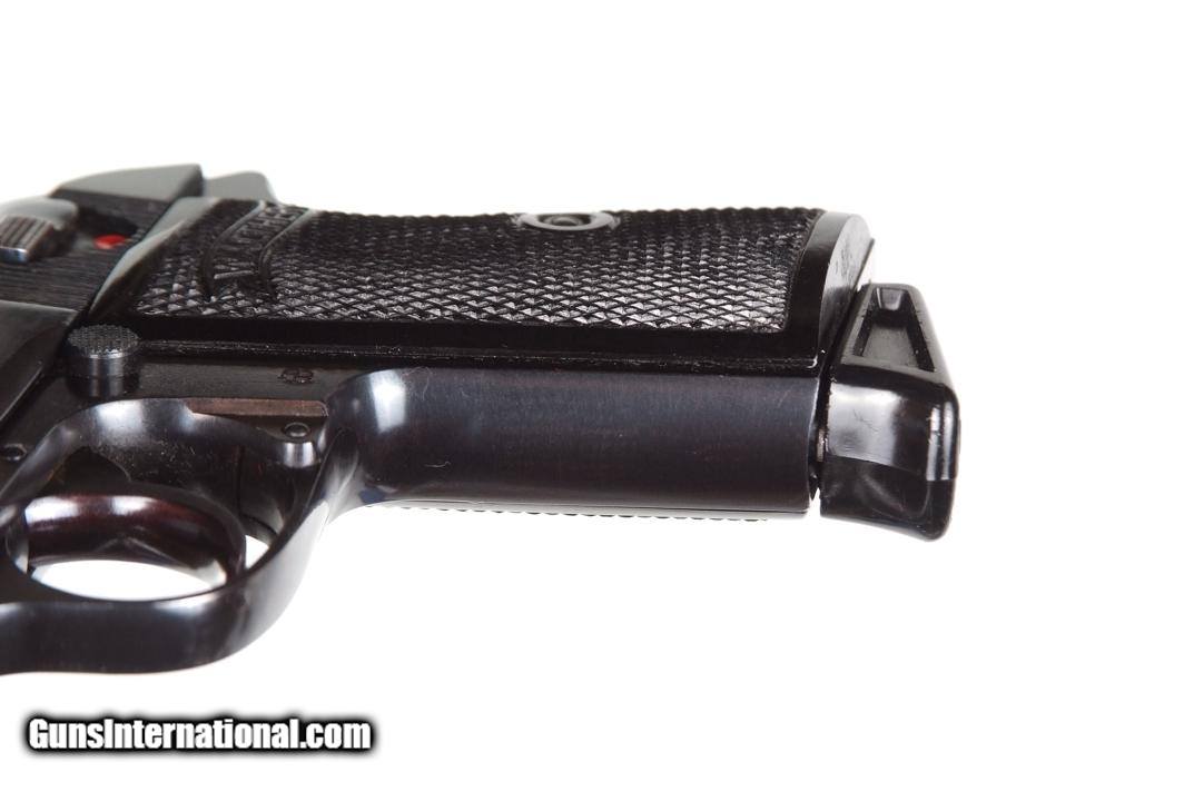 Description: Description: Standard configuration Walther PP, 7.65mm, with fixed front sight, drift adjustable rear sight. Loaded indicator. Left side of slide with usual Walther address reflecting manufacturer, model, and caliber. Left side of frame with “GB” in rondel form, an unknown marking. Full serial number on right side of frame. Eagle/N proofing on exposed barrel boss, right side of slide. Matching scribed slide. Standard black plastic grips and original magazine with black finger extension. Synopsis: Walther, PP, German, Early Wartime Commercial, GB Marked. Condition: Fantastic, 99+% bright original salt blue with just a few sharp edge rub marks and an occasional scuff. Comparable condition grips. Good magazine, the left side with a shallow dent, the right side with mottled blue loss as imaged. Mirror bright bore. Perfect manual mechanics. A gorgeous Walther PP, early Wartime Commercial whose “GB” marking deserves further investigation. SOLD Manufacturer: Walther Serial Number: 180359P Caliber Info: 7.65mm |