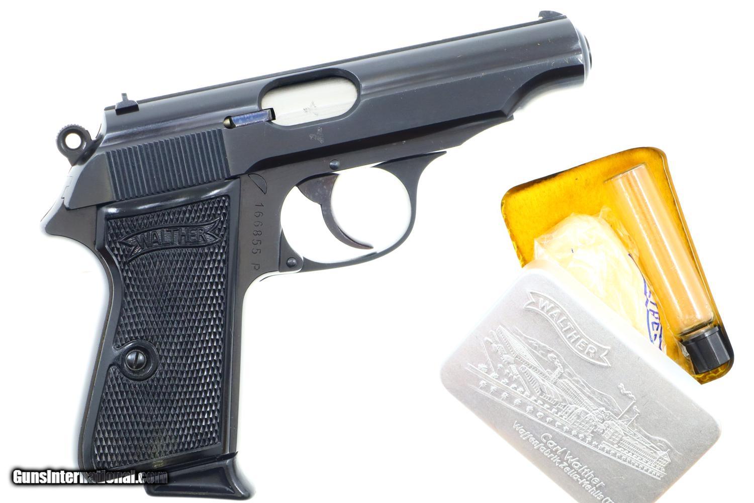 Description: Standard configuration Walther PP, 7.65mm, with fixed front sight, drift adjustable rear sight. Loaded indicator. Left side of slide with usual Walther address reflecting manufacturer, model, and caliber. Full serial number on right side of frame. Eagle/N proofing on exposed barrel boss, right side of matching slide (hand scribed with last three digits of SN). Standard black plastic grips and original magazine, with a black finger extension, marked with the Walther banner on the left side. Complete with correct instruction booklet, factory tin with cleaning implements, two cleaning rods, and matching shipping box that reflects the loaded indicator. Synopsis: Magnificent Walther, PP, German, WWII, Early Wartime Commercial, literature, matching box. Condition: 99++% original salt blue. Comparable condition grips and magazine. Mirror bright bore with sharp rifling. Perfect manual mechanics. Excellent instruction manual. VG+/Exc box with scattered scuffs. A wonderful Walther PP from WWII, especially nice with the original instruction manual and matching box having the loaded indicator tag. ~~Insured shipping fee of $65; most packages shipped using FedEx 2nd Day.~~ SOLD Curio/Relic: Yes Manufacturer: Walther Serial Number: 166855P Caliber Info: 7.65mm |
