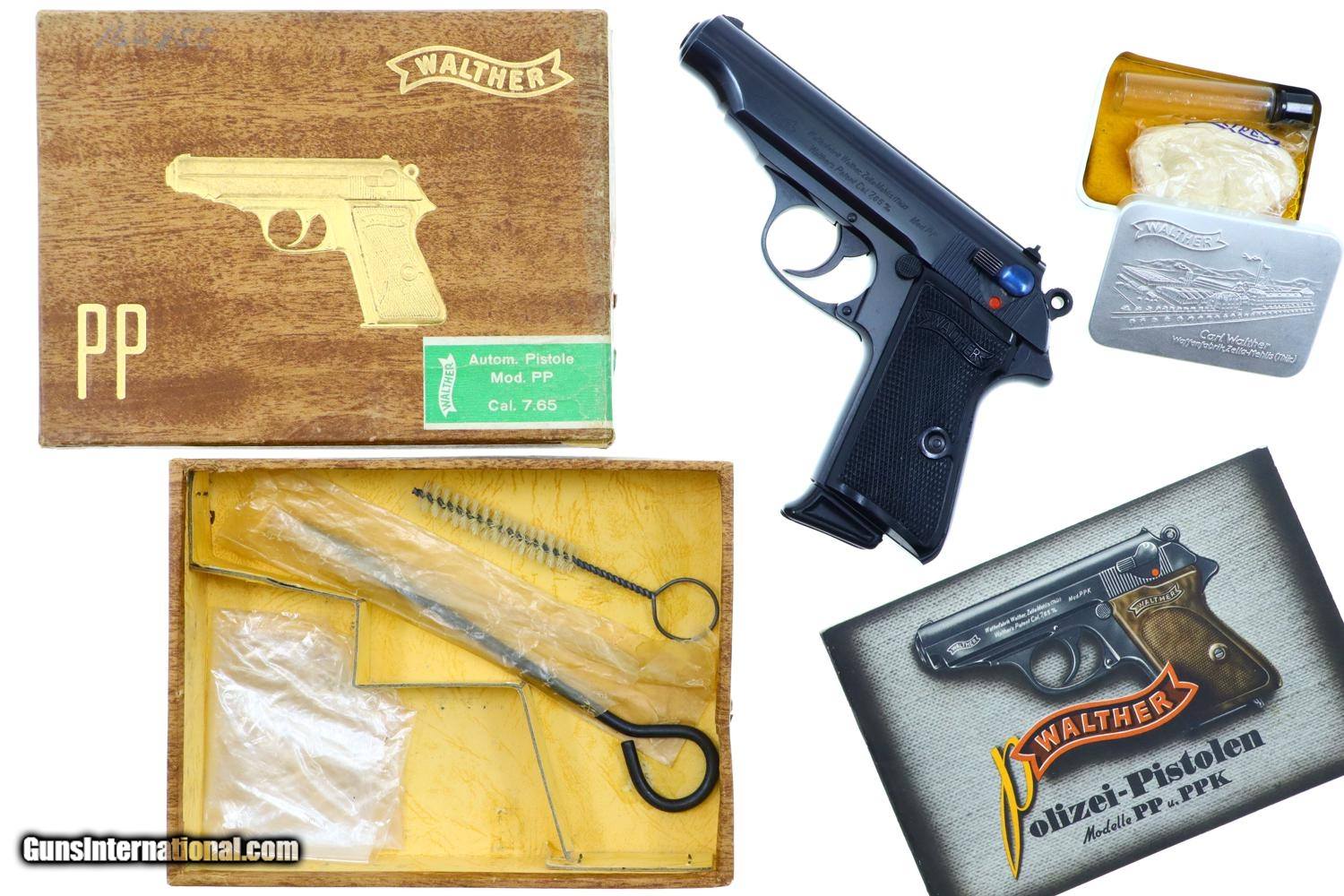 Standard configuration Walther PP, 7.65mm, with fixed front sight, drift adjustable rear sight. Loaded indicator. Left side of slide with usual Walther address reflecting manufacturer, model, and caliber. Full serial number on right side of frame. Eagle/N proofing on exposed barrel boss, right side of matching slide (hand scribed with last three digits of SN). Standard black plastic grips and original magazine, with a black finger extension, marked with the Walther banner on the left side. Complete with correct instruction booklet, factory tin with cleaning implements, two cleaning rods, and matching shipping box that reflects the loaded indicator.
