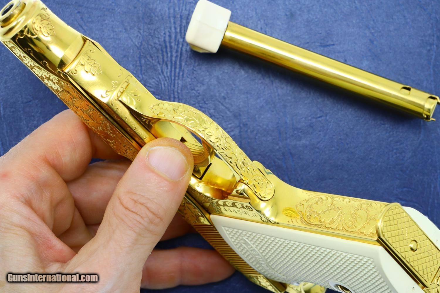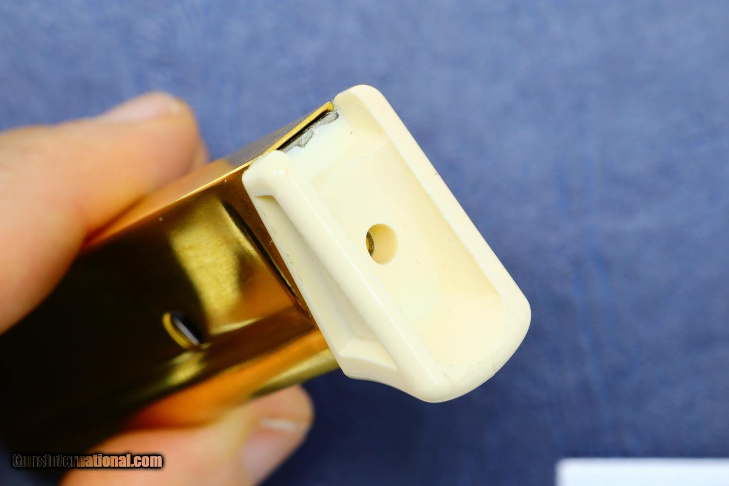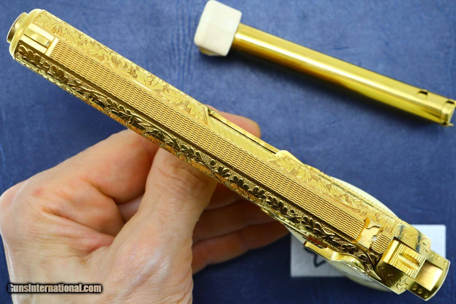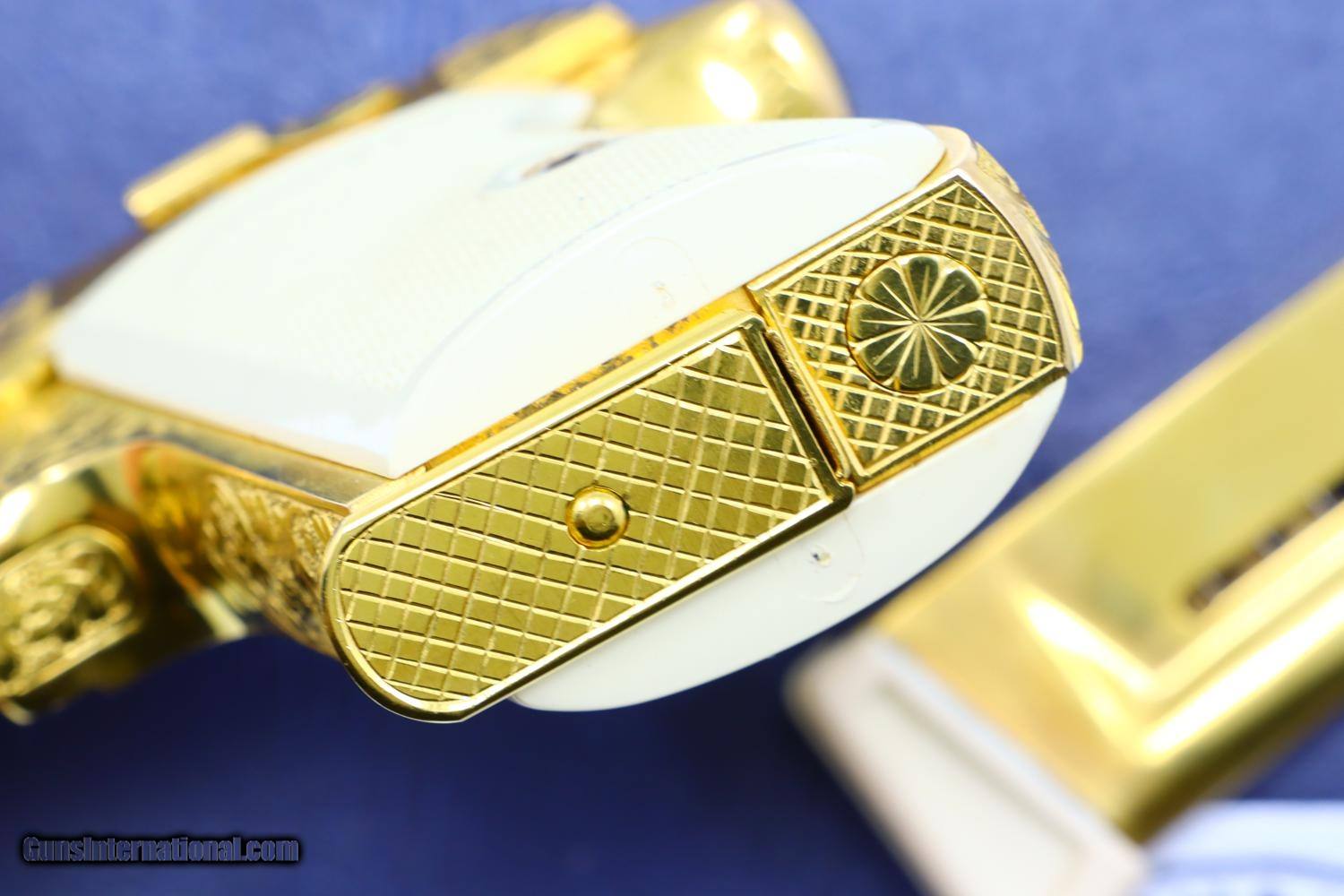 Very scarce Postwar Walther PP, factory engraved and gold plated, in presentation case. Standard foliate engraving with matted background, crosshatching over exposed chamber and bottom of magazine floorplate. Left side of slide with the usual Walther banner, model and caliber. Coded manufacturing date "HI" on exposed chamber. Full serial number on right side of slide and frame. Discrete import mark on butt under magazine floorplate. Ivory/White checkered 2 piece grips and ivory colored spare magazine extension. Each of the gold plated magazines are unmarked with an indicator slot on the right side. The floorplate has crosshatched engraving, complimenting the pattern on the exposed chamber. Complete with blue leatherette presentation case, silvered Walther banner on the lid. Burgundy velour base and single chrome plated clasp securement.